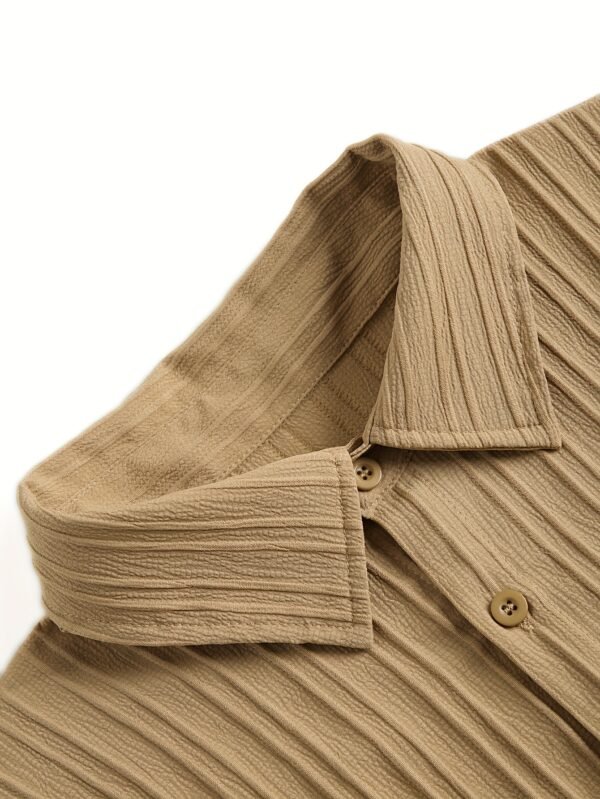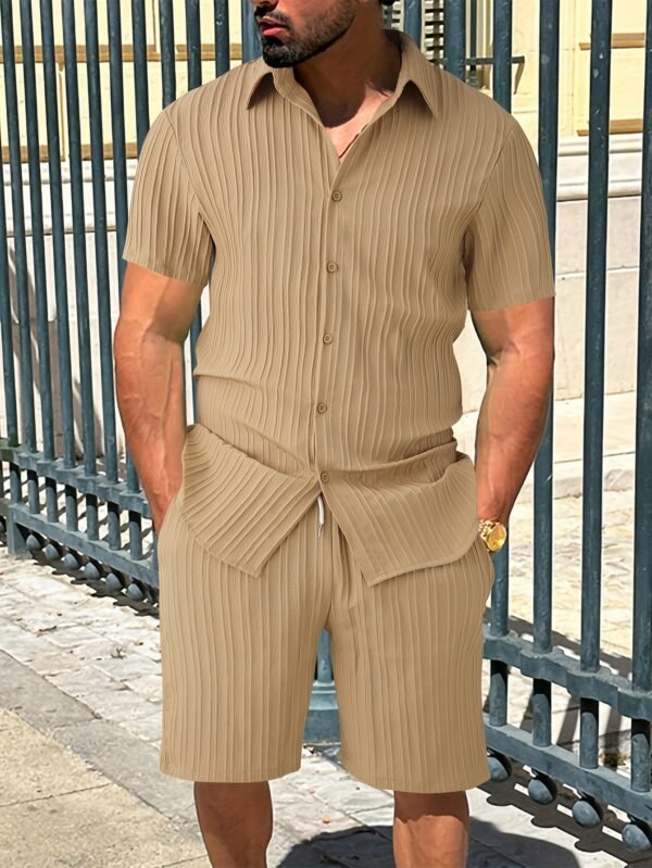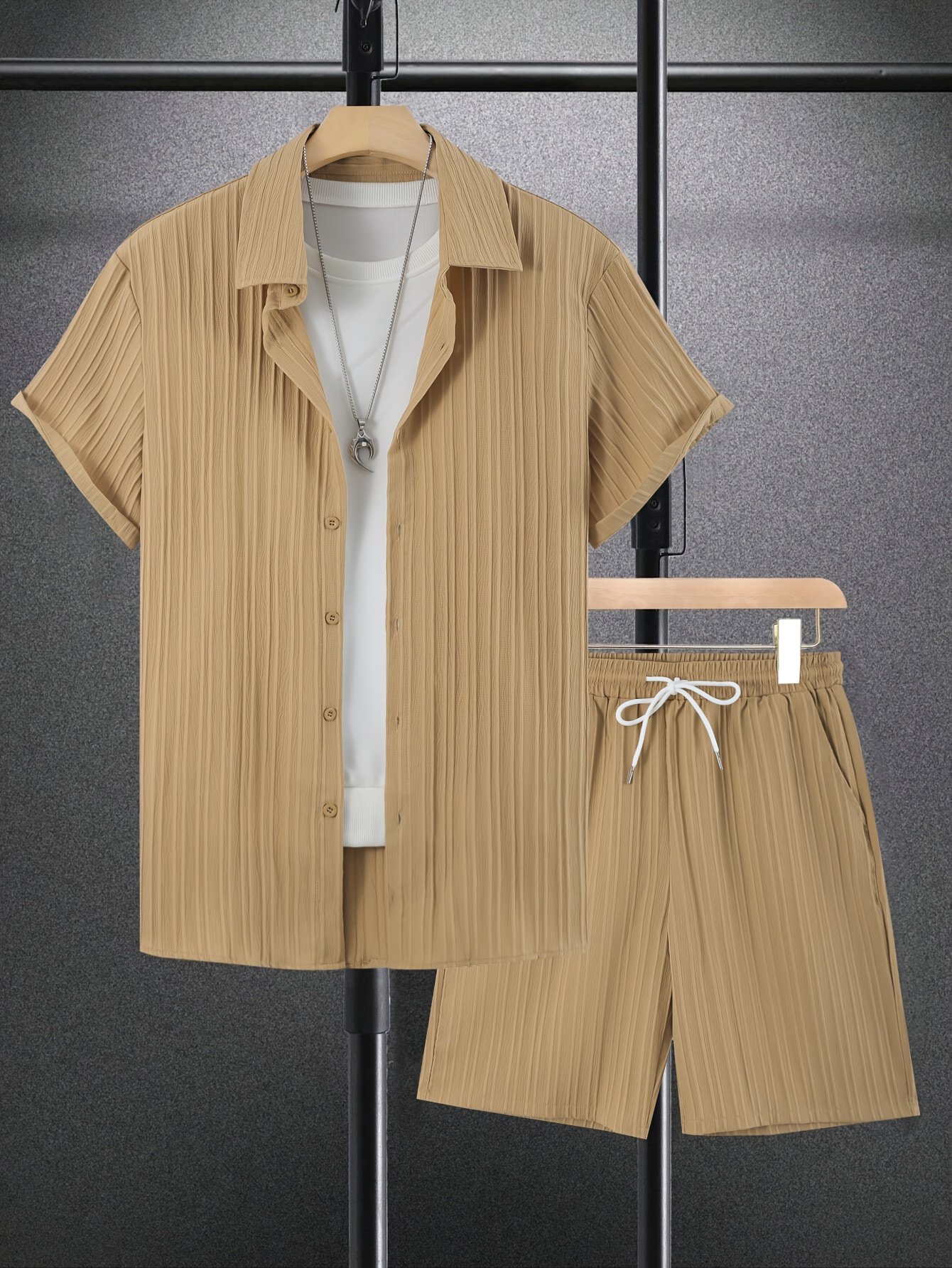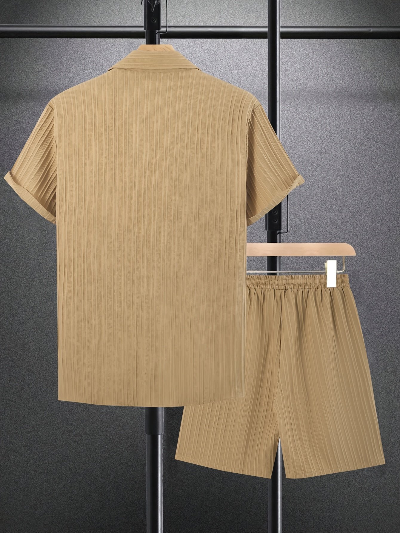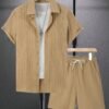 Ensemble short 2 pièces décontracté pour homme avec texture ondulée – Beige Polyester, Chemise à manches courtes et short, Design boutonné, Coupe régulière, Tenue décontractée | Short texturé | Tissu polyester