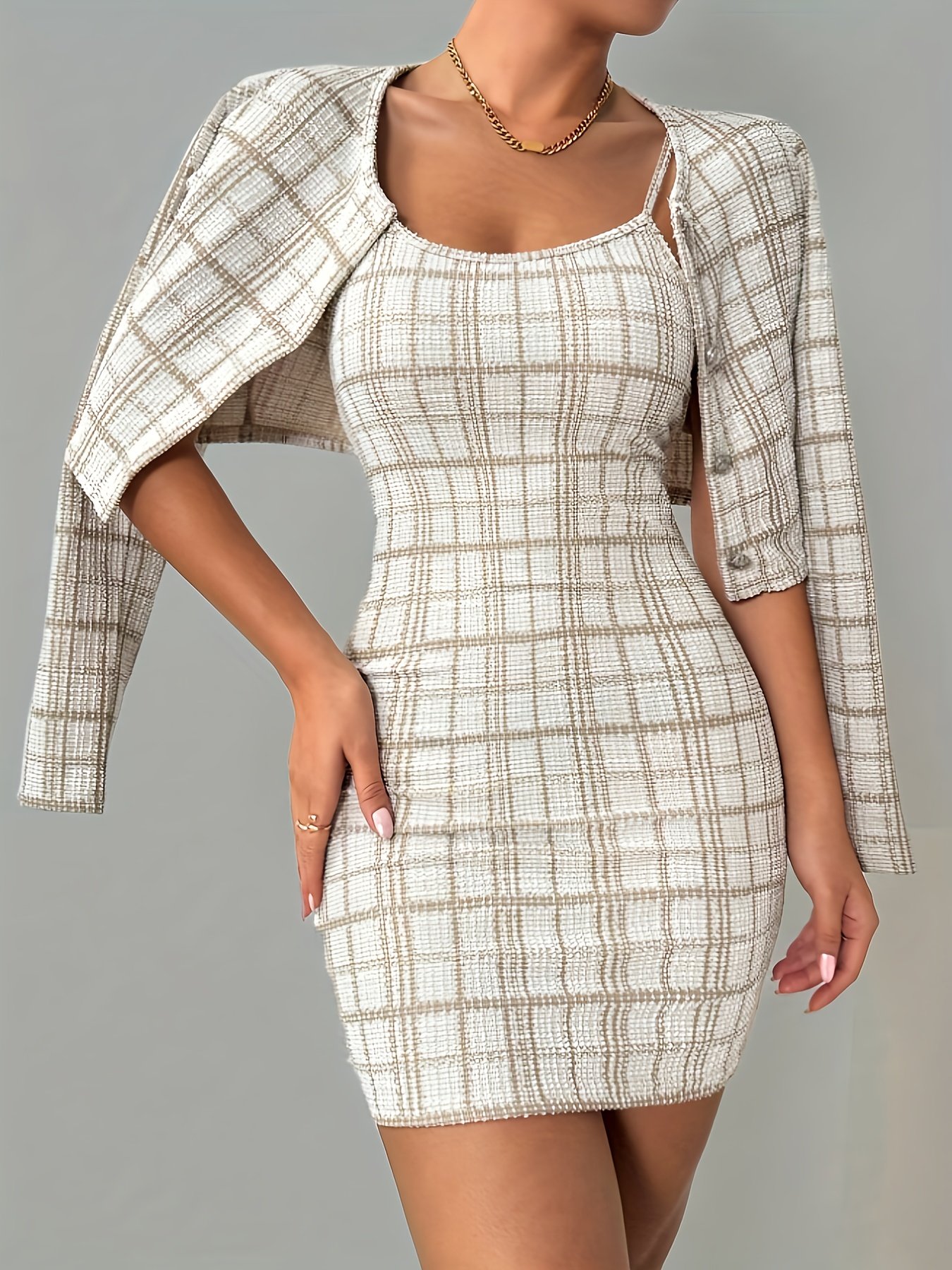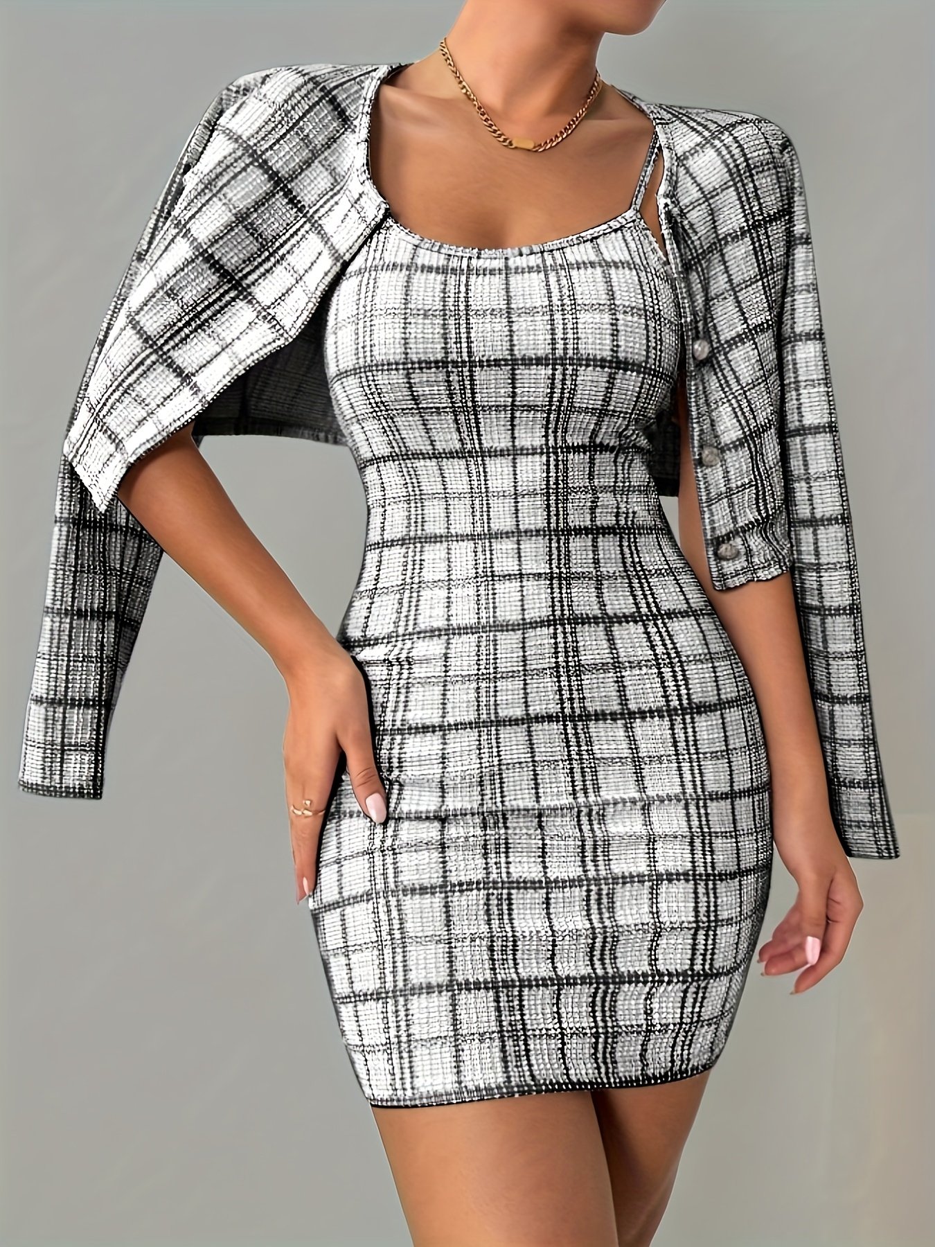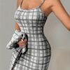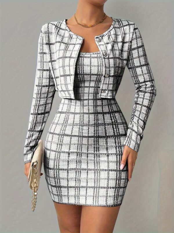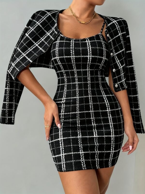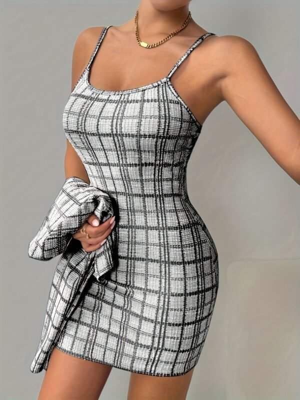 Ensemble Veste à Manches Longues à Carreaux et Robe Camisole Courte