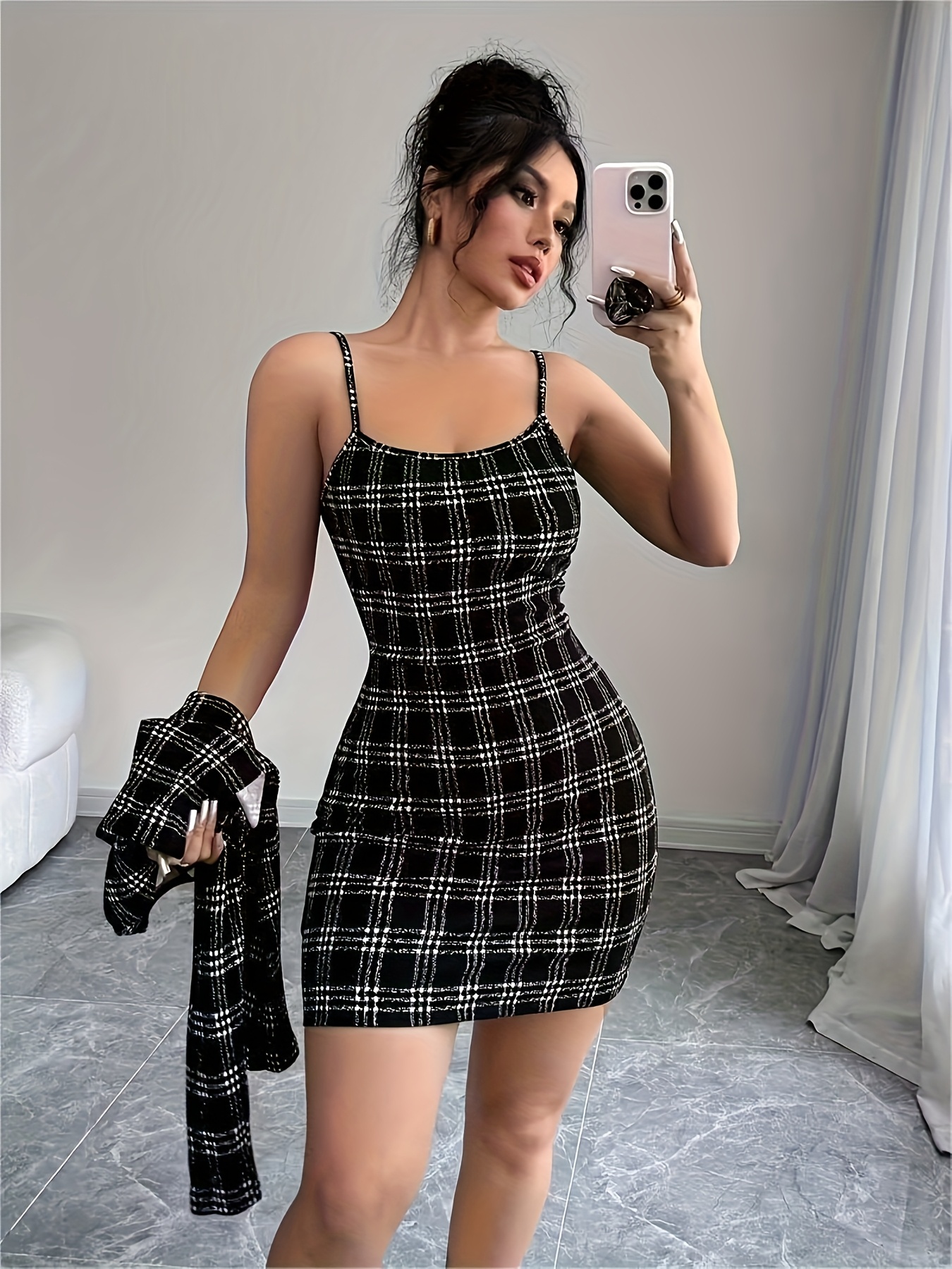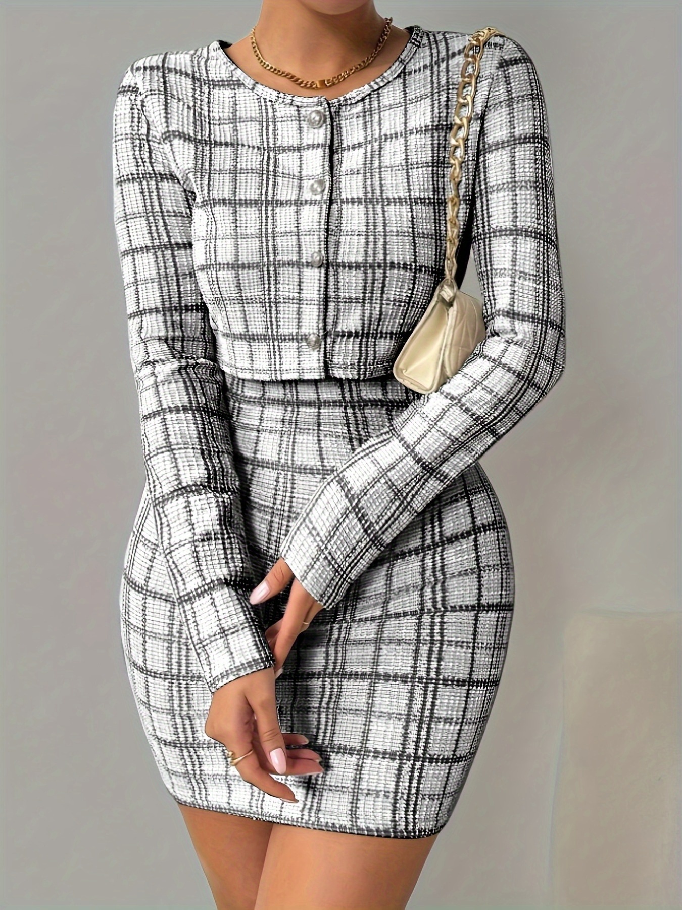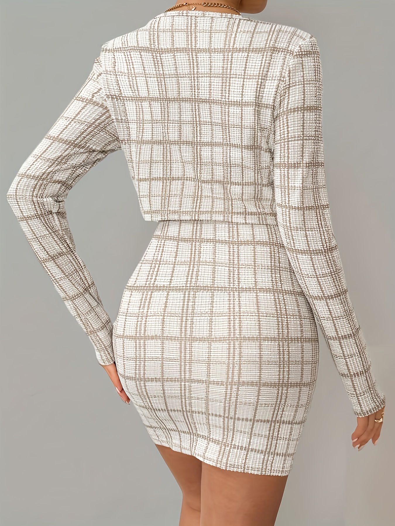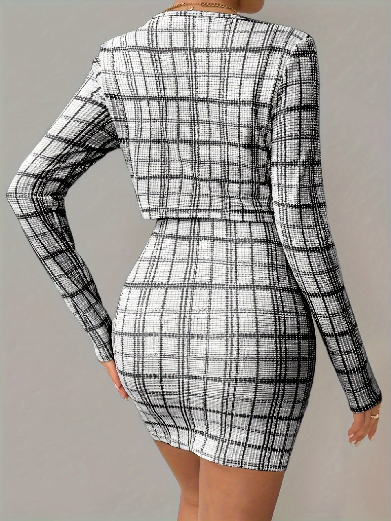Ensemble Veste à Manches Longues à Carreaux et Robe Camisole Courte