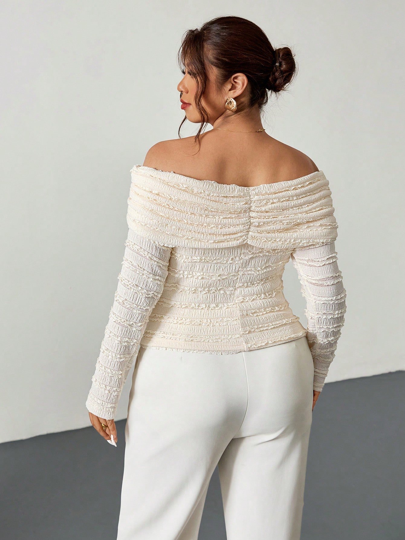 T-shirt élastique à manches longues texture froissée, épaules dénudées