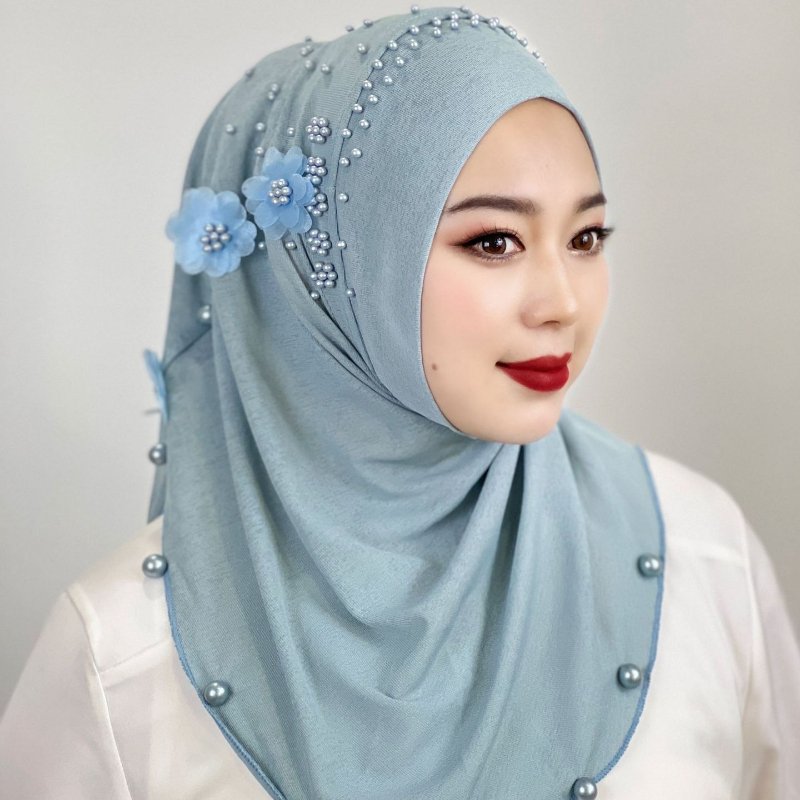 Foulard-Chapeau Malaisien pour Femme Transfrontalier avec Broderie Perlée et Florale, Bonnet Pull Ethnique Élastique de Couleur Unie, en Stock Vente en Gros