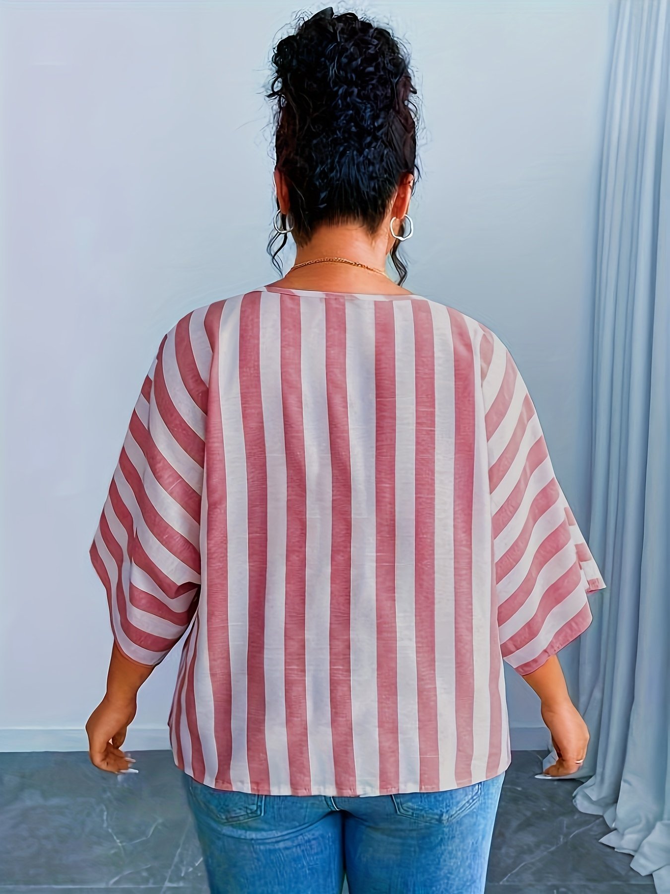 Grande Taille – Chemise à Rayures Décontractée et Ample à Manches Raglan et Col en V pour Grande Taille, Idéale pour les Vacances de Printemps et d'Été et au Quotidien pour Femmes