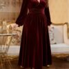 Grande Taille – Élégante Robe en Velours Évasée avec Manches Lanternes | Col en V, Jupe Évasée
