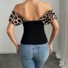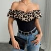 Haut élégant à imprimé léopard pour femme avec détails à volants – Design patchwork noir et beige, parfait pour le printemps et l’été, tenue décontractée | Haut à volants | Design sans bretelles