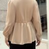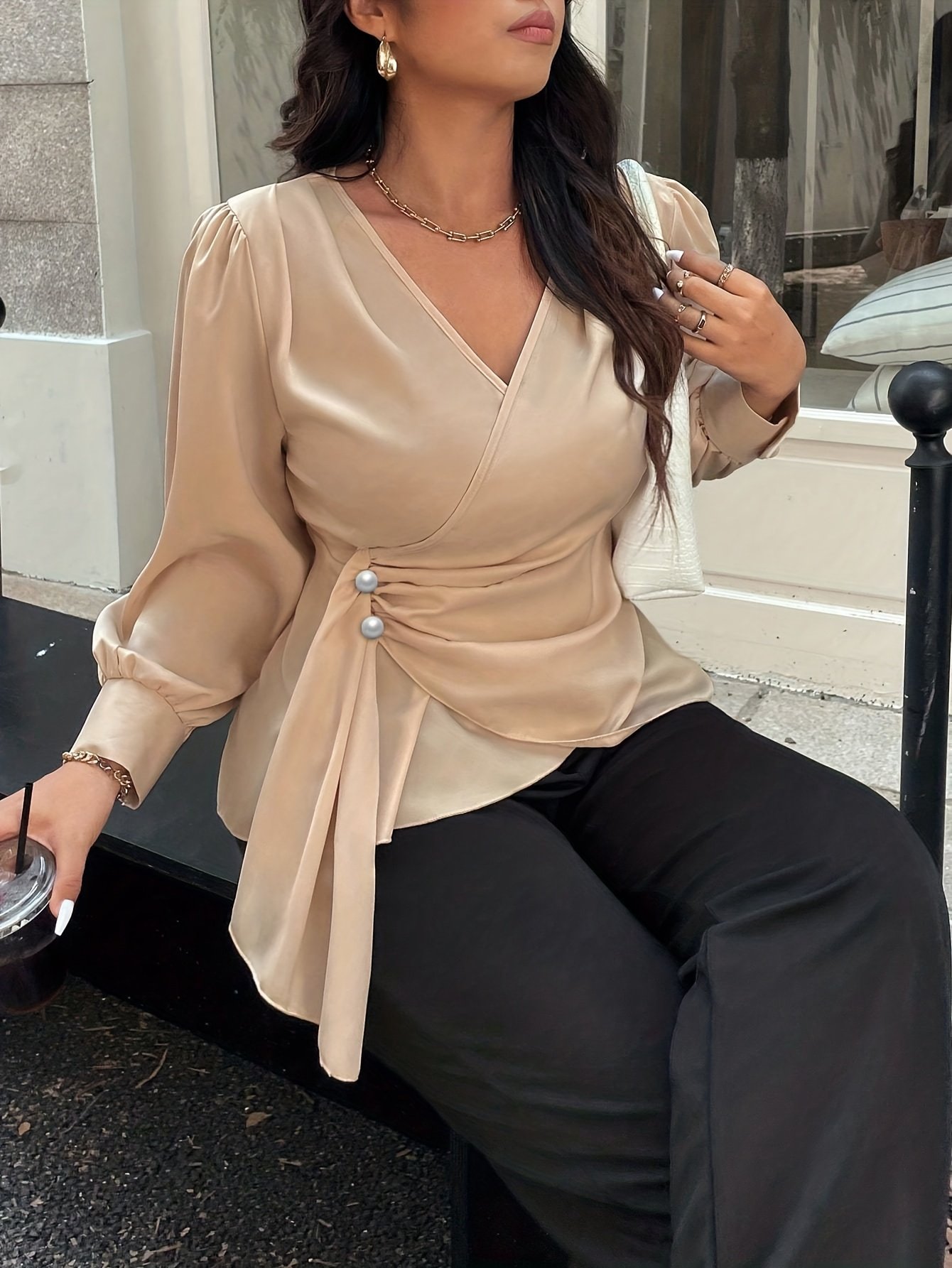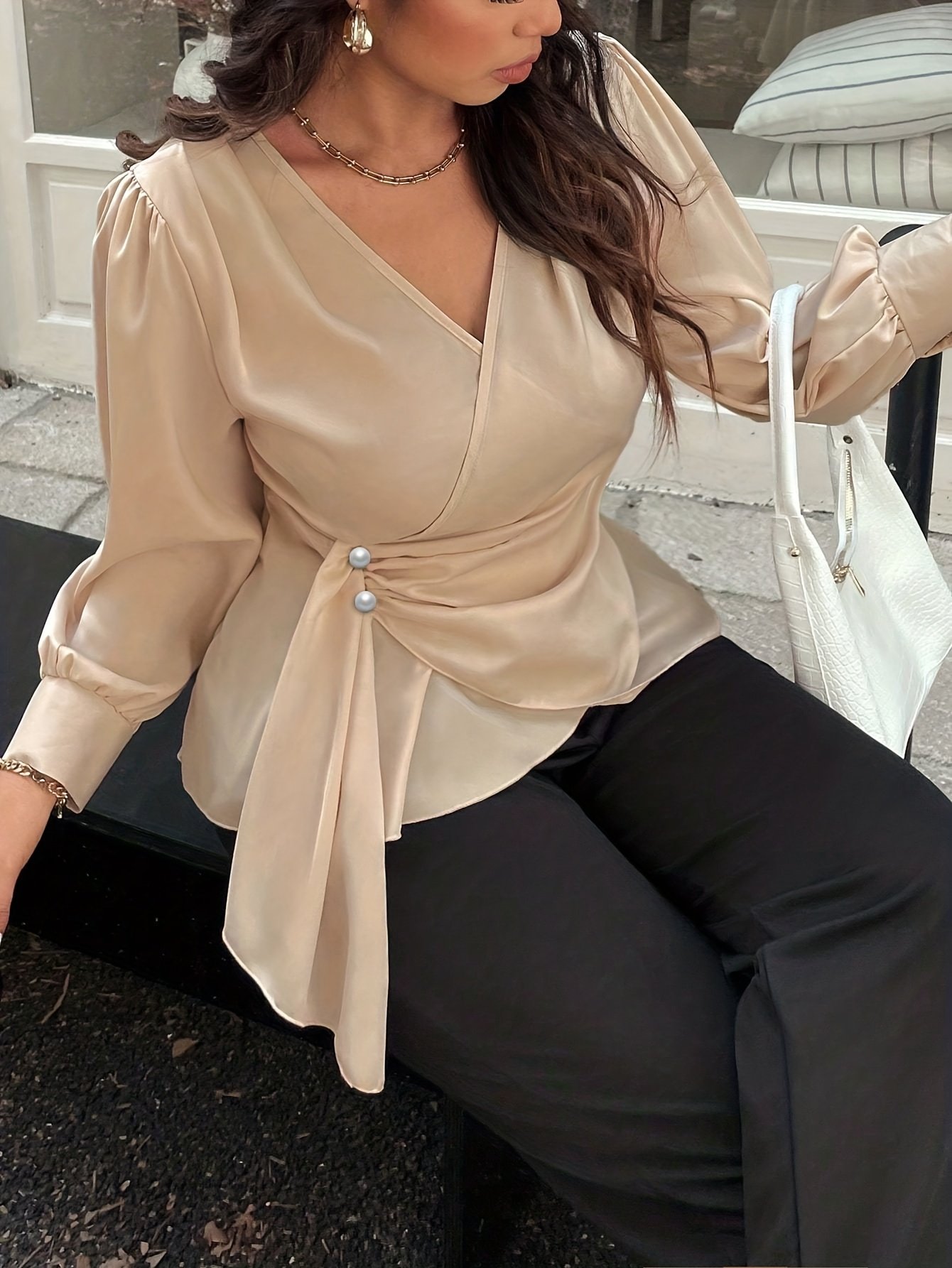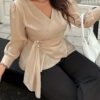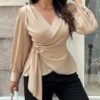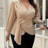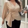 Haut élégant à manches longues, col en V et enveloppant, taille plus