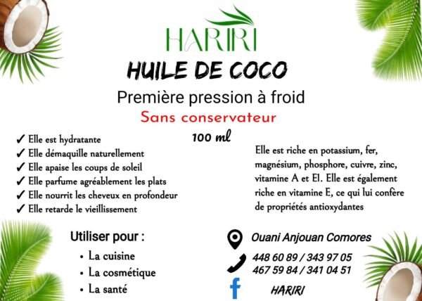Découvrez l’huile de coco HARIRI, extraite par première pression à froid, 100% pure et sans conservateur. Véritable trésor naturel, cette huile polyvalente s’invite aussi bien dans votre cuisine que dans votre routine beauté et bien-être.
