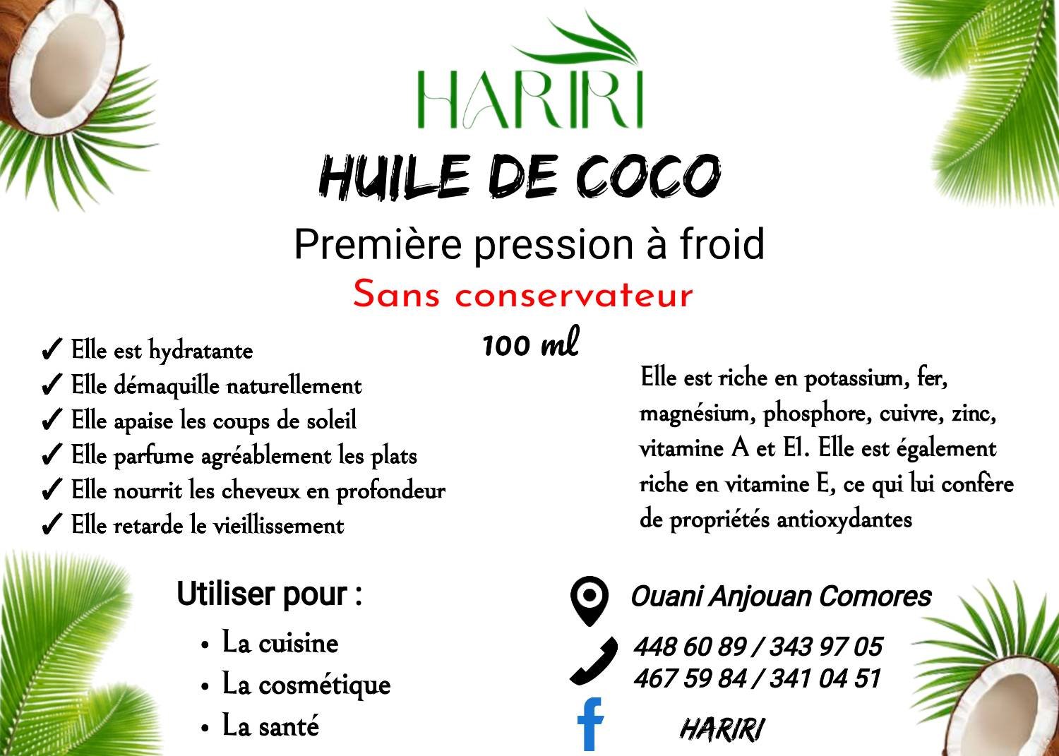 Découvrez l’huile de coco HARIRI, extraite par première pression à froid, 100% pure et sans conservateur. Véritable trésor naturel, cette huile polyvalente s’invite aussi bien dans votre cuisine que dans votre routine beauté et bien-être.