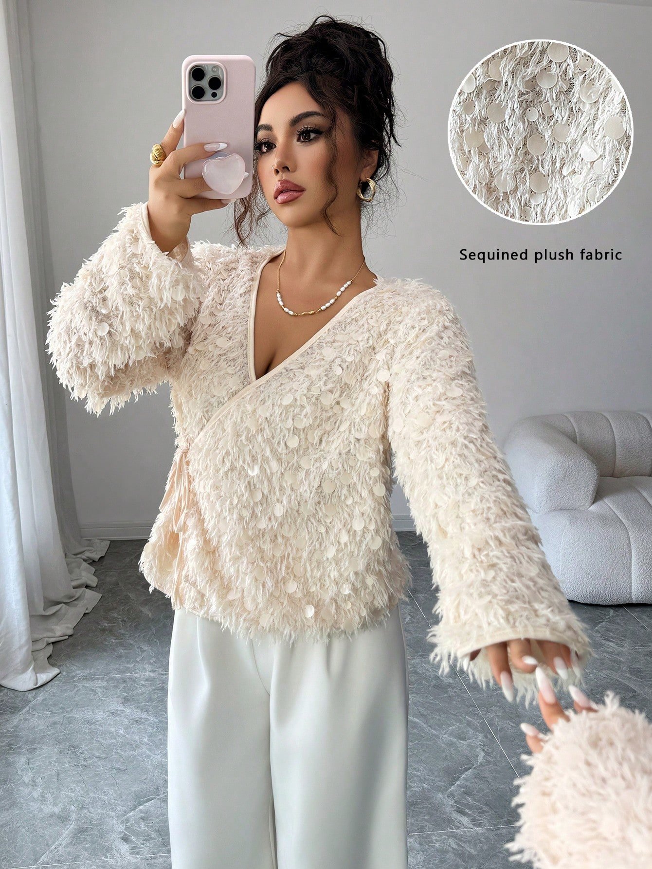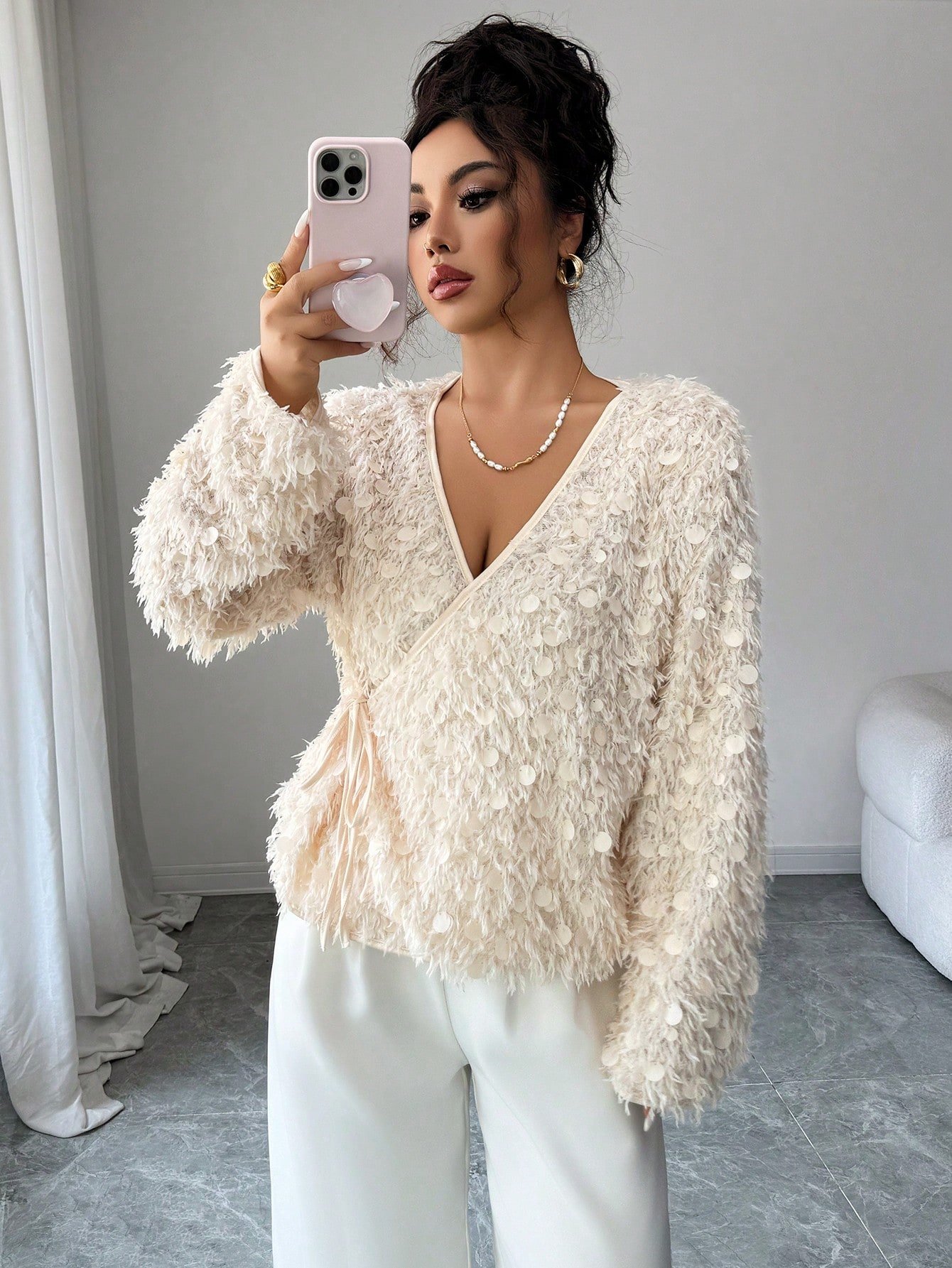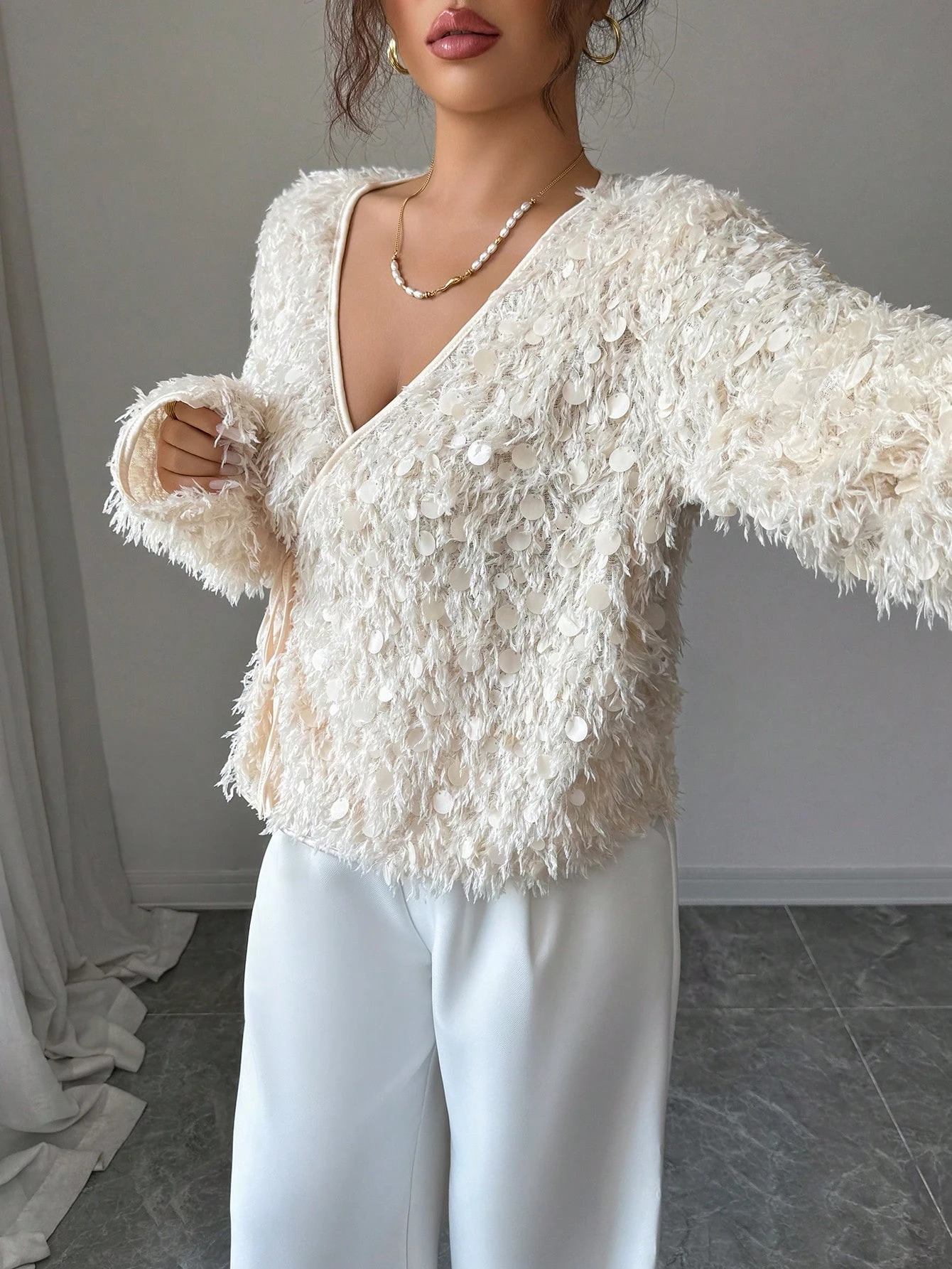 Kimono Style Sequin Wrap Manches Longues Blouse Sequin Ample