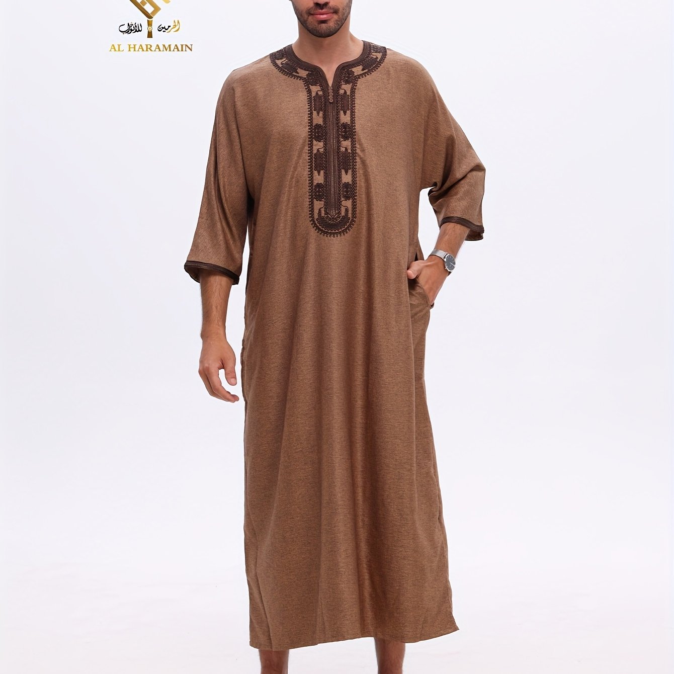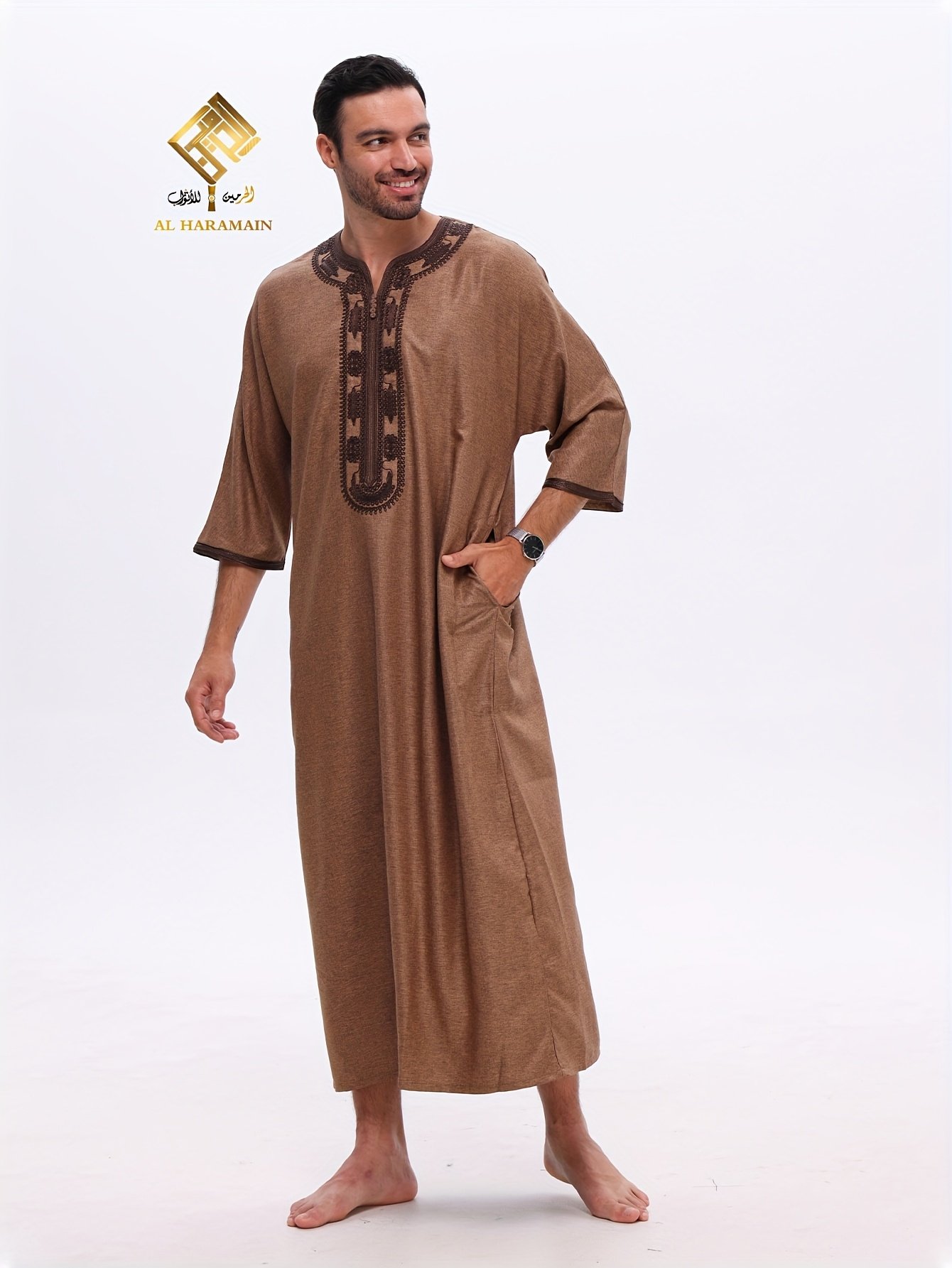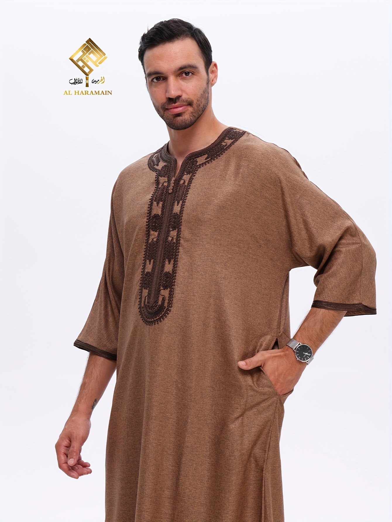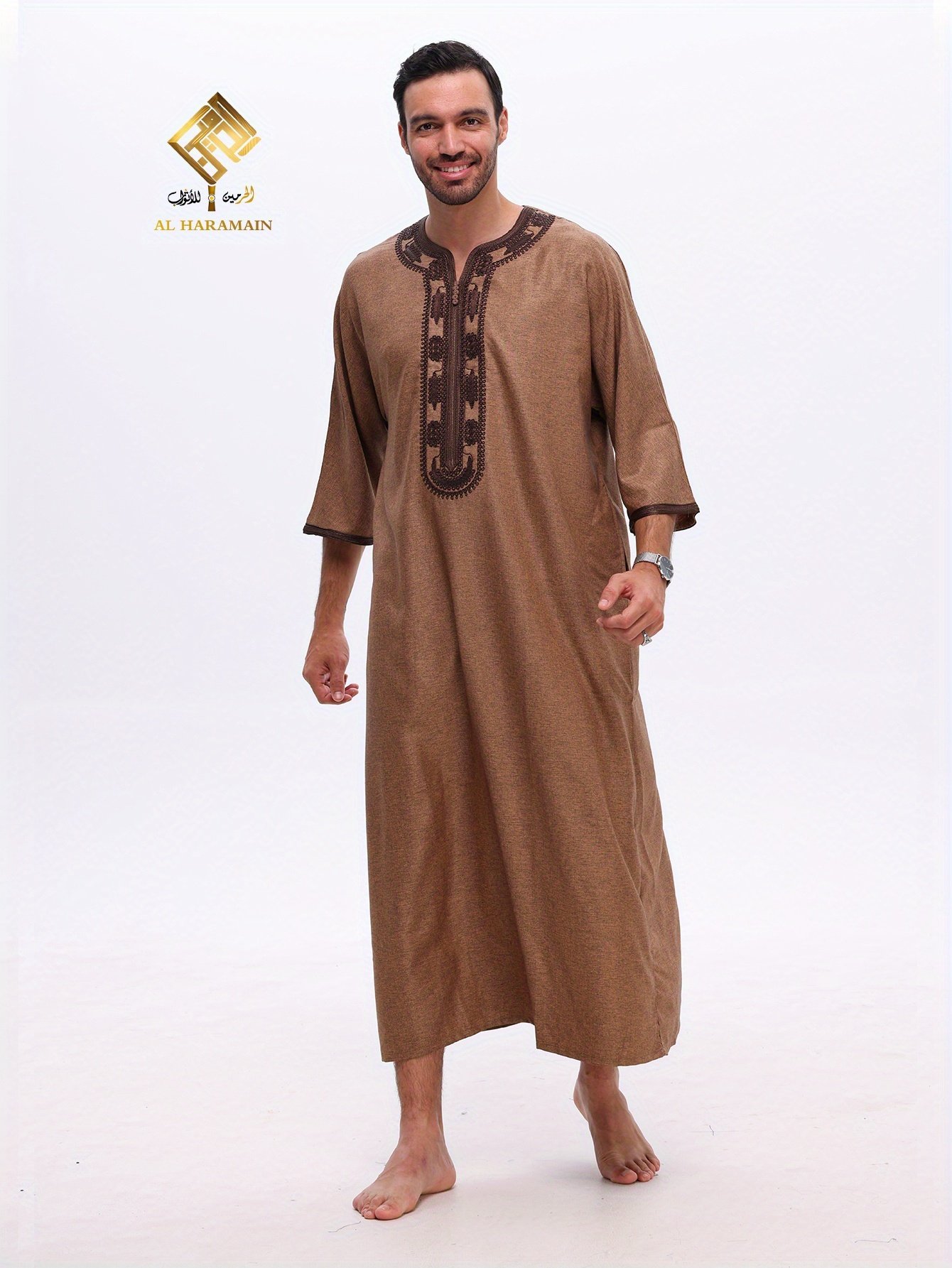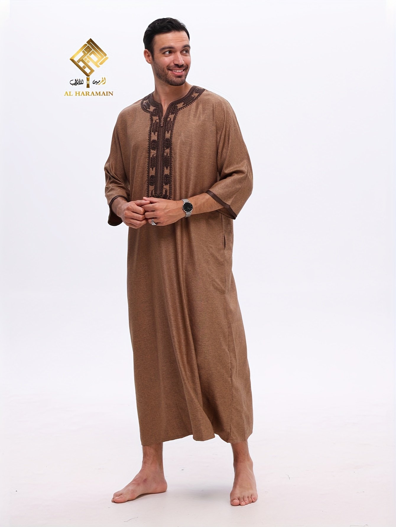 La plus récente robe arabe haut de gamme pour hommes 2025 présente un matériau doux et non pelucheux, des manches trois-quarts élégantes, et convient aux occasions religieuses telles que le Ramadan. Cette élégante robe à manches longues est lavable en mac
