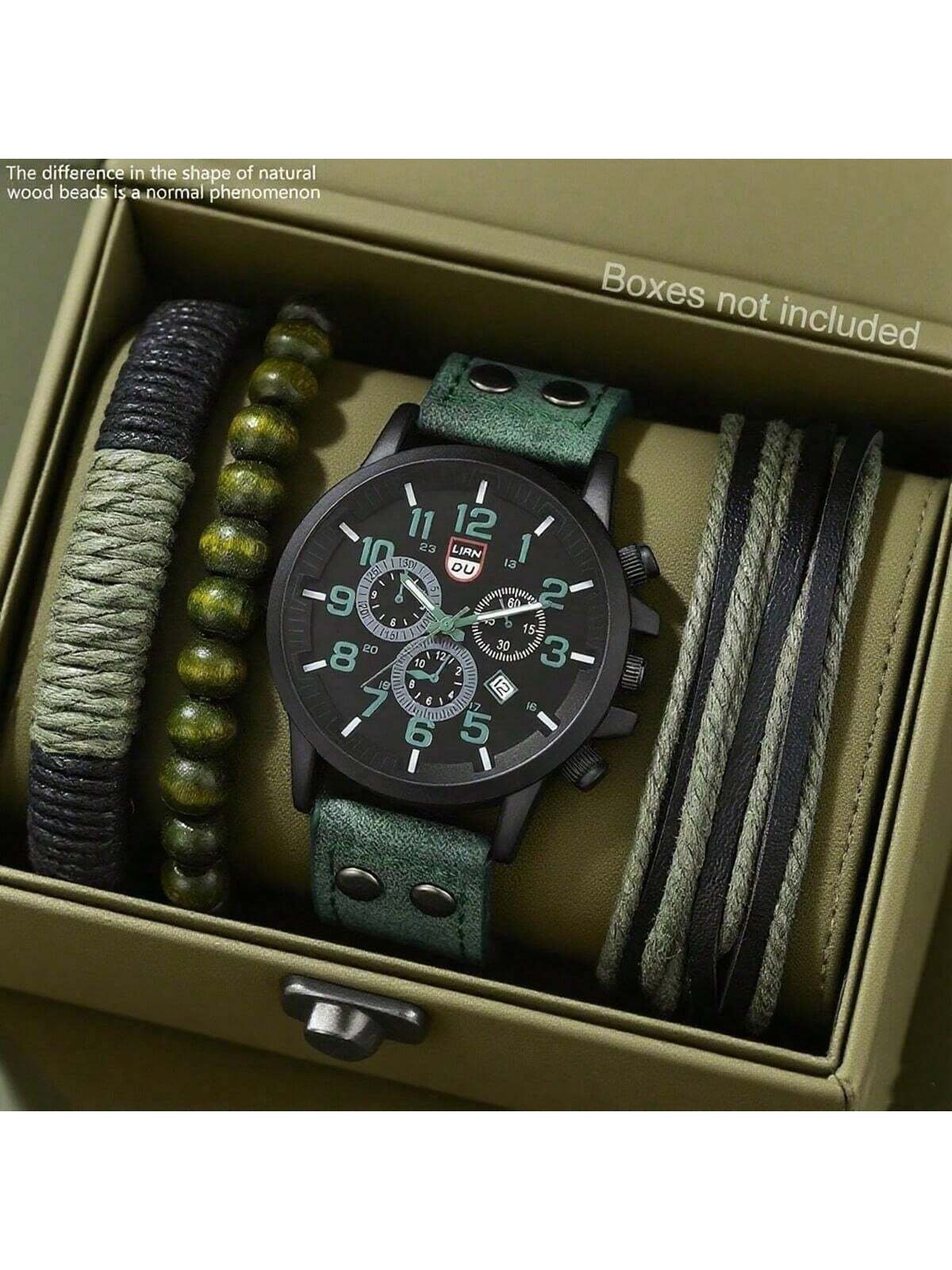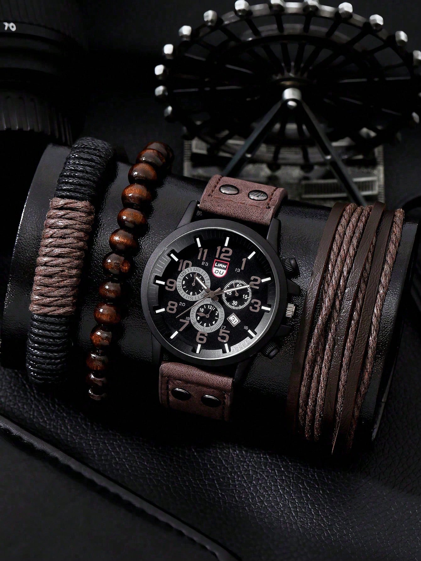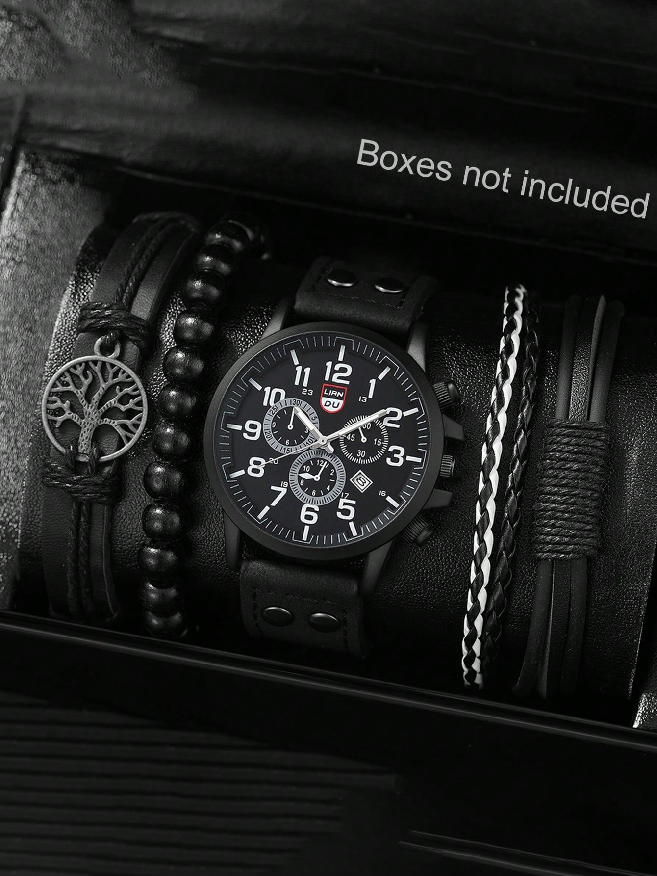 Set Montre pour homme, style sportif et décontracté avec calendrier, cadran rond à chiffres arabes, bracelet en PU, bracelet véritable, ensemble de bracelets style punk, bracelet tressé en PU, convient pour un port quotidien, cadeau d’anniversaire