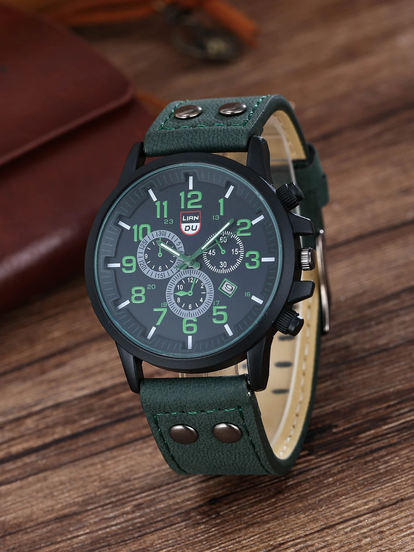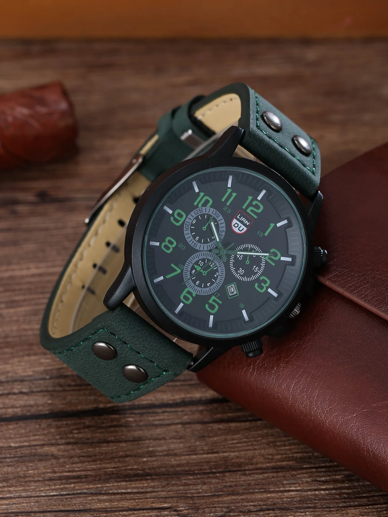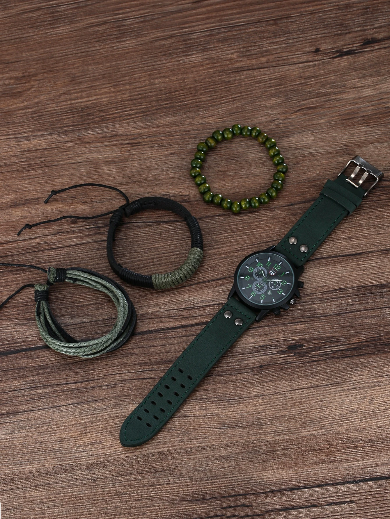 Set Montre pour homme, style sportif et décontracté avec calendrier, cadran rond à chiffres arabes, bracelet en PU, bracelet véritable, ensemble de bracelets style punk, bracelet tressé en PU, convient pour un port quotidien, cadeau d’anniversaire
