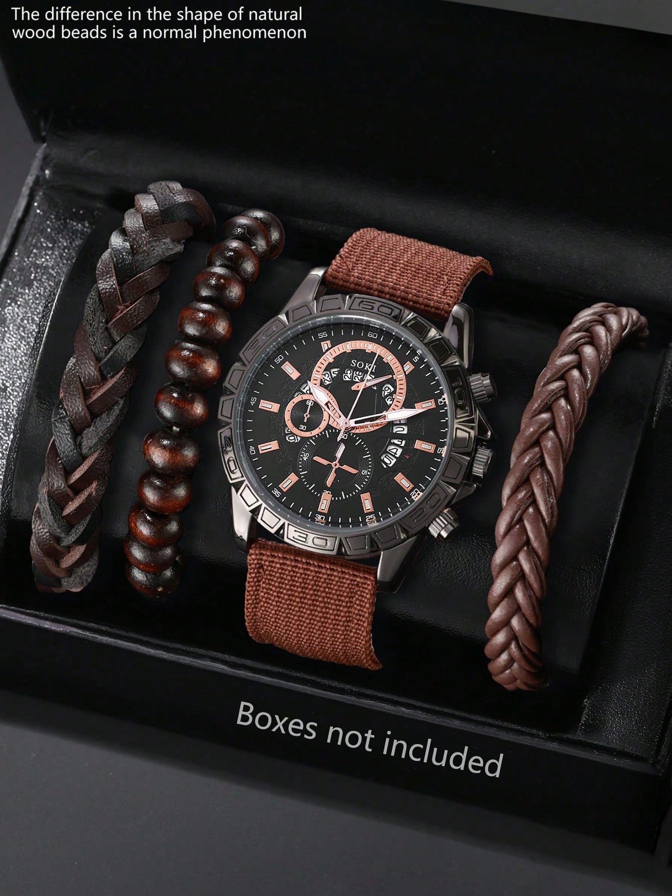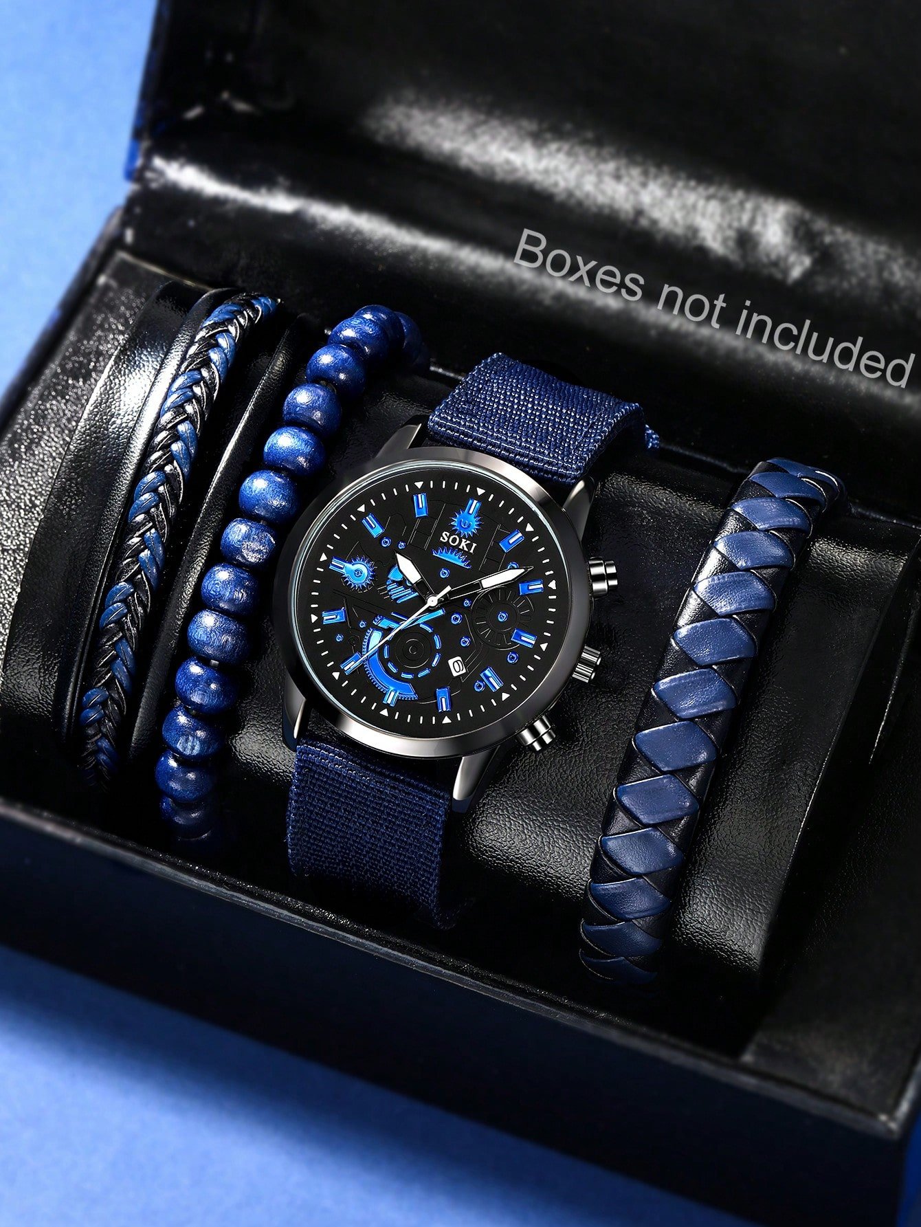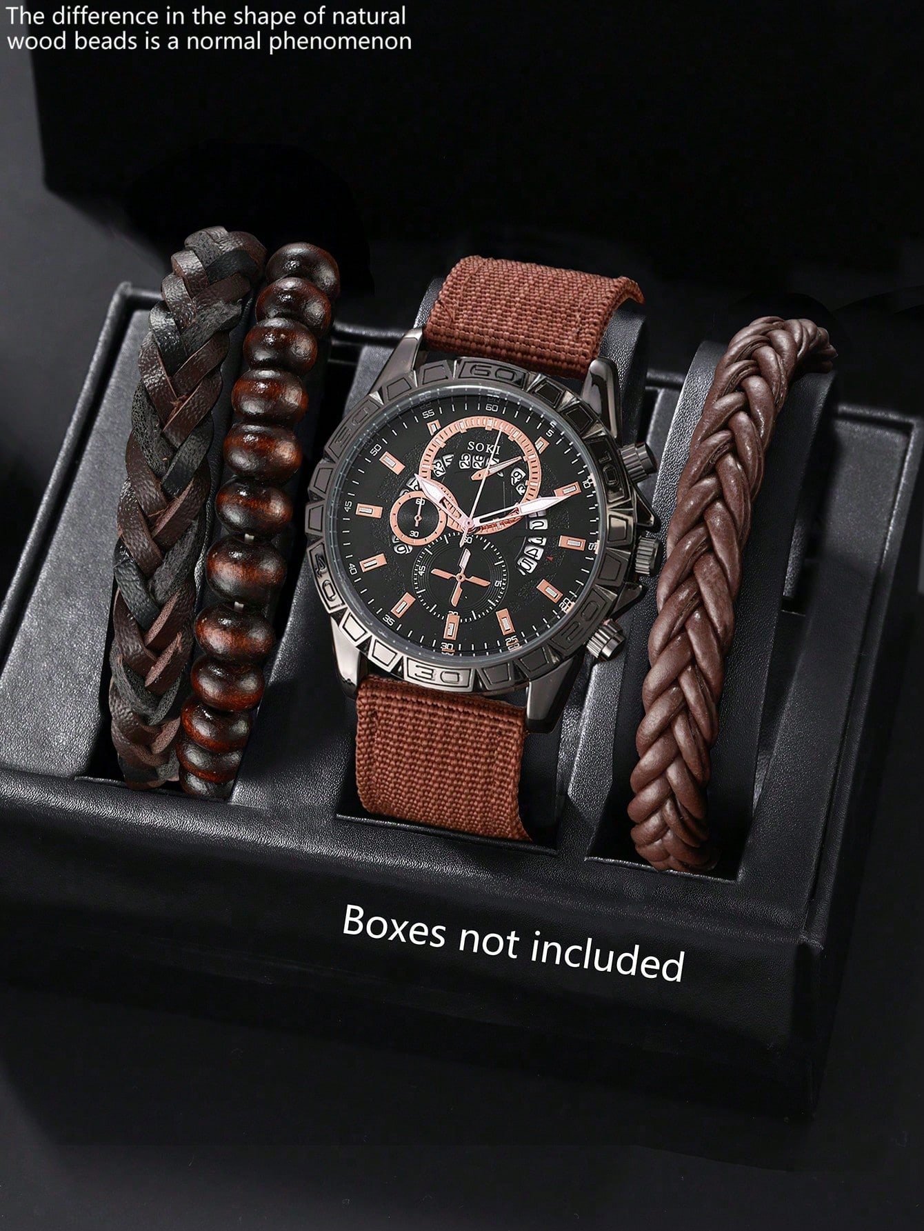 Ensemble de montres pour hommes, comprenant un calendrier, une montre de mode sport casual au style industriel avec cadran rond à quartz et bracelet véritable, un ensemble de bracelets style punk, un bracelet tressé en PU. Convient pour le