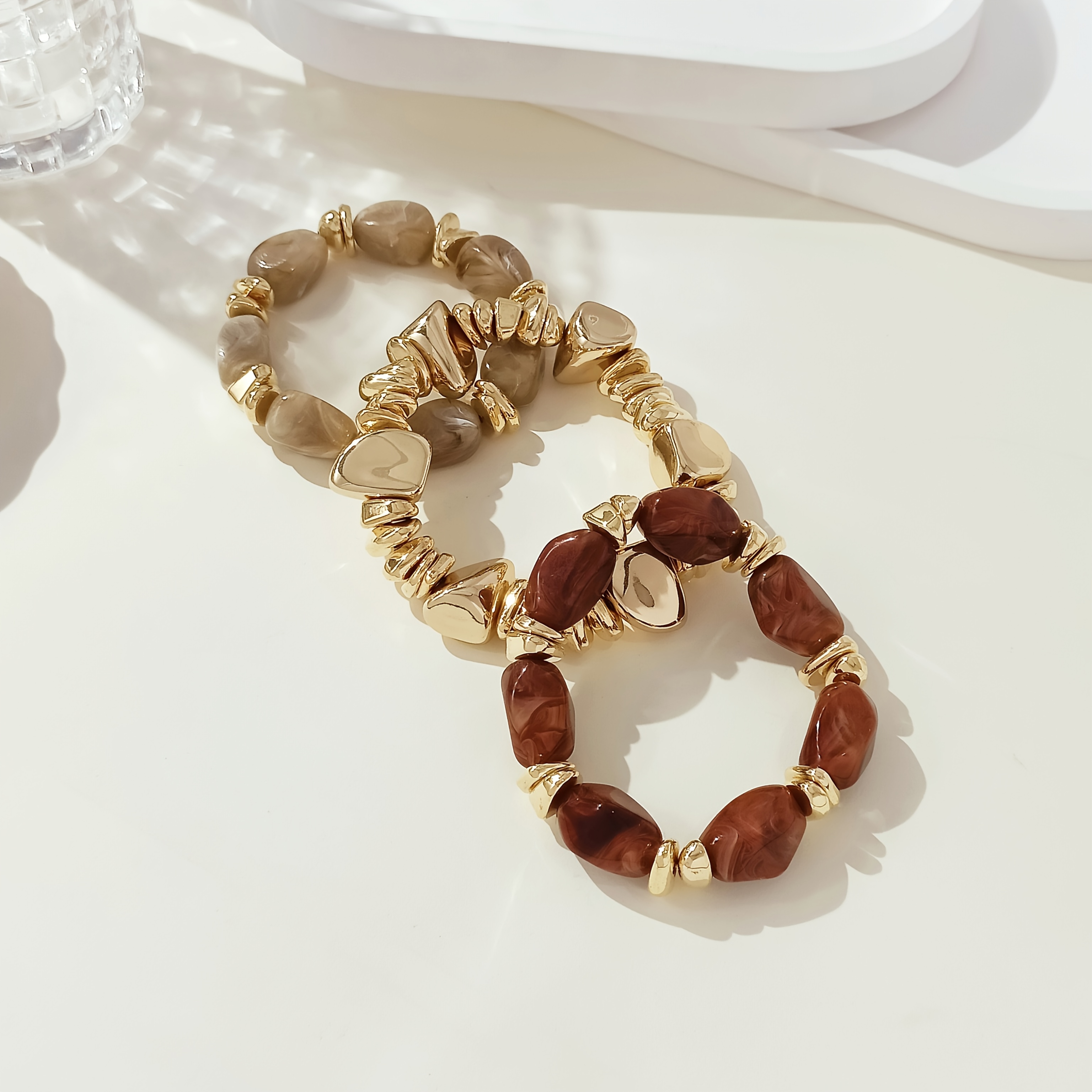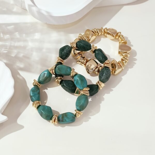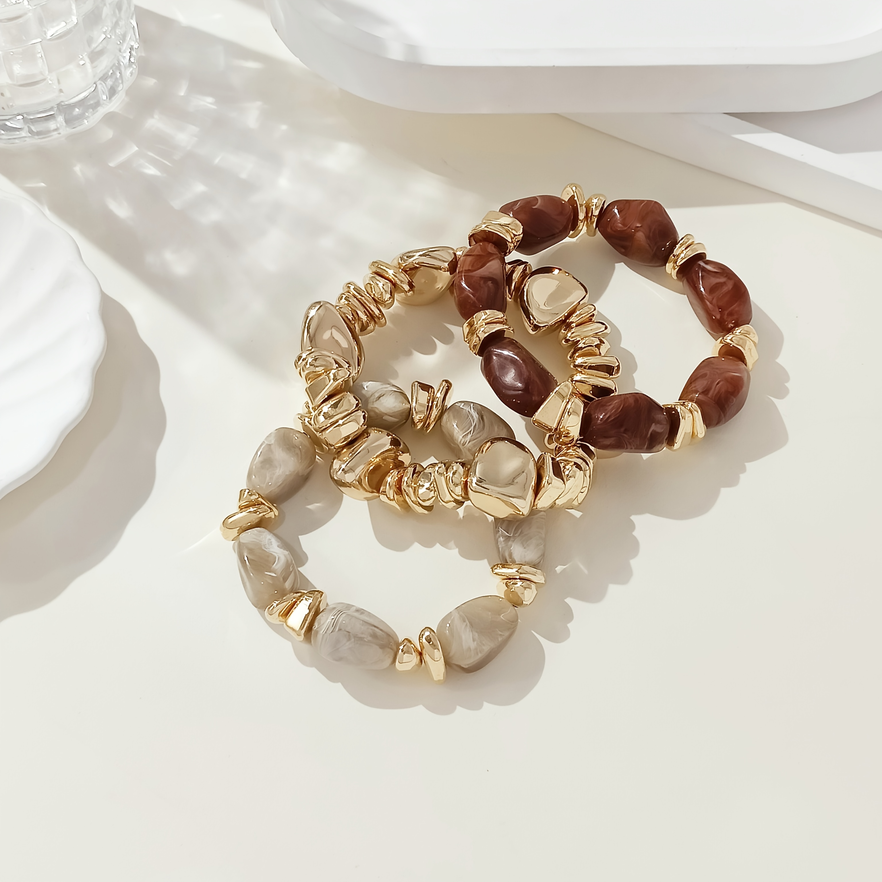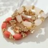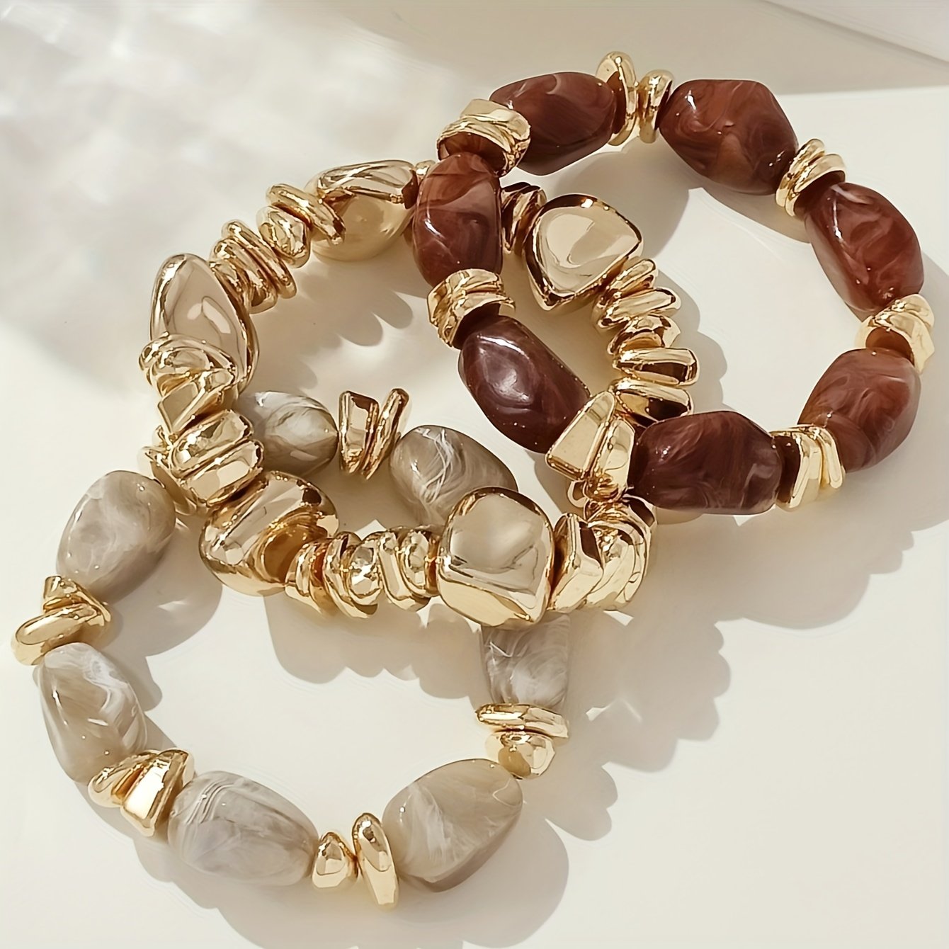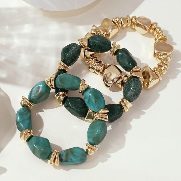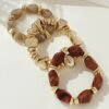 4 avis pour Lot de 3 bracelets bohème rétro avec perles épaisses en acrylique – tons dorés (marron/beige), formes cylindriques et en larme, unisexe pour tenue décontractée, soirées et superposition bohème toute l’année