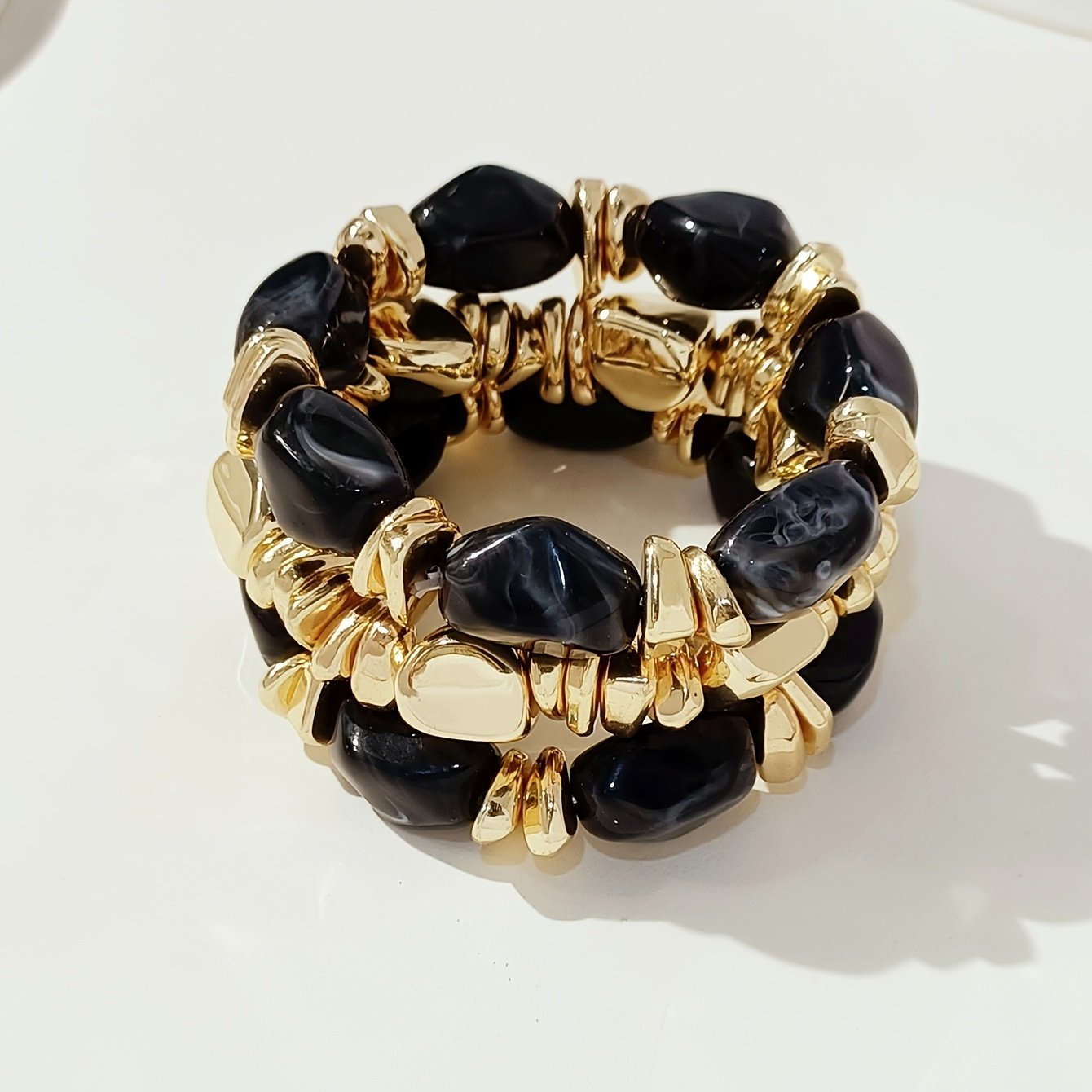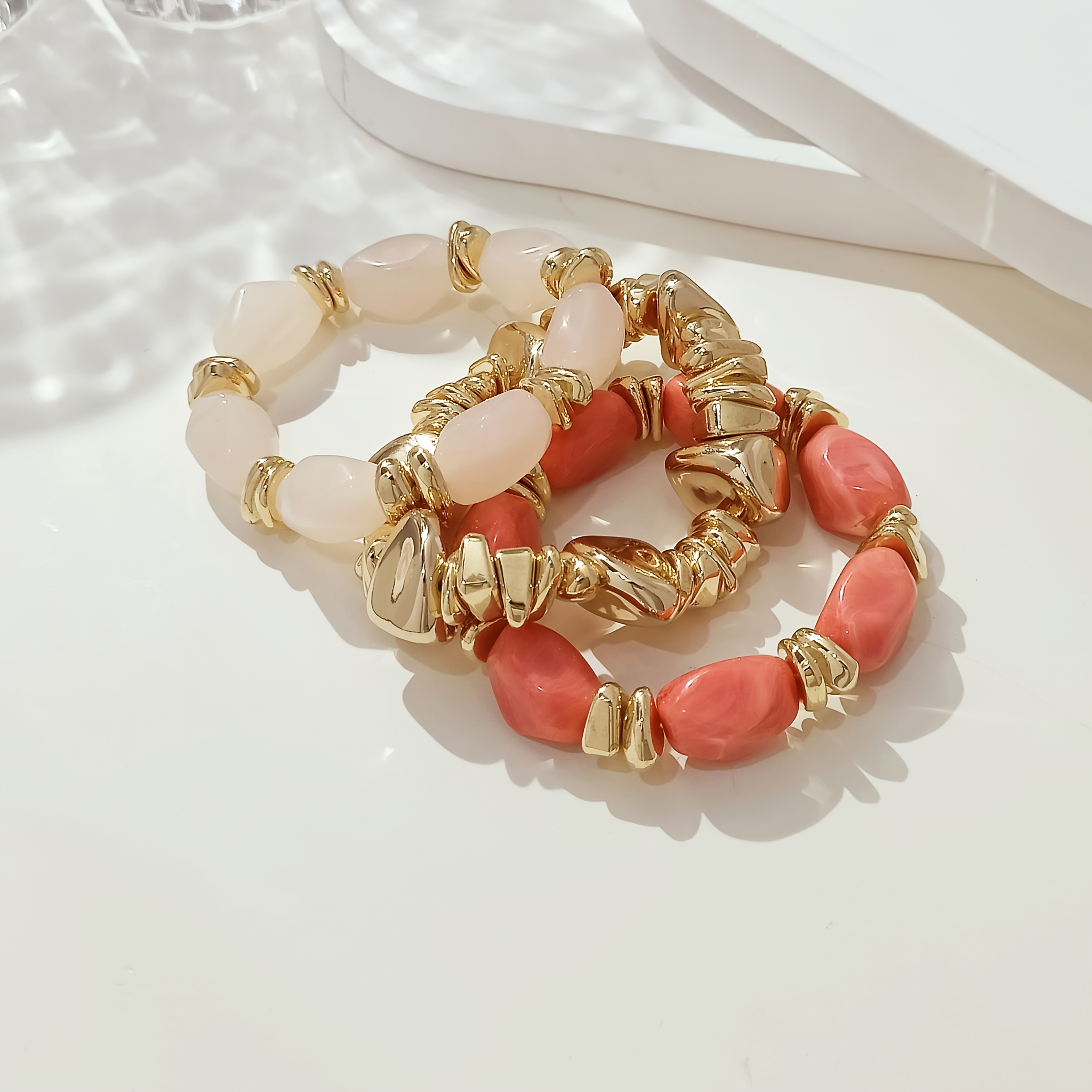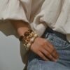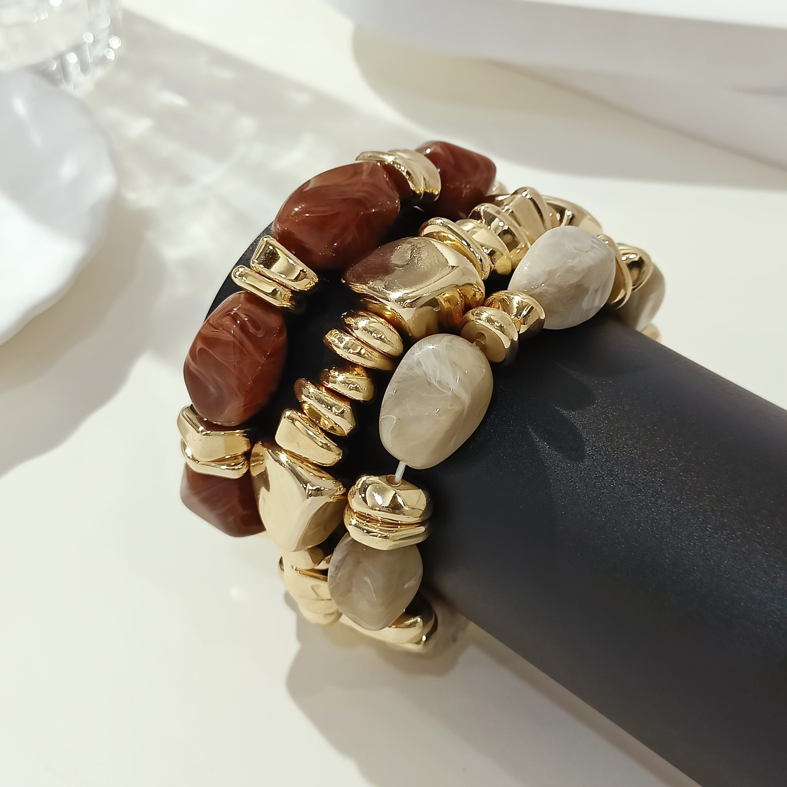 4 avis pour Lot de 3 bracelets bohème rétro avec perles épaisses en acrylique – tons dorés (marron/beige), formes cylindriques et en larme, unisexe pour tenue décontractée, soirées et superposition bohème toute l’année