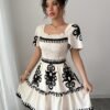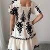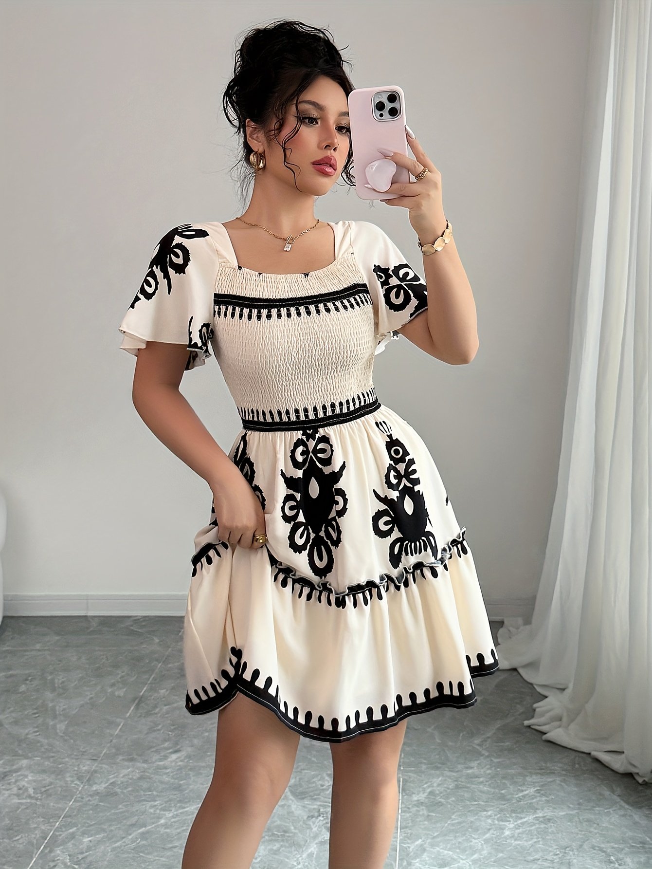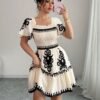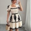 Mini robe élégante à col carré, avec des imprimés à la mode, des plis, une taille cintrée pour un effet amincissant, et des bords à volants avec une ourlet en ligne A.