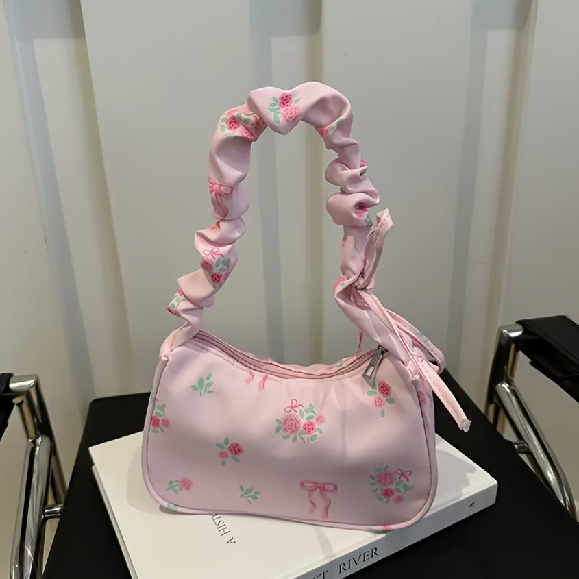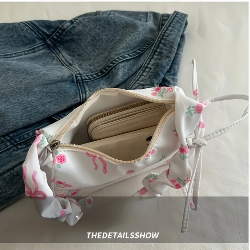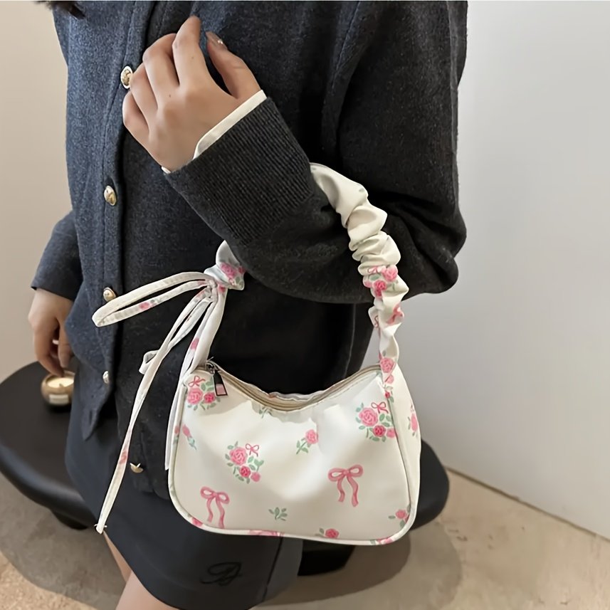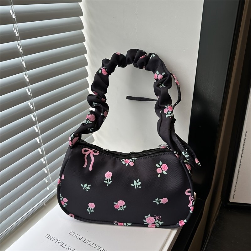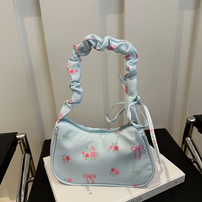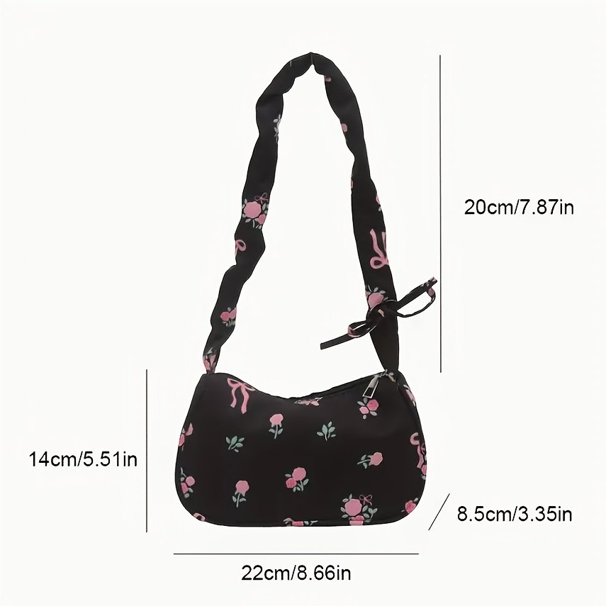 Nouveau Sac Bandoulière Unique, Petit Sac Sous-Bras à Motif Floral, Style Japonais avec Nœud Imprimé et Bandoulière Plissée, Sac à Cordon Doux pour Commuter, Mini Sac à Main, Petit Sac Carré Unique, Léger et Polyvalent pour Femmes, Sac de Voyage Portable
