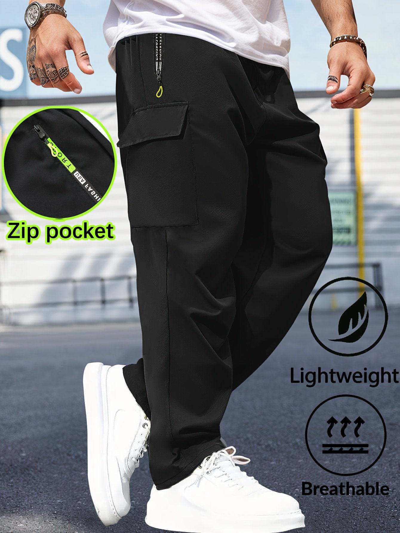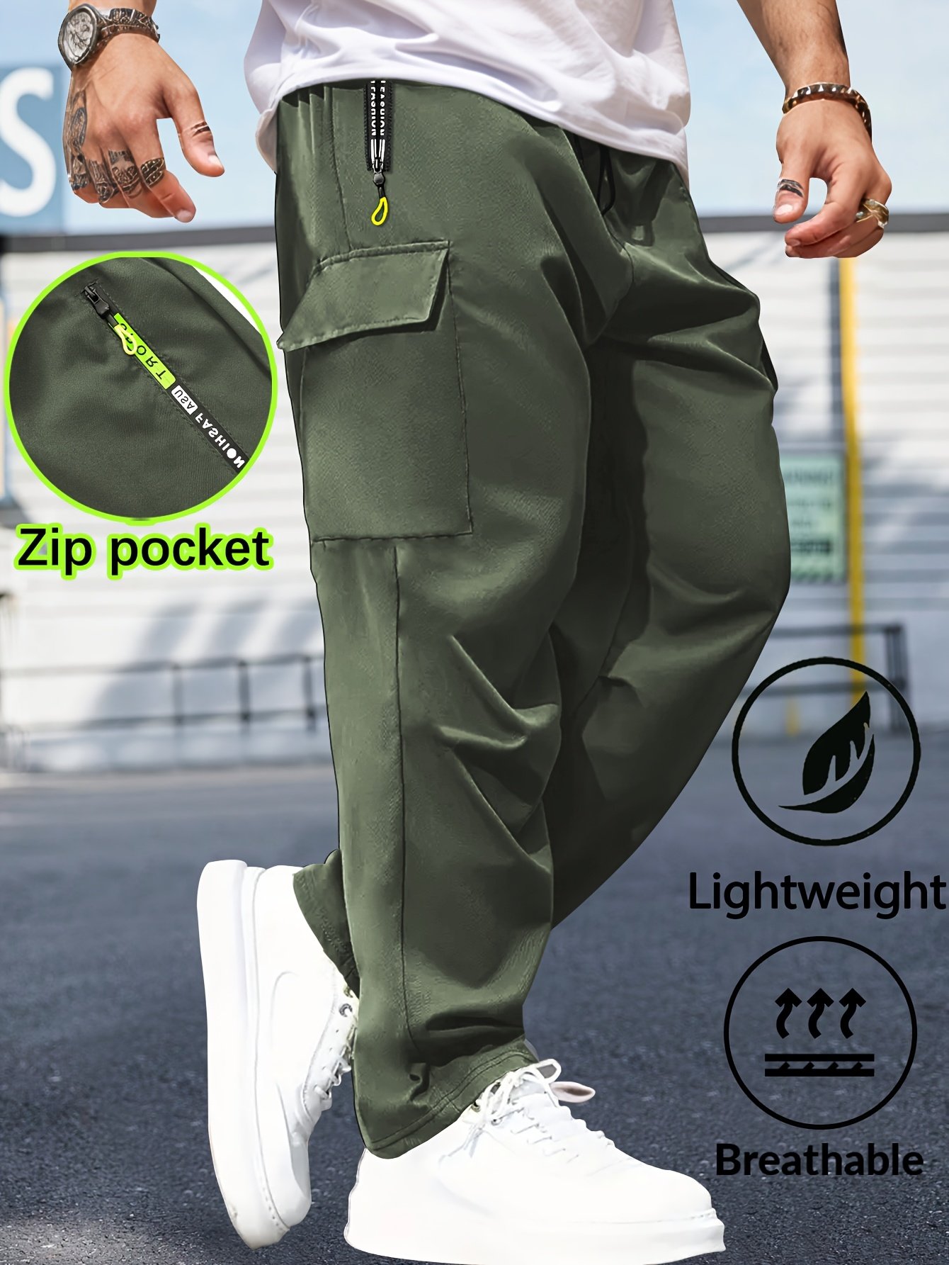et Poches Zippées Lettres Colorées, Coupe Standard, Couleur Unie Non Extensible, Grande Poche, Léger, Respirant, Idéal pour Activités Extérieures Printemps/Automne et Usage Quotidien
