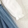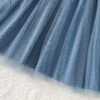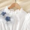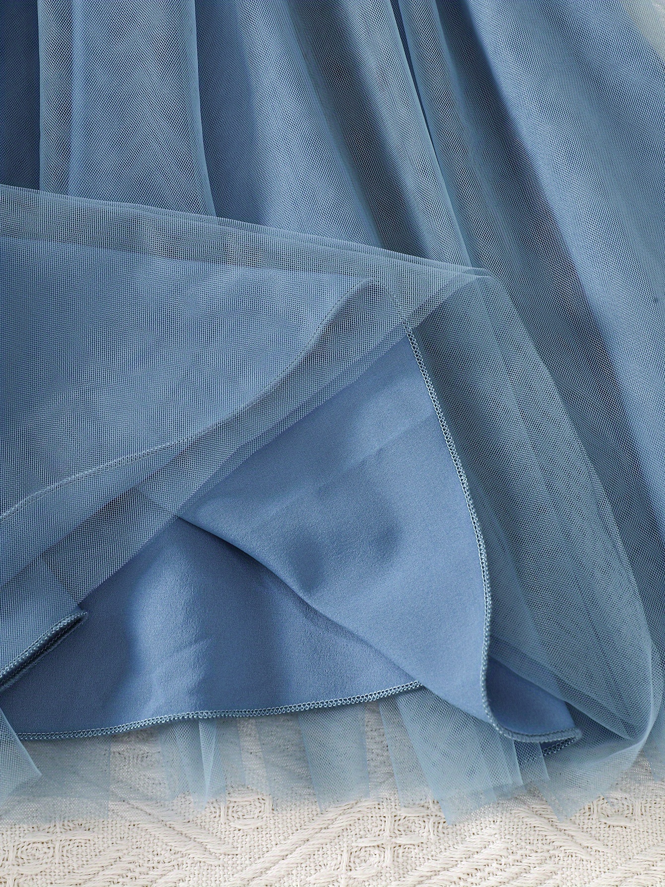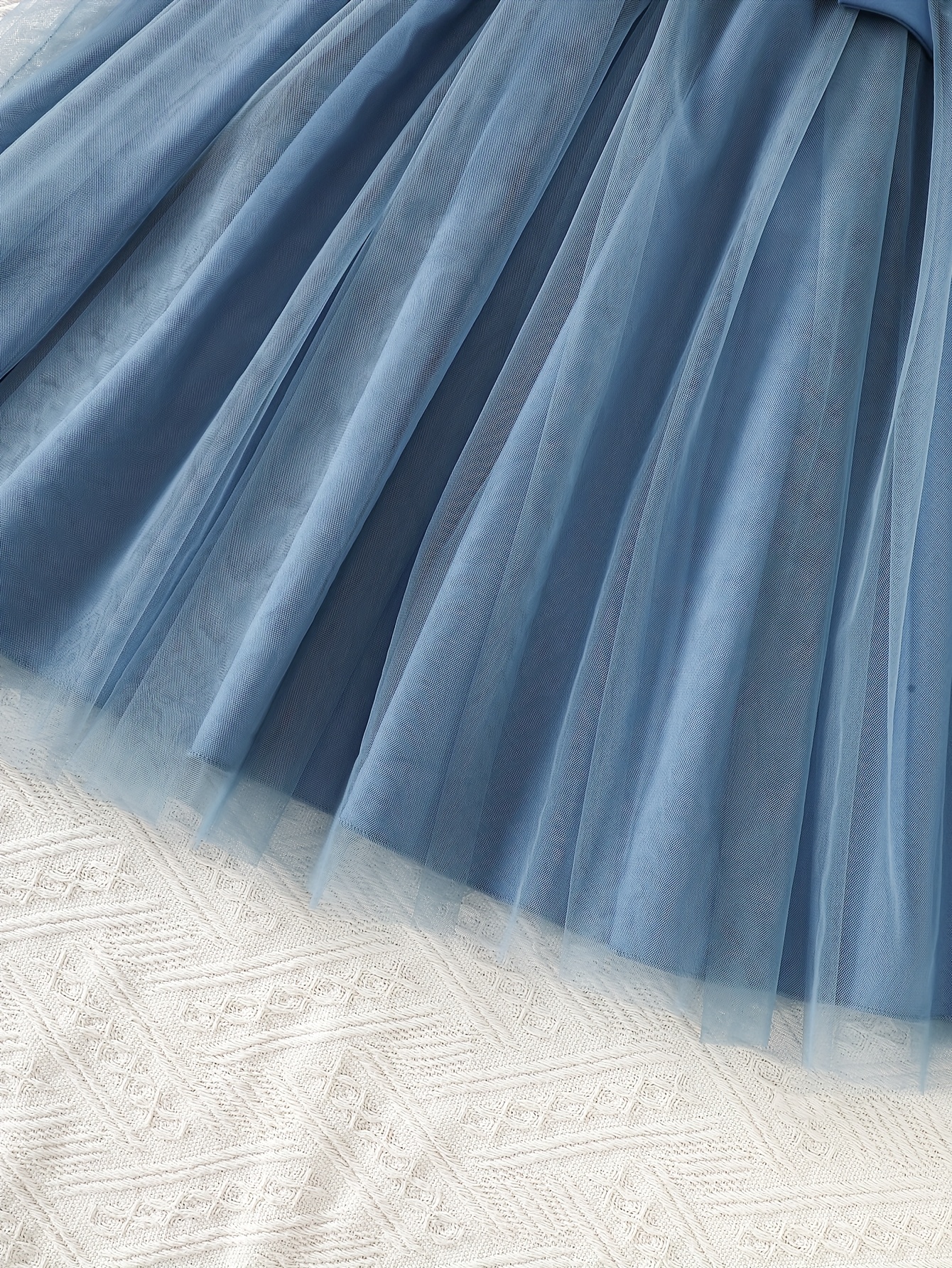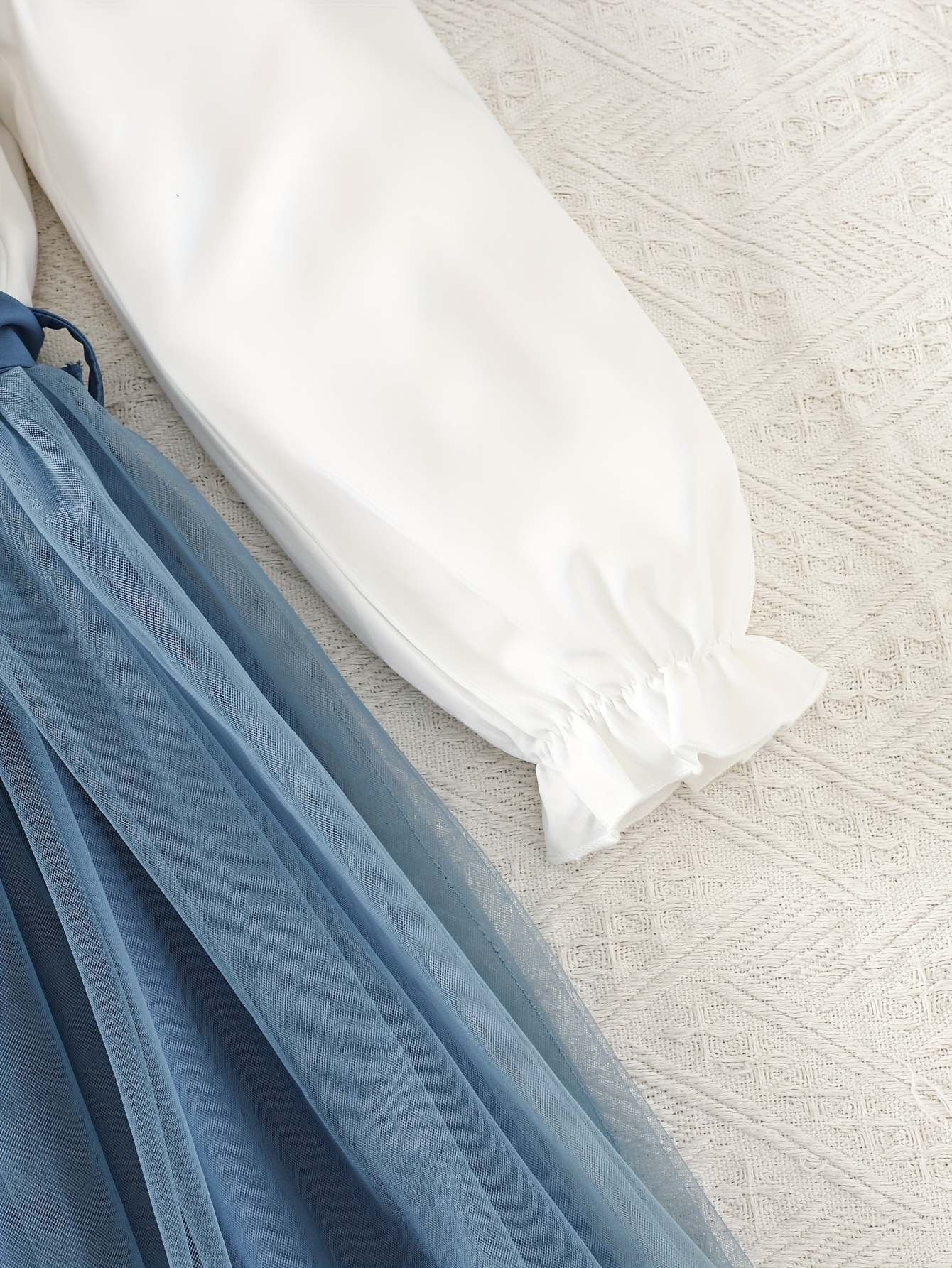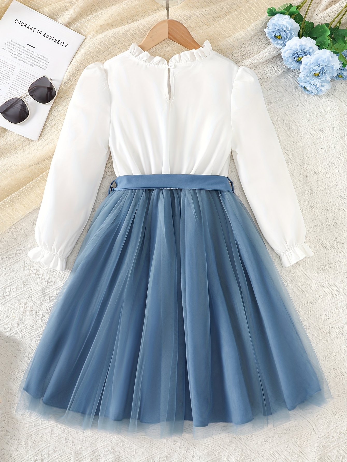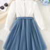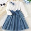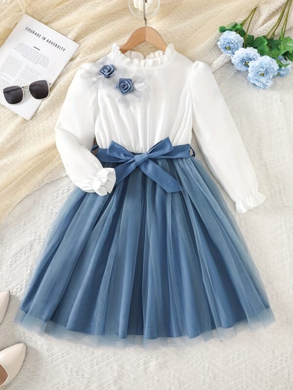 Robe à Dentelle Bleue et Blanche pour Filles avec Ceinture – Robe Midi à Manches Longues