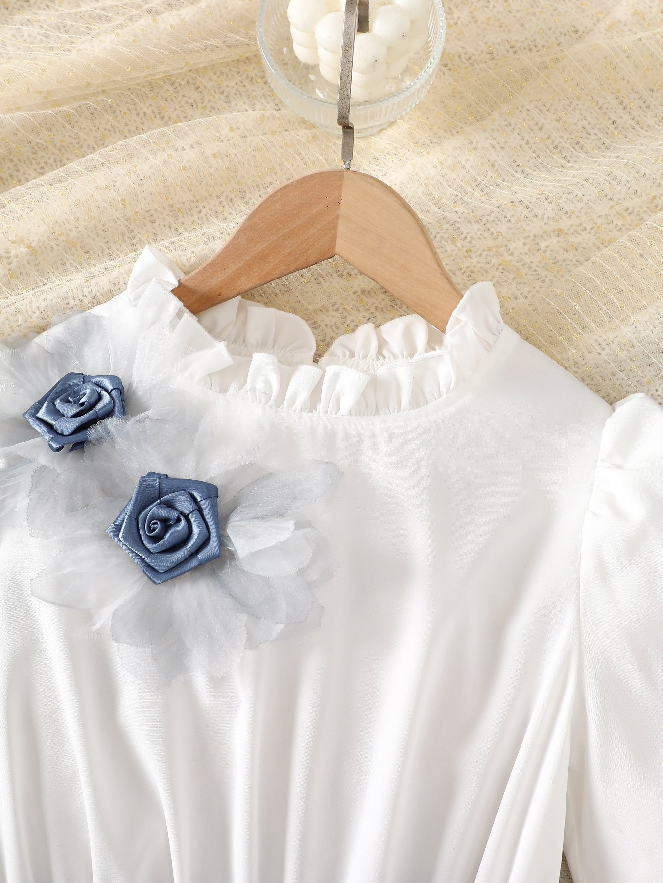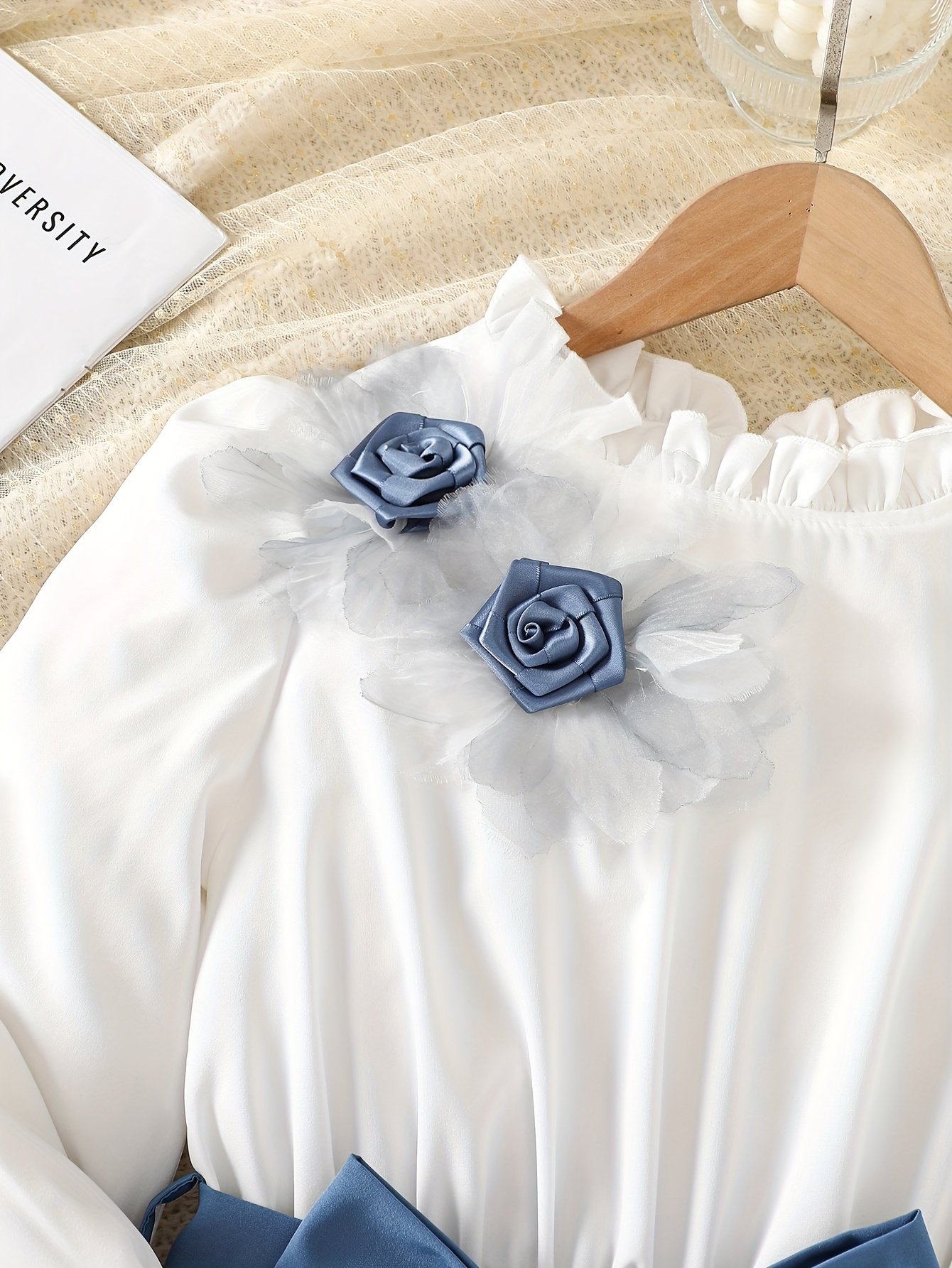 Robe à Dentelle Bleue et Blanche pour Filles avec Ceinture – Robe Midi à Manches Longues