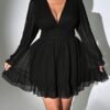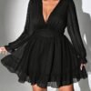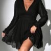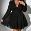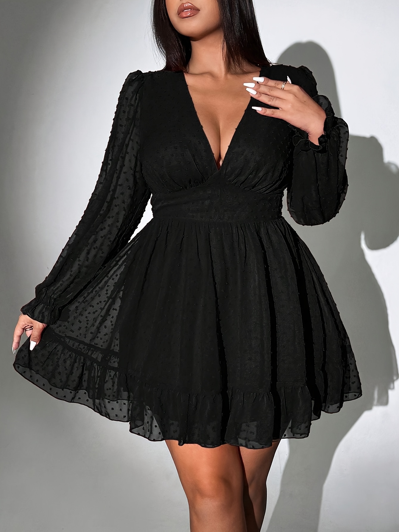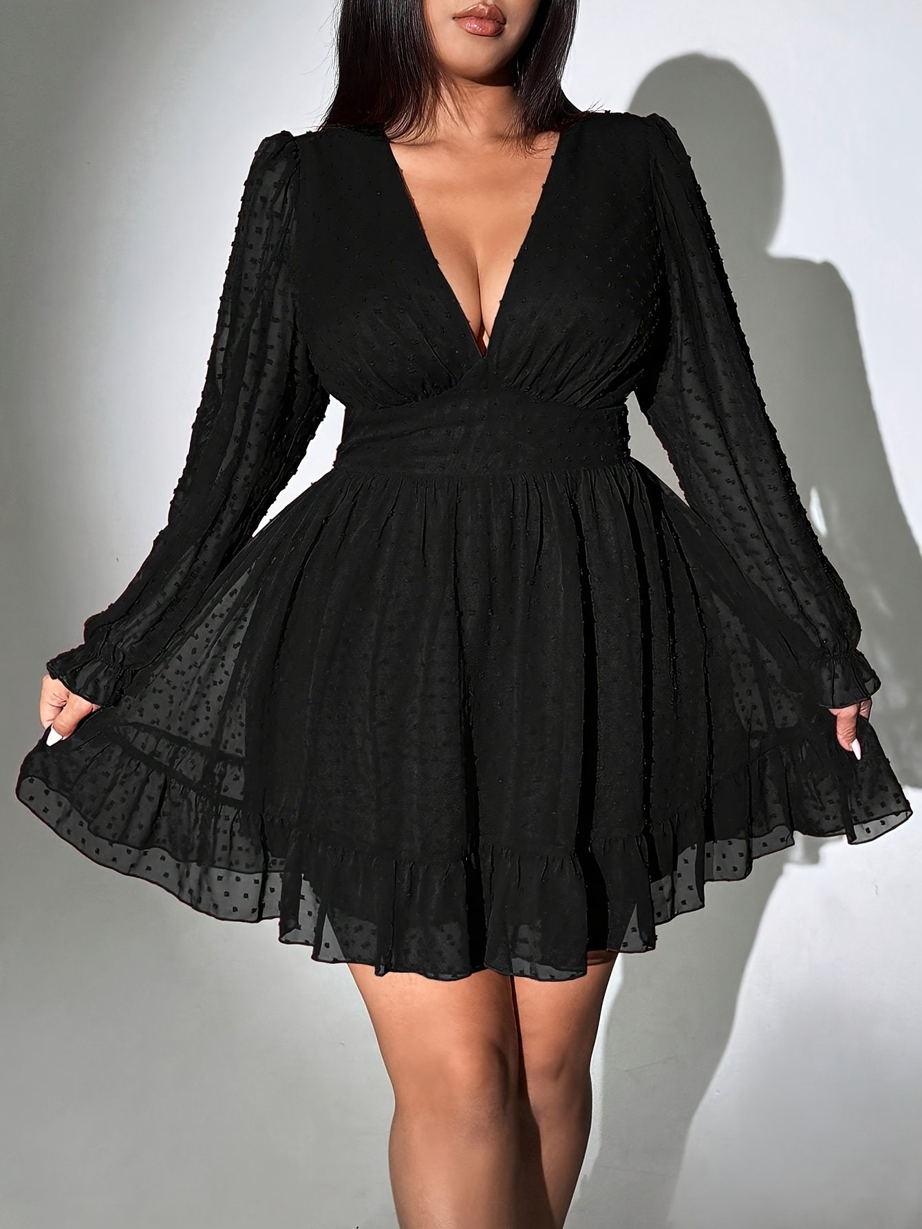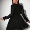 Robe A-ligne à manches longues en mousseline unie à pois jacquard tridimensionnel