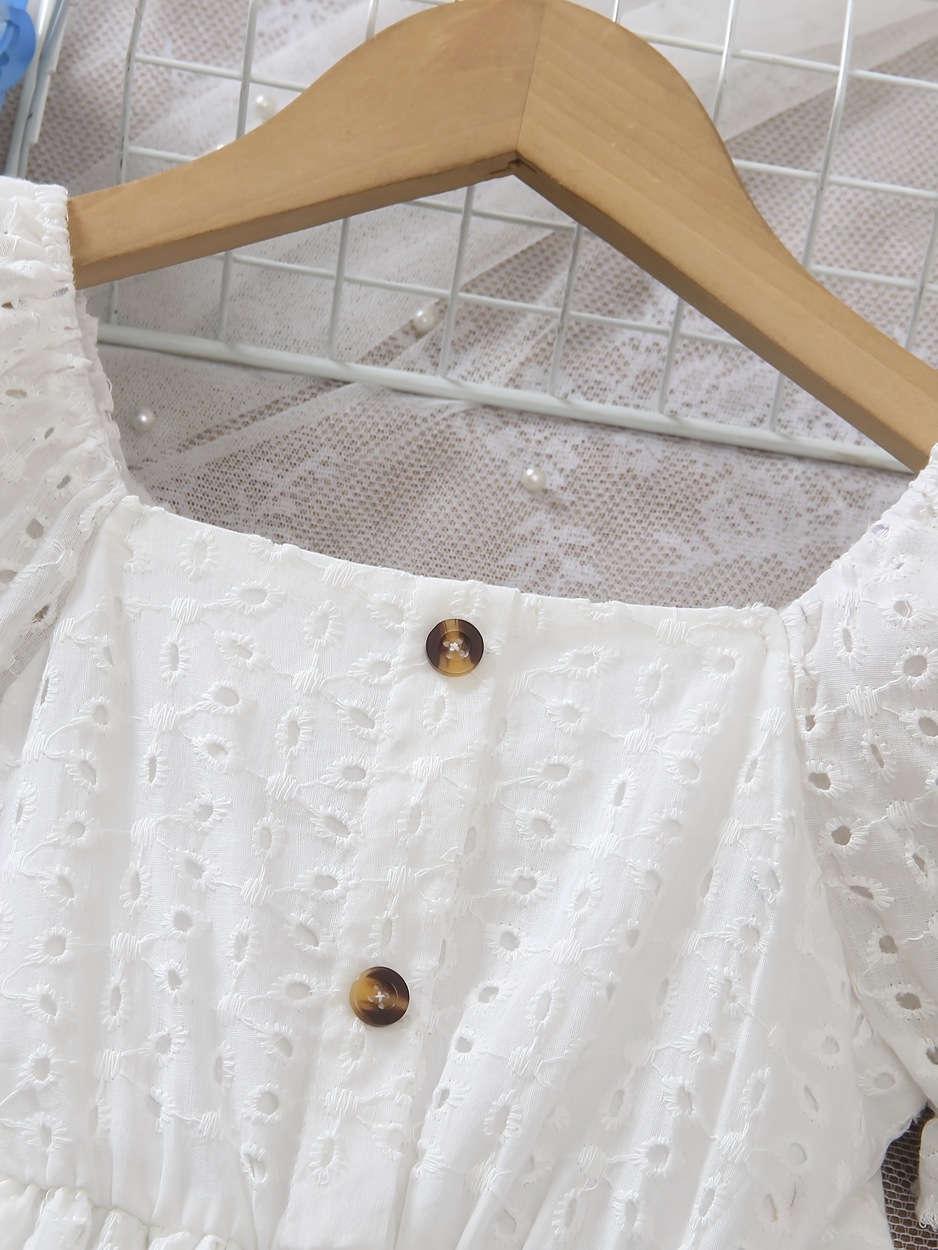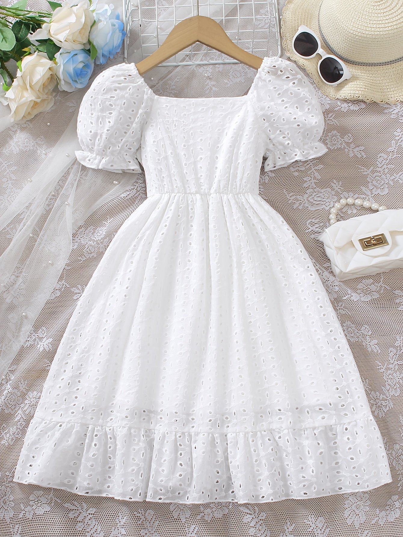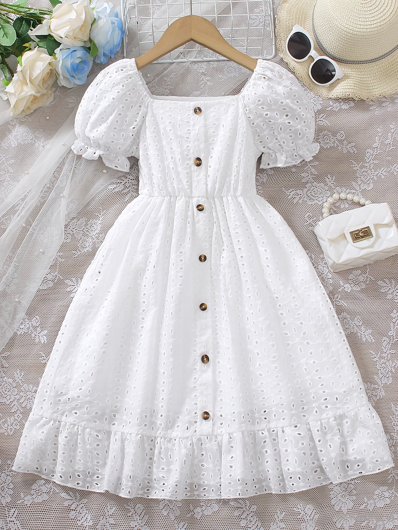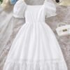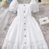 Robe à manches courtes pour filles avec col carré, boutonnage devant