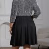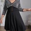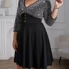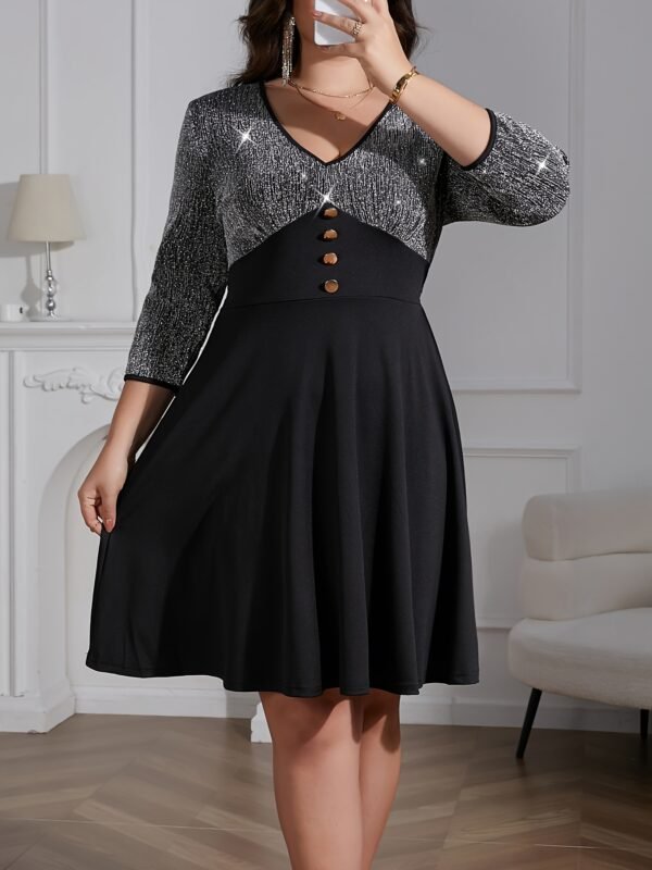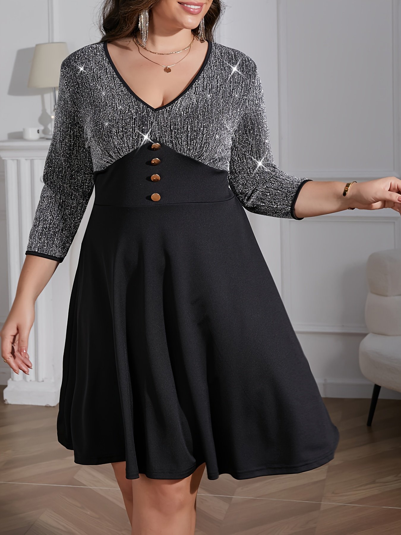 Robe de soirée élégante à col en V et manches scintillantes – Robe noire à volants avec boutons faux, tissu extensible pour le printemps/été, tenue décontractée à formelle, tenue décontractée | Robe à manches scintillantes | Tissu extensible