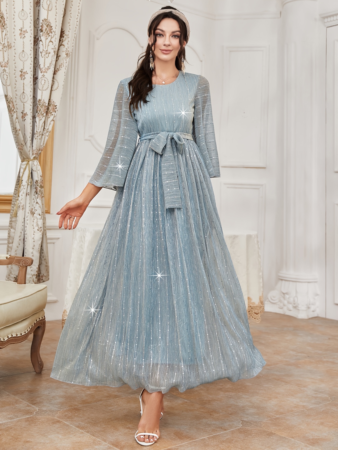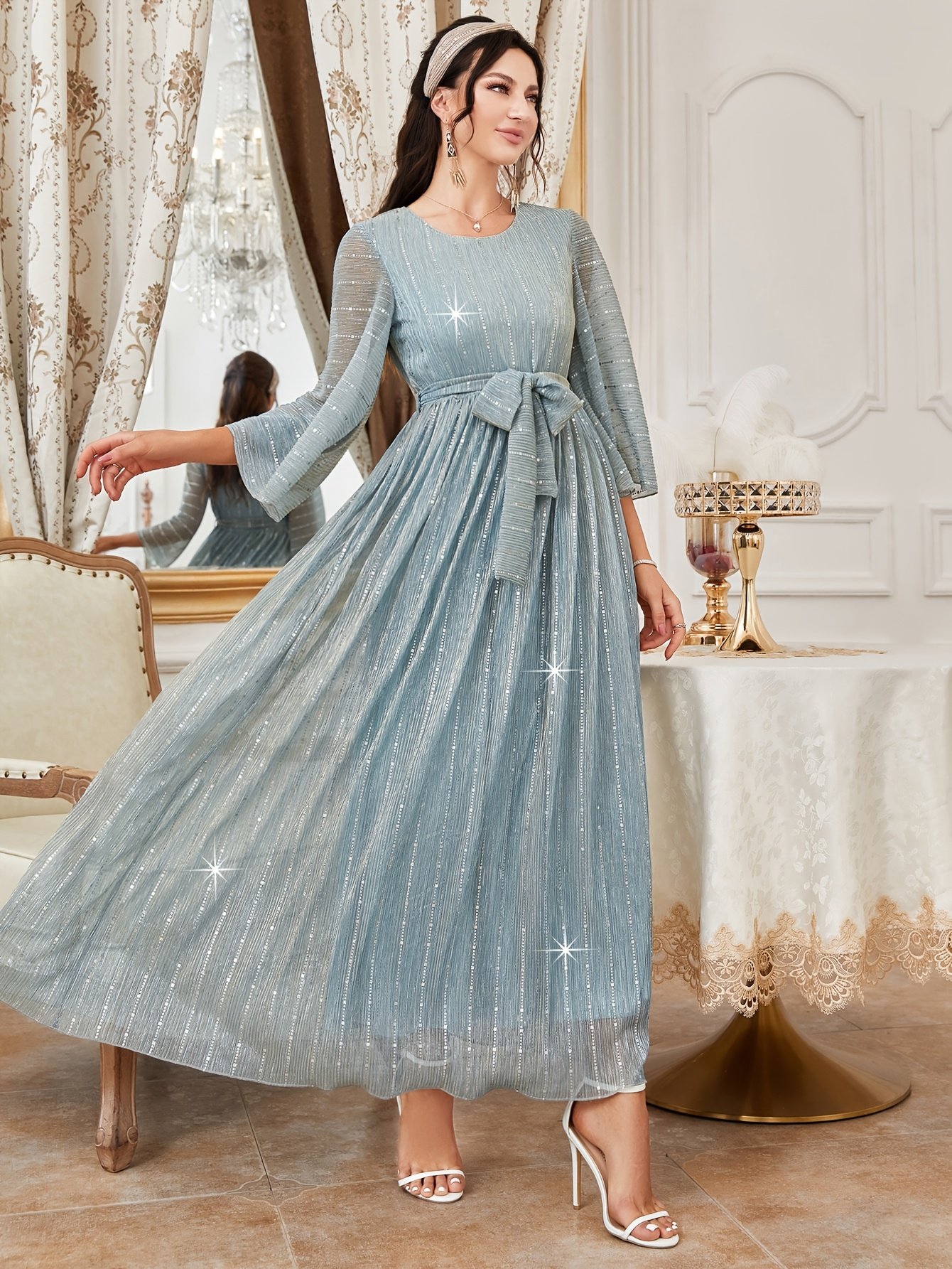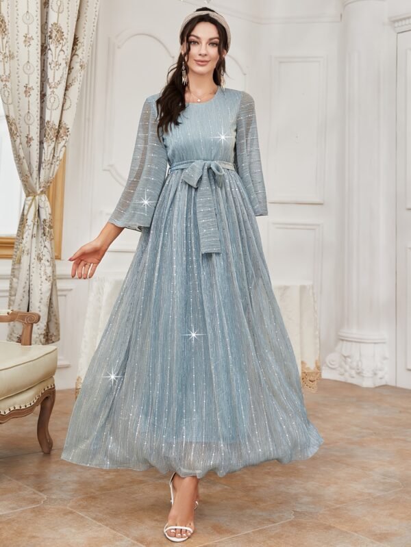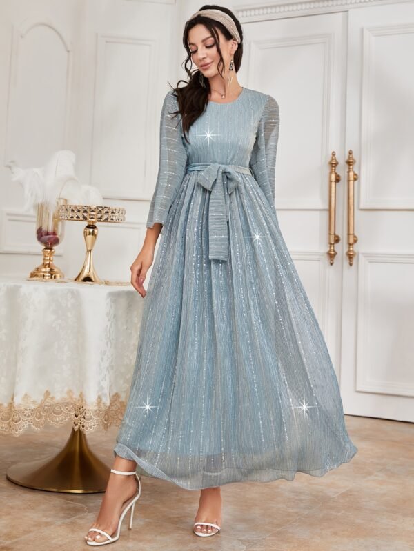 Robe de soirée élégante et scintillante pour femme avec ceinture étoilée étincelante & traîne