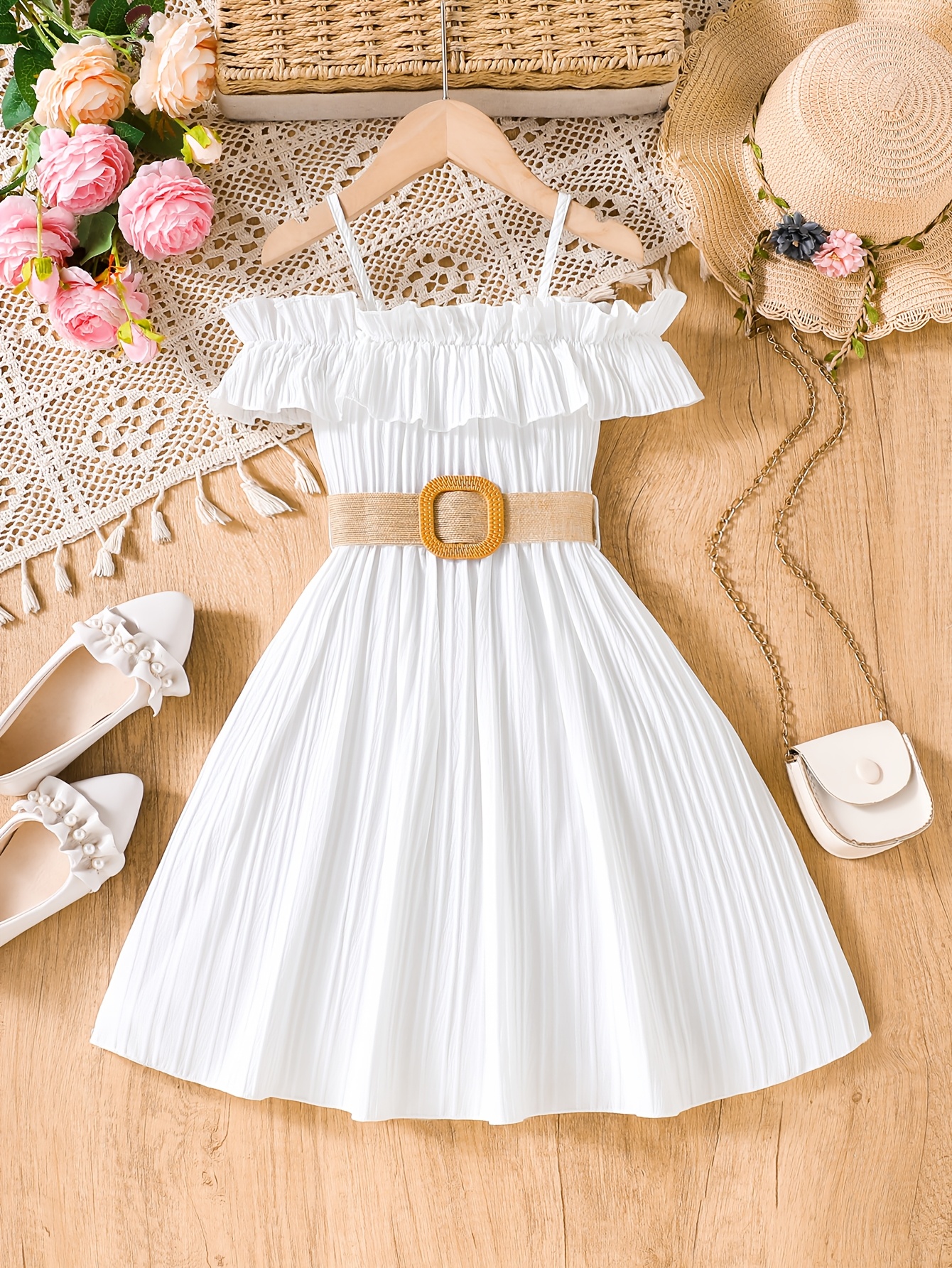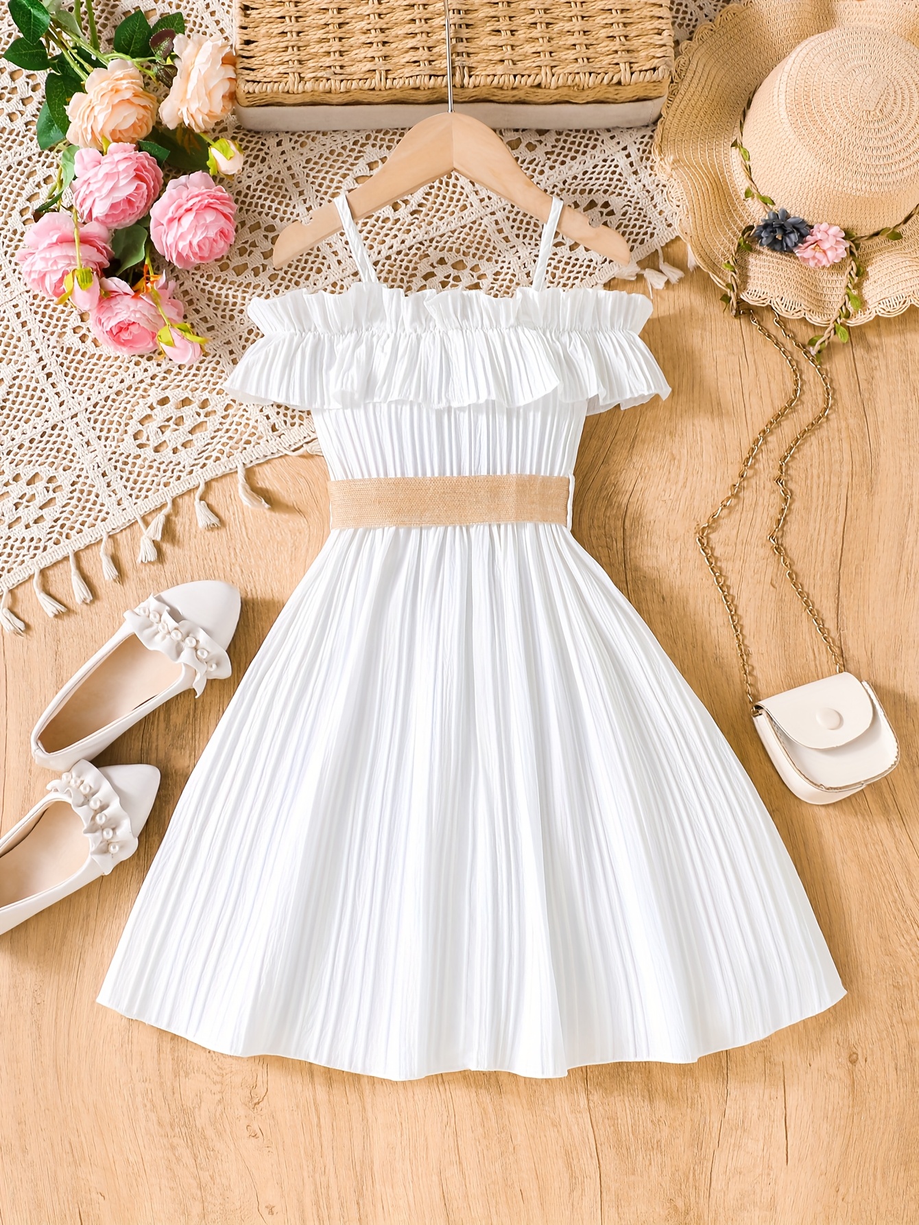 Robe d’été élégante unie à taille haute, dos nu, tissu non extensible, ceinturée avec bordure