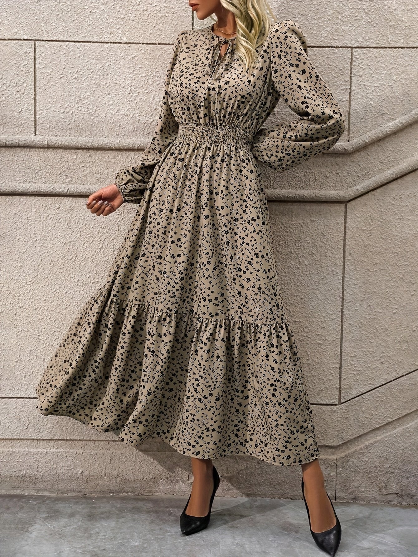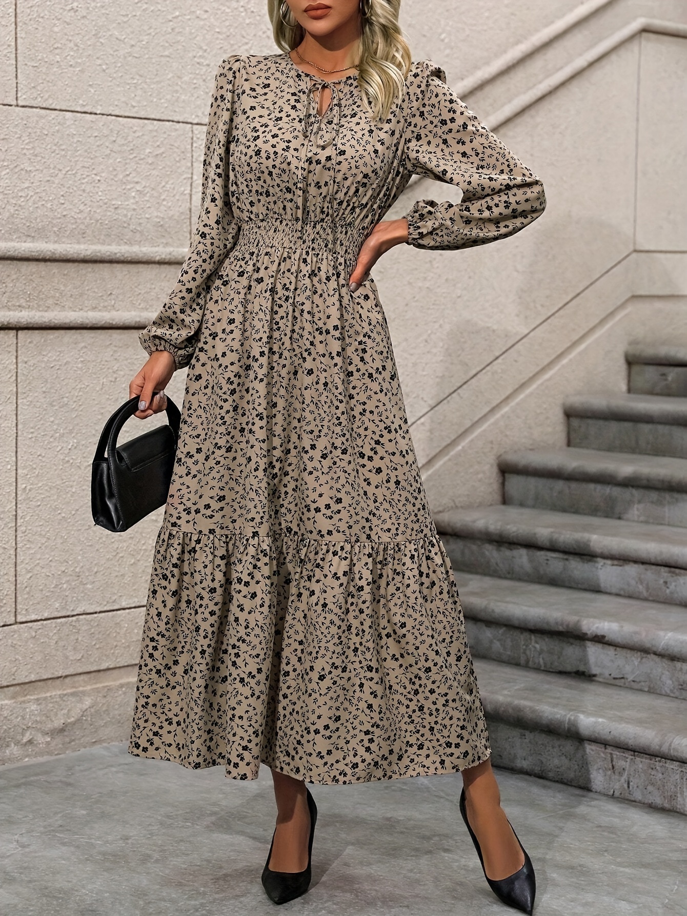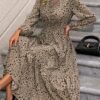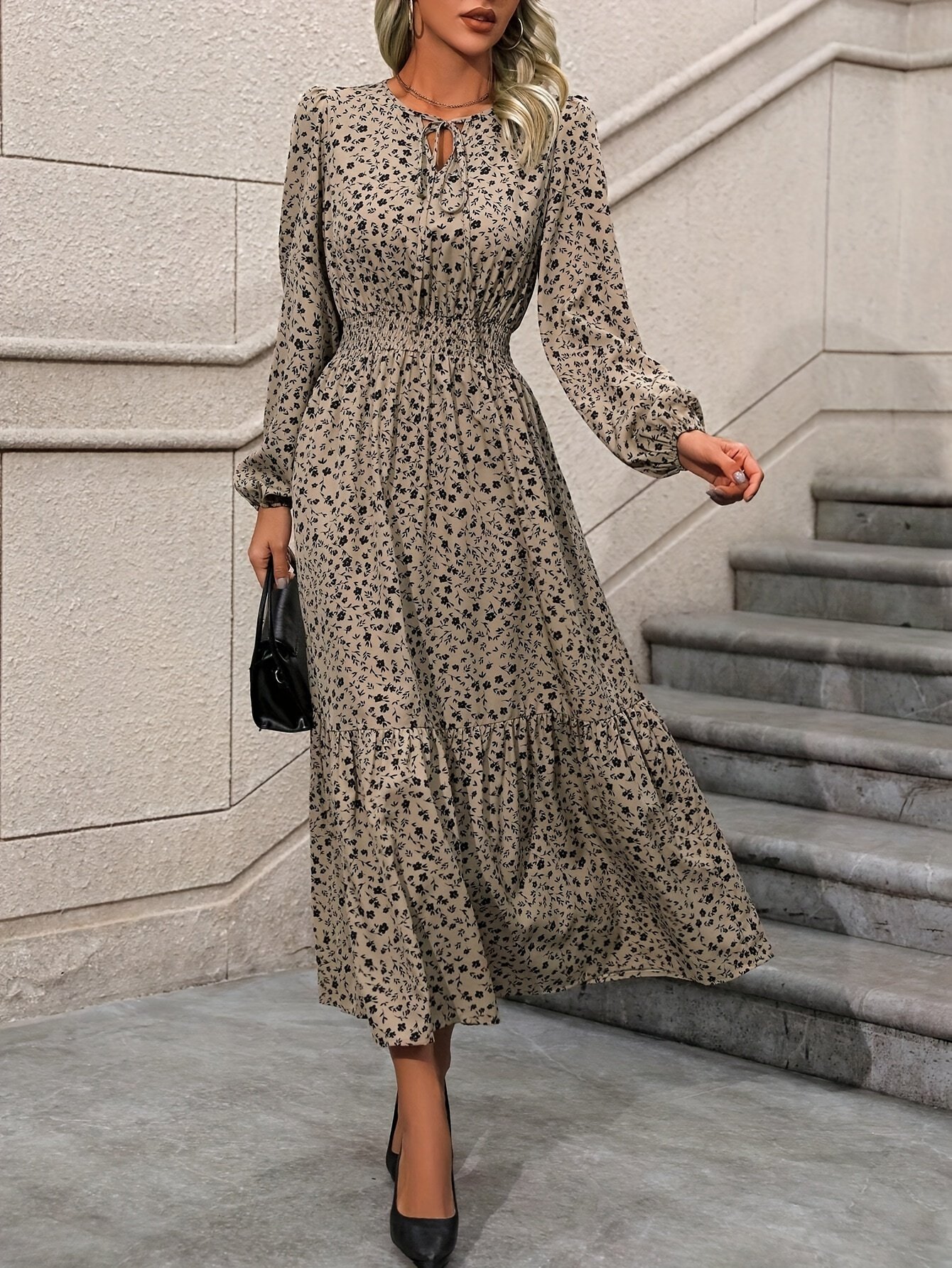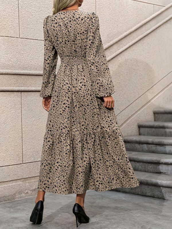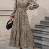Soyez le premier à laisser votre avis sur “Robe élégante à col cranté à manches longues avec imprimé floral délicat et détails à volants, 100 % polyester tissé, robe trapèze midi pour le printemps et l’automne”