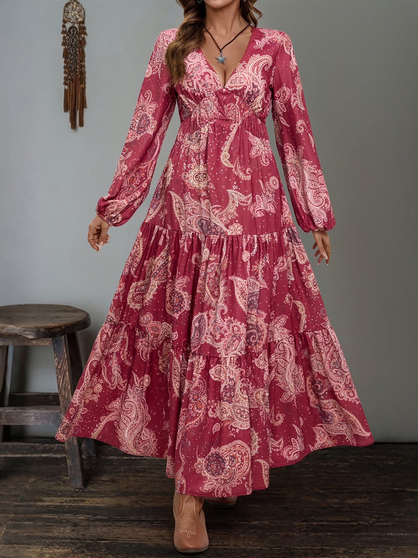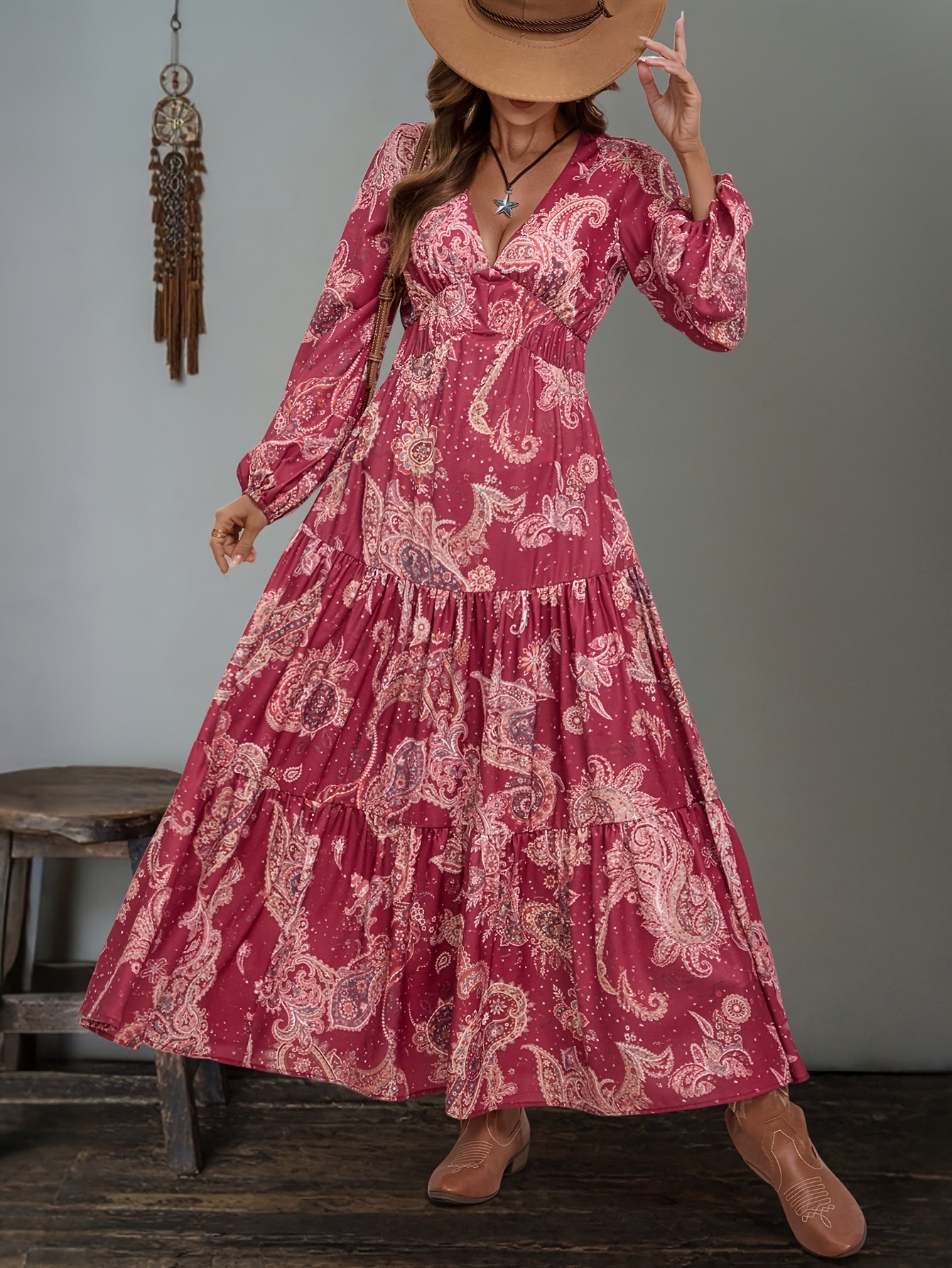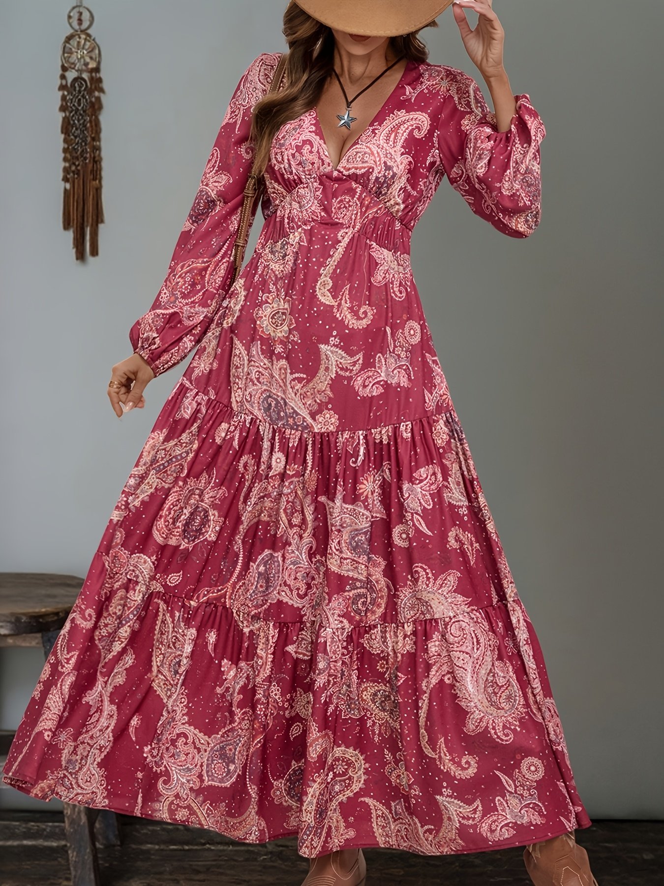 Robe longue ethnique à col en V pour femmes avec imprimés aléatoires et taille élastique pour un look de vacances élégant