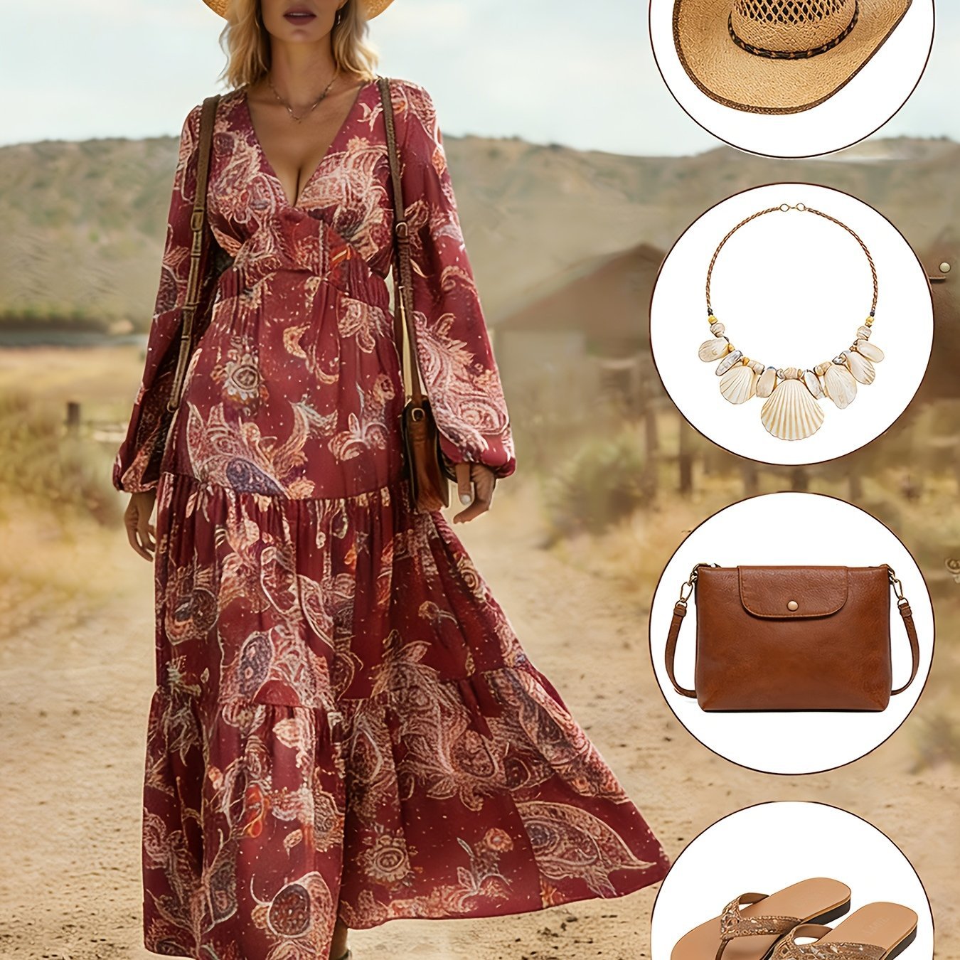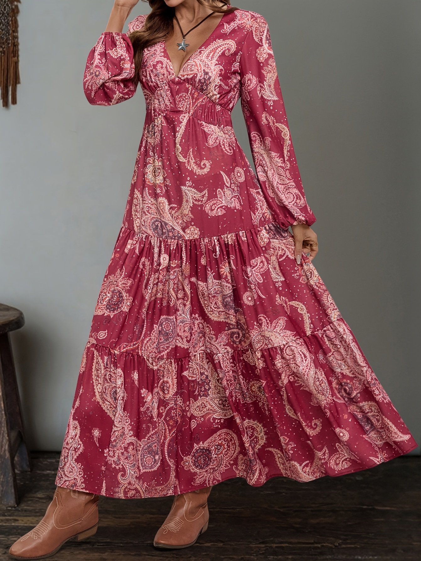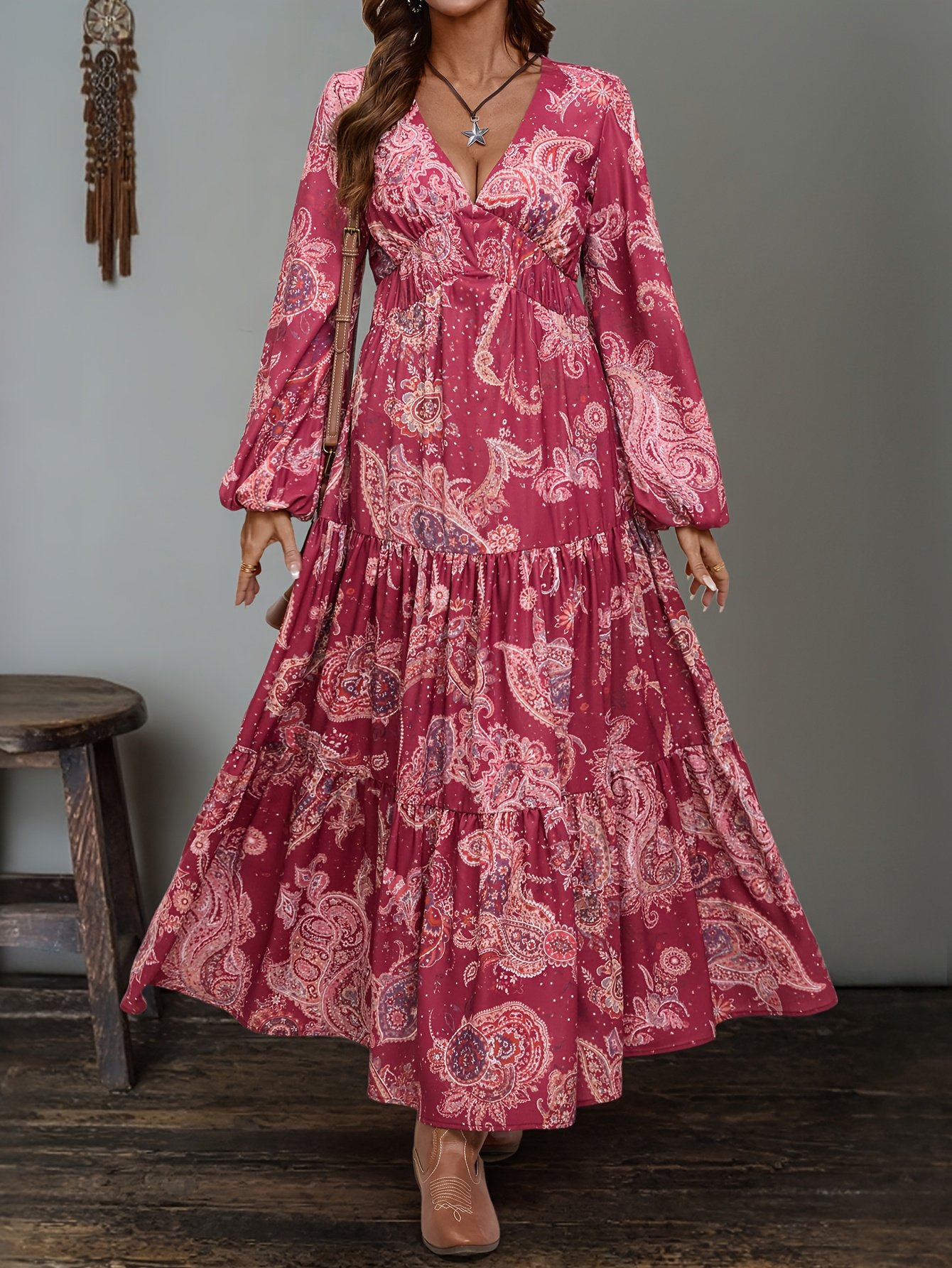 Robe longue ethnique à col en V pour femmes avec imprimés aléatoires et taille élastique pour un look de vacances élégant