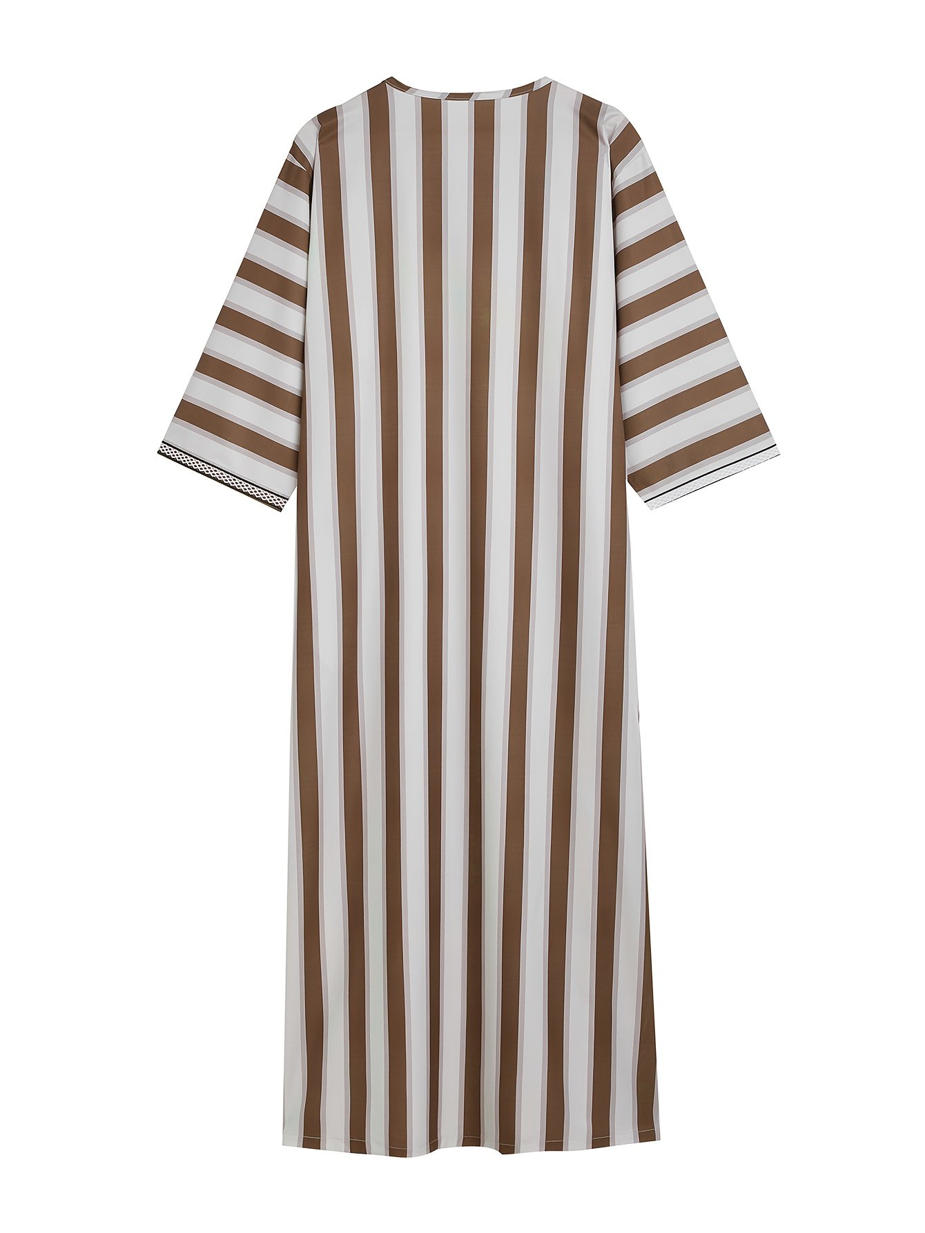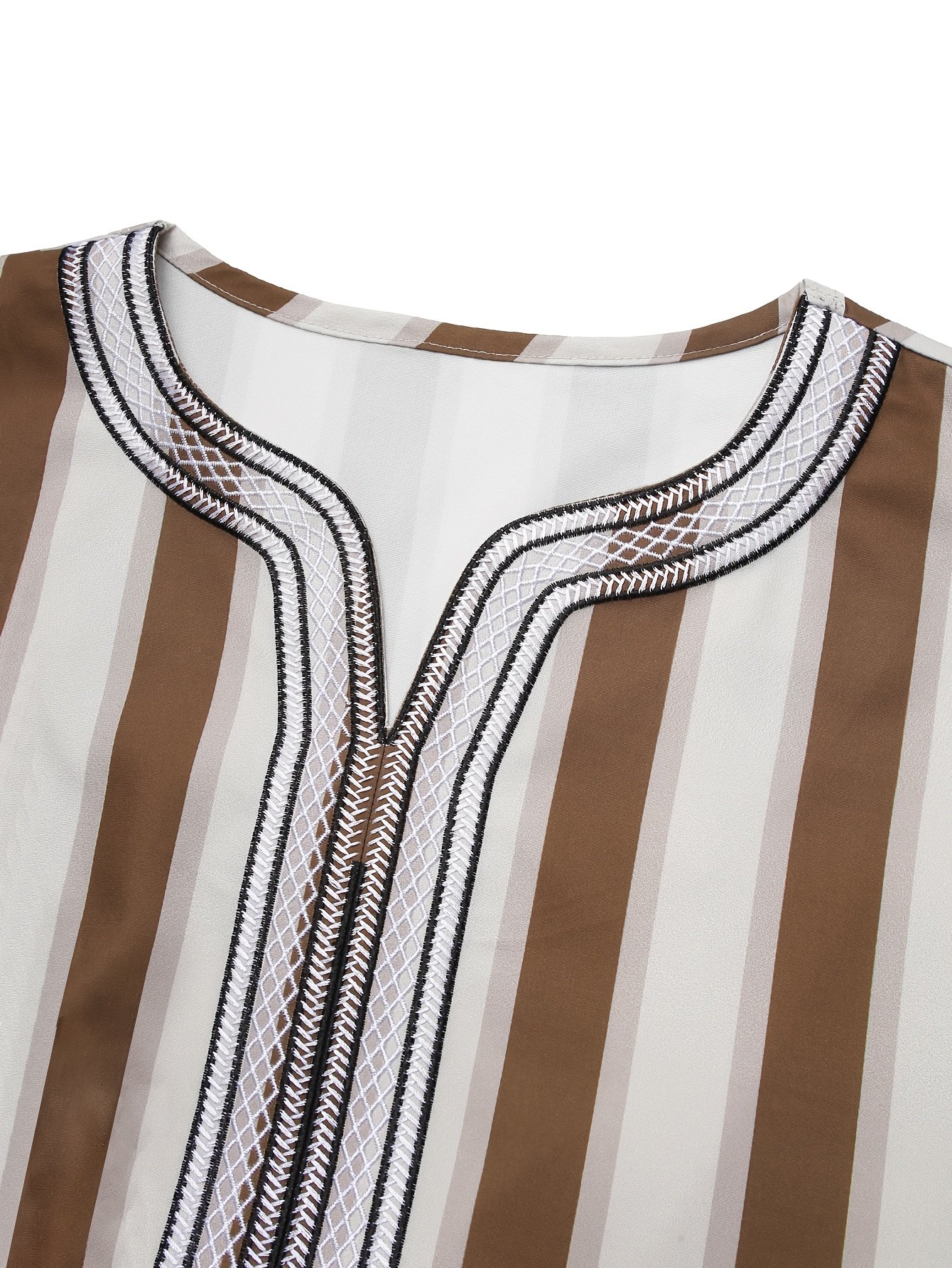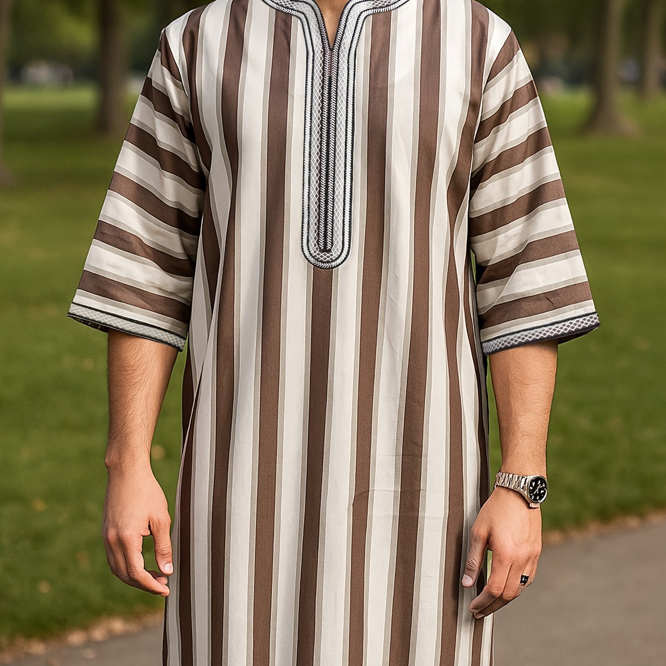 Robe Longue Traditionnelle Orientale pour Homme – Robe Marron Ample Style Marocain à Col en V avec Broderies Noires et Blanches – Robe Traditionnelle pour Vêtements Décontractés Arabes Islamiques Musulmans – Vêtements Festifs pour l’Aïd al-Fitr et l’Aïd