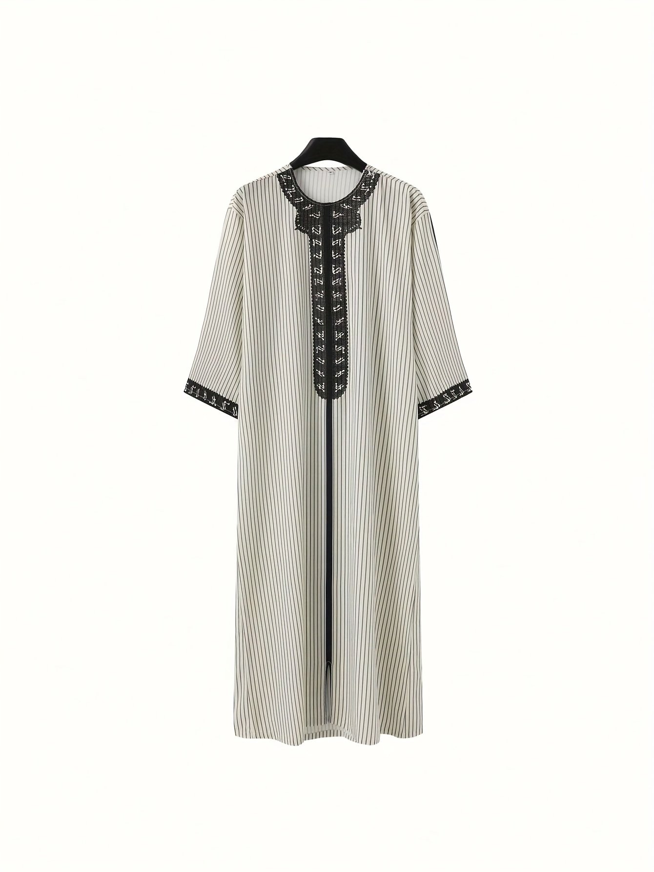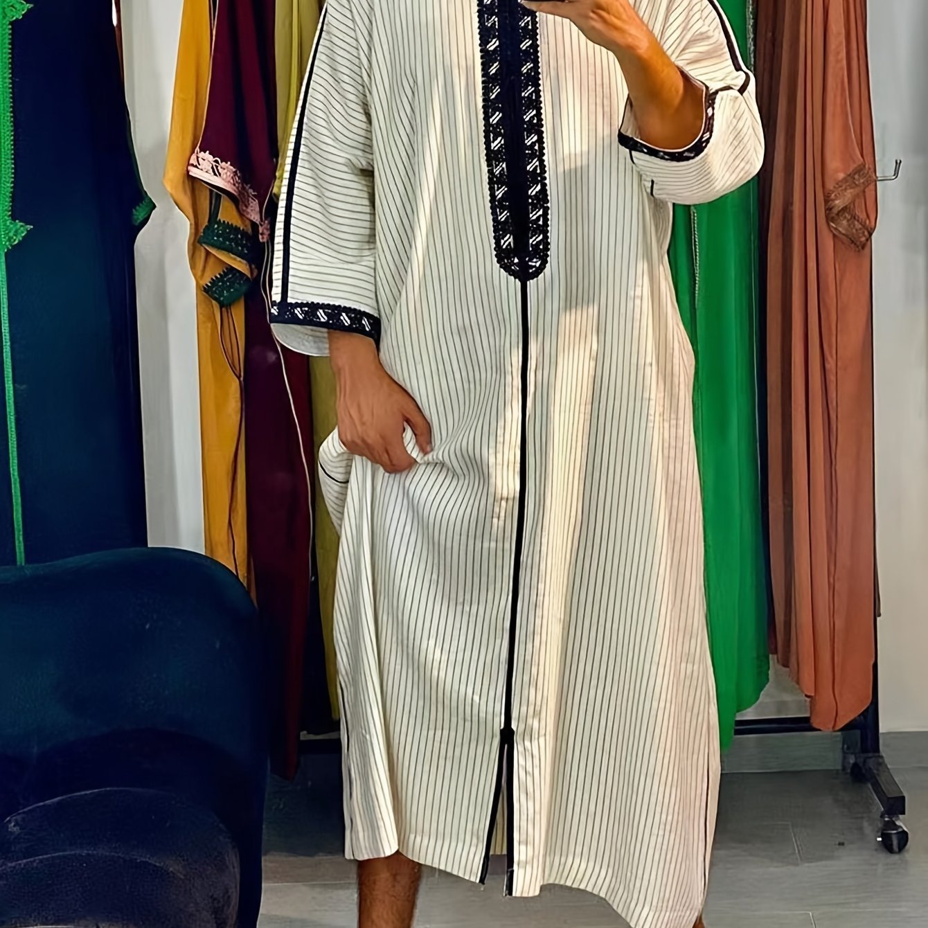 Robe marocaine pour homme à manches courtes, broderie rayée, col rond et poches latérales, coupe ample, tissu opaque, pour Eid, Ramadan et événements culturels