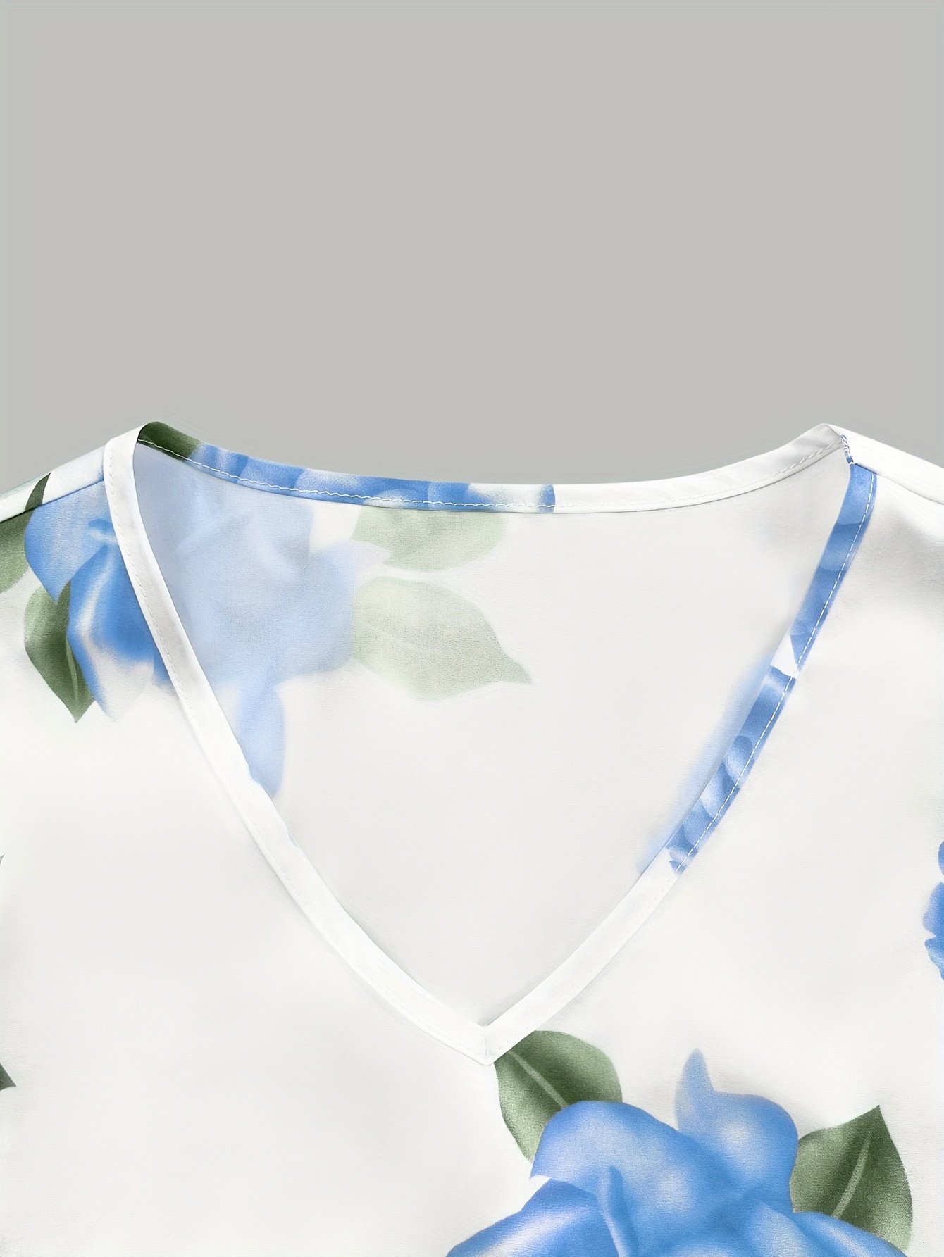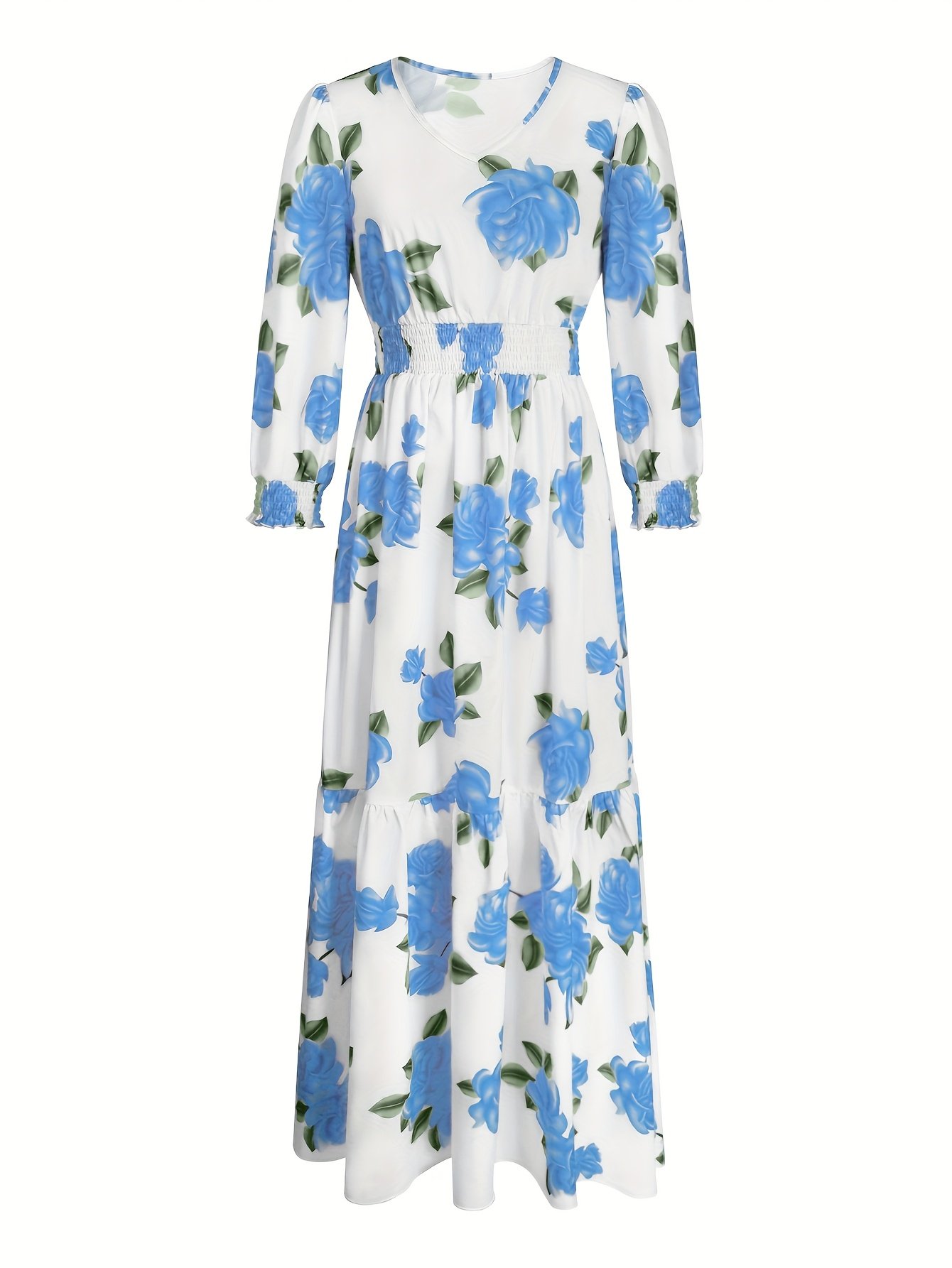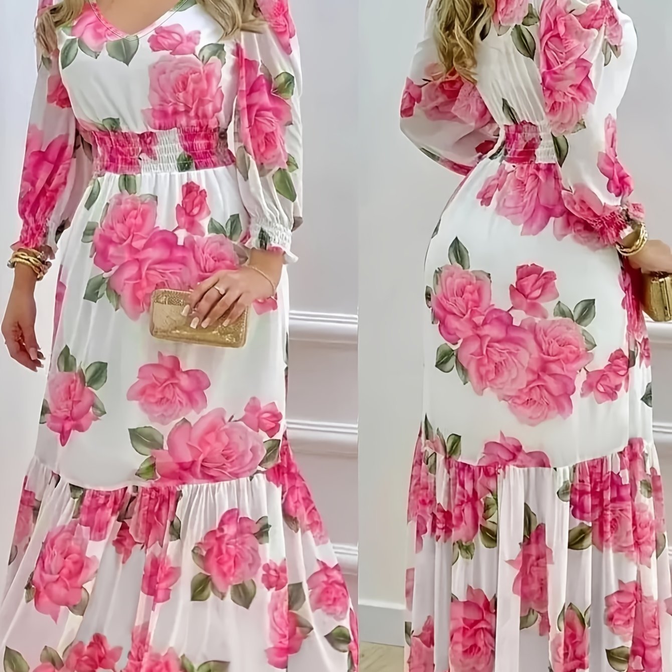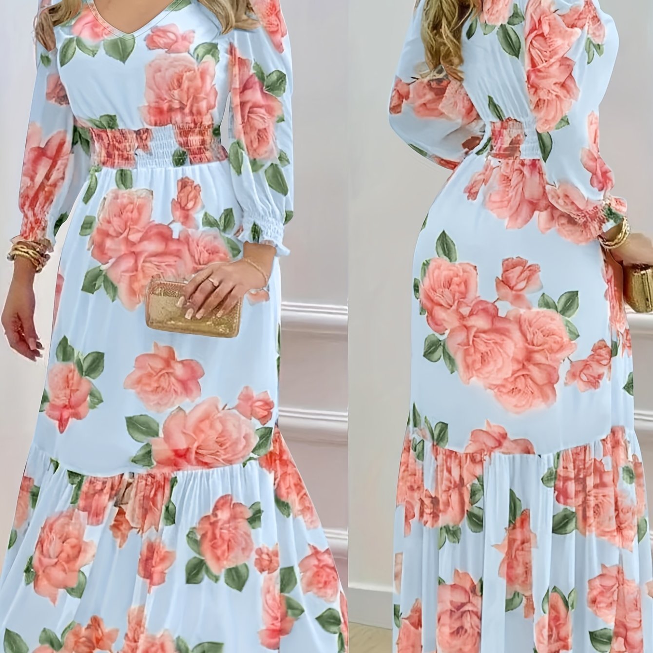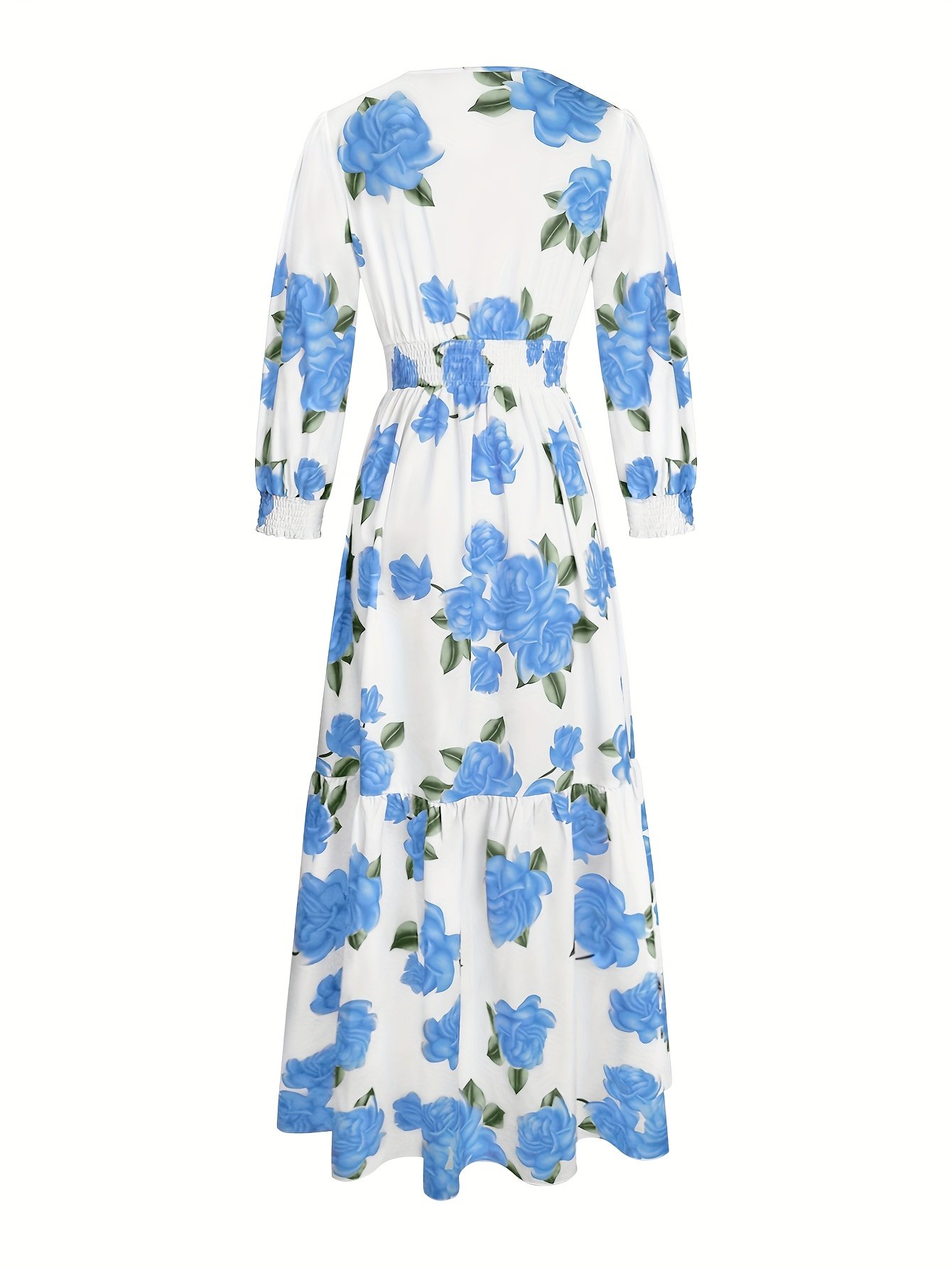 Robe maxi élégante à imprimé floral avec col V, manches longues et détails rufflés – idéale pour printemps et automne, attire casual ou formel
