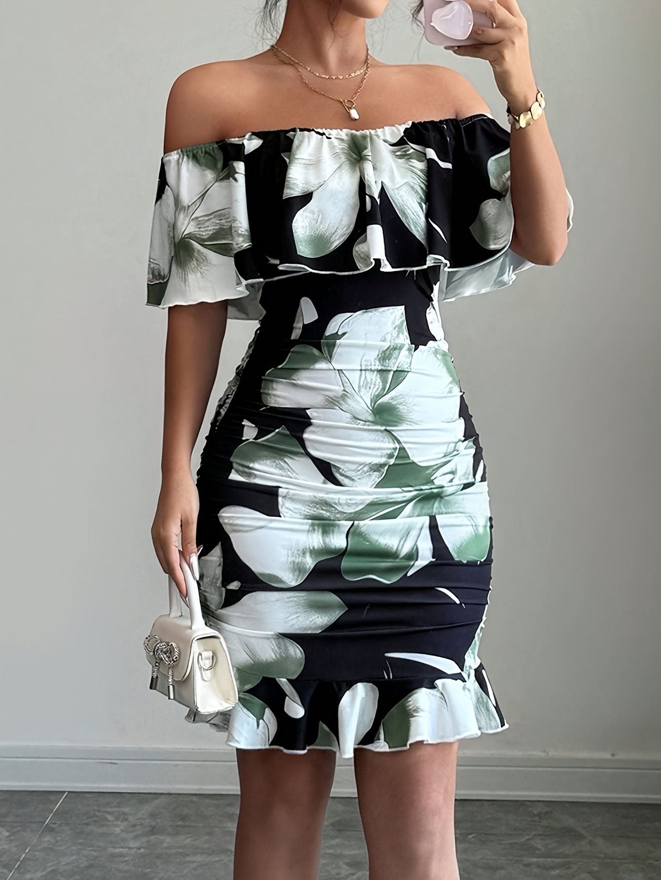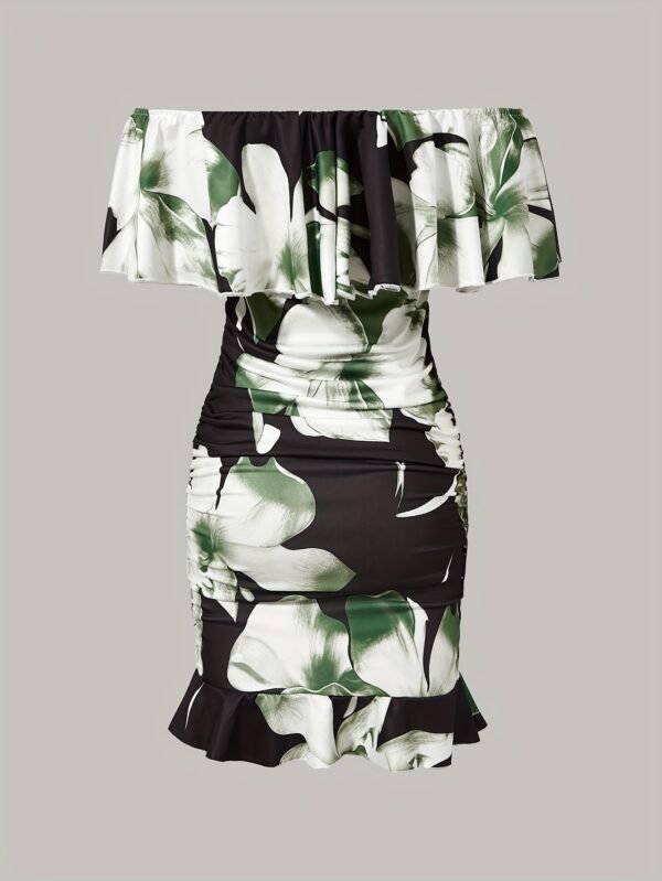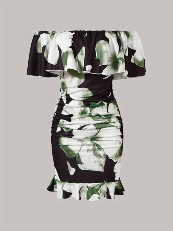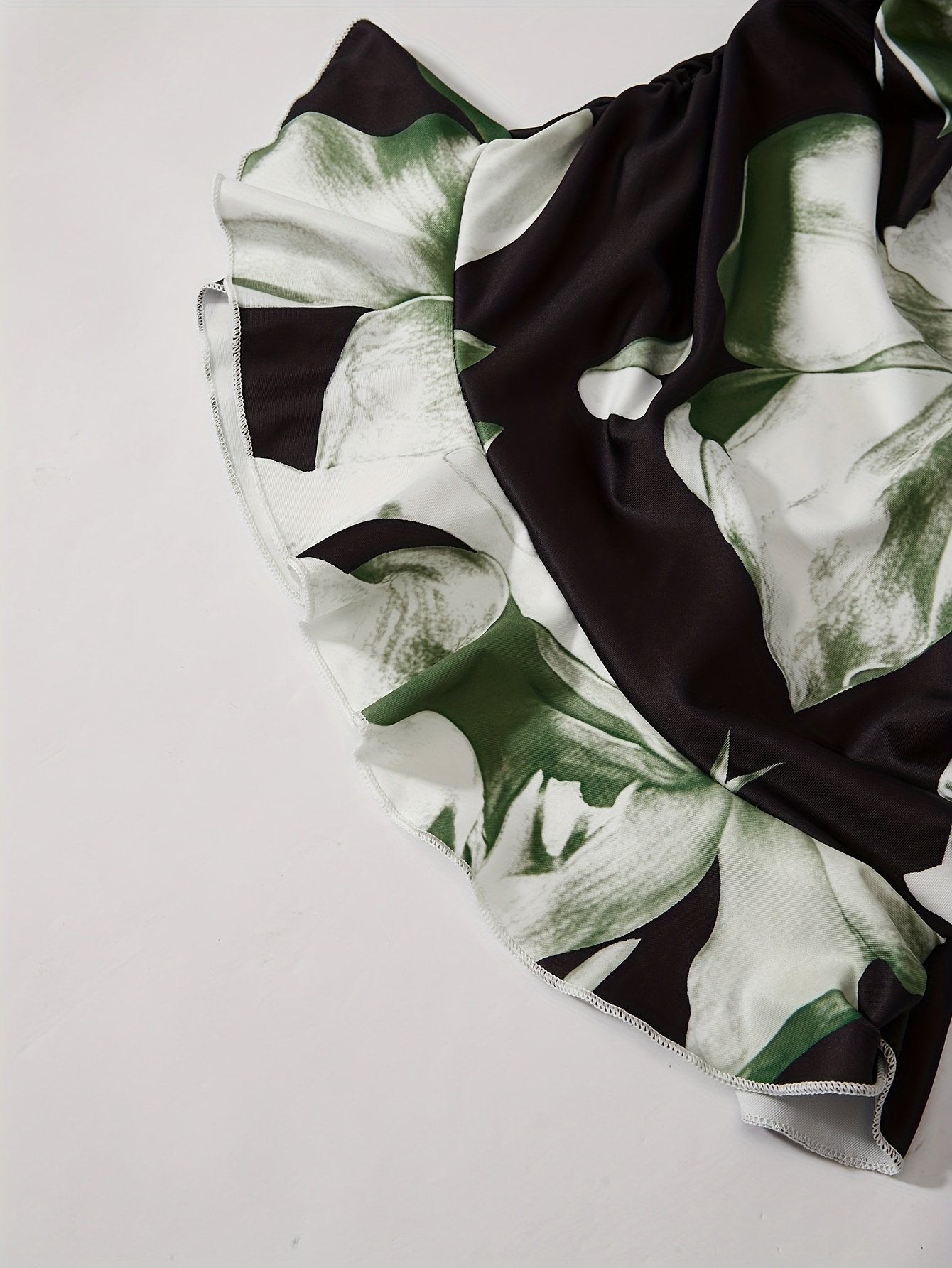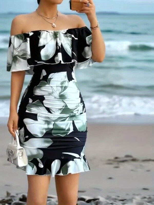 Robe mi-longue femme imprimé floral bretelles tombantes, ourlet volanté