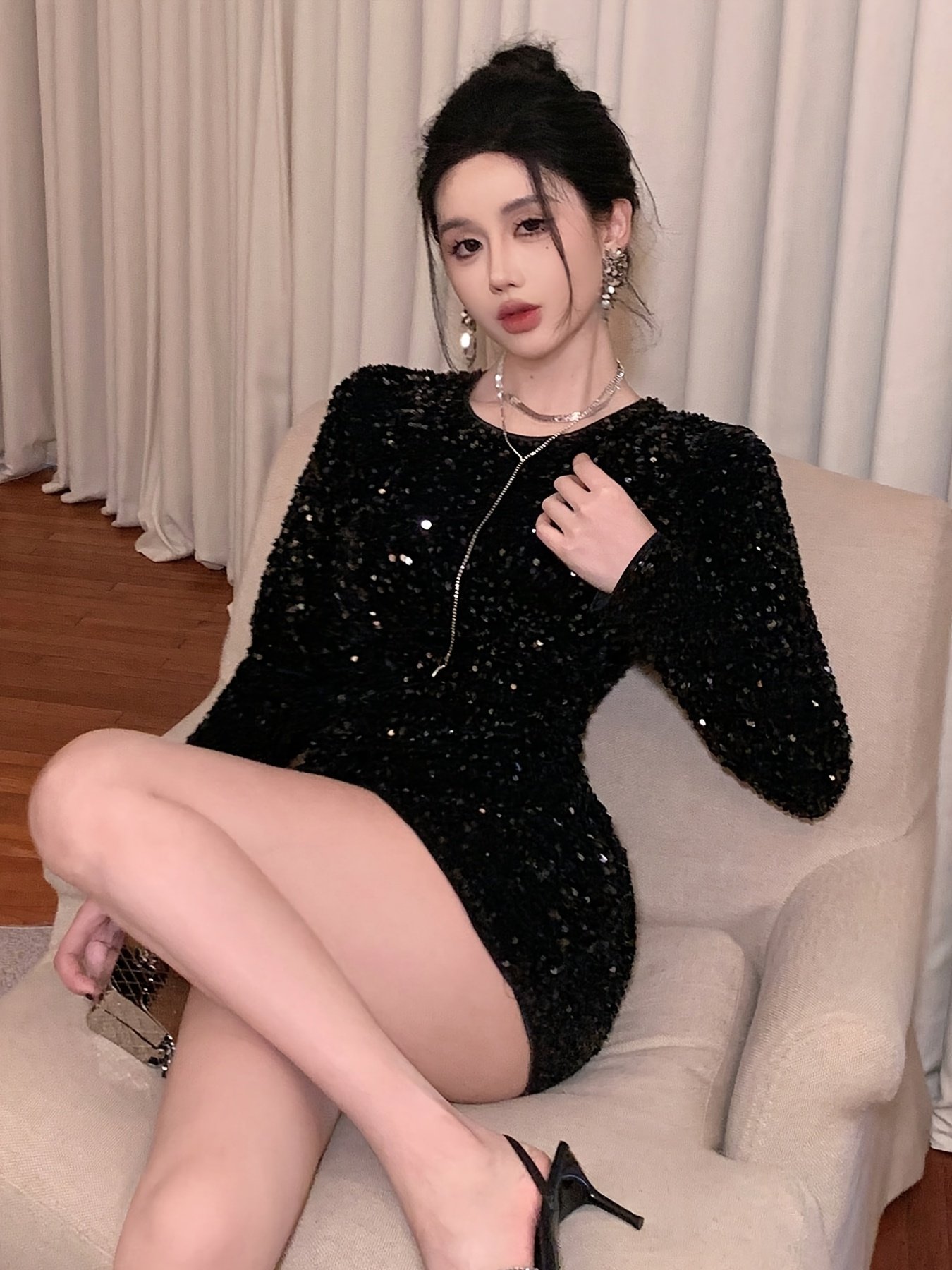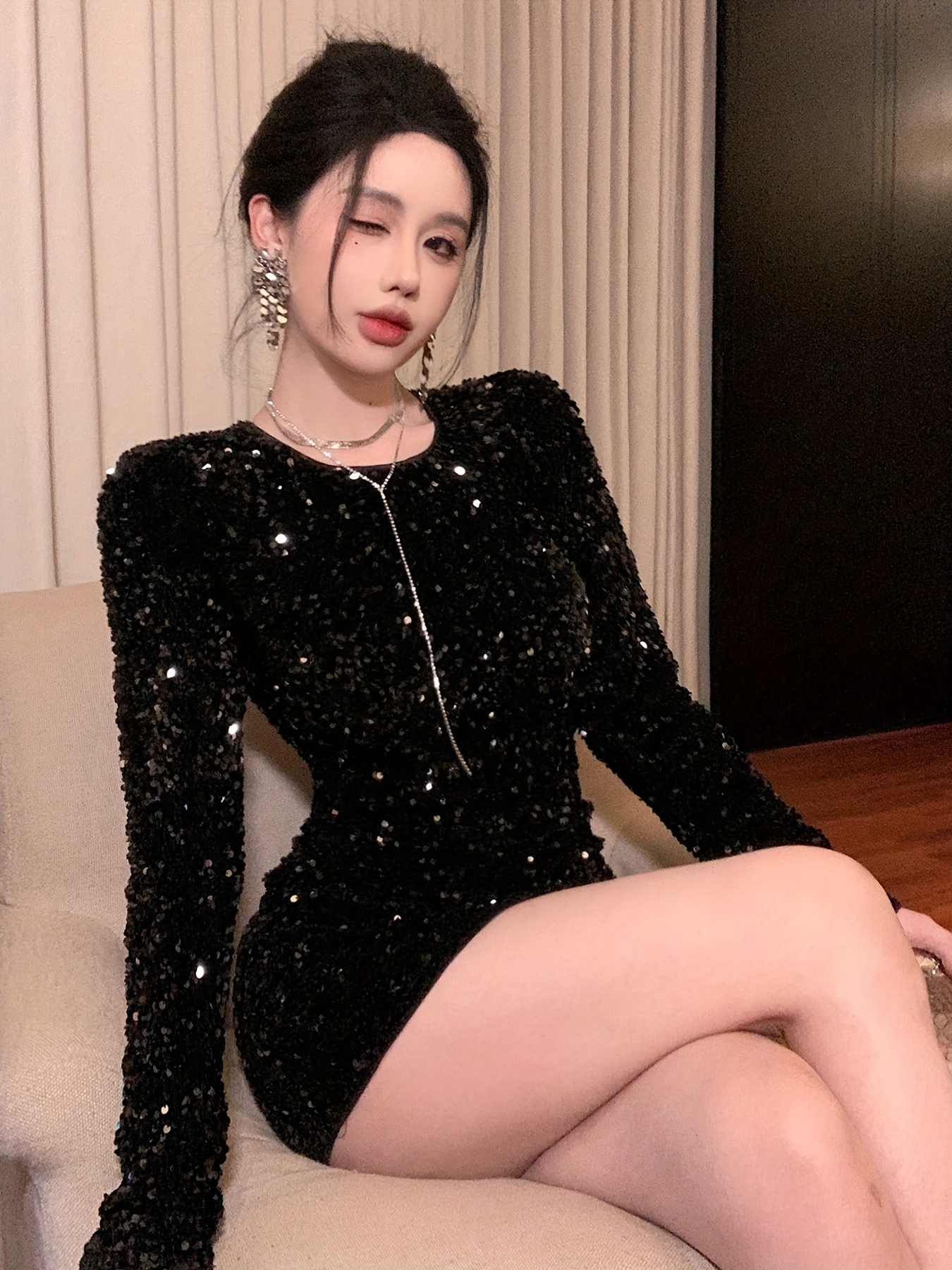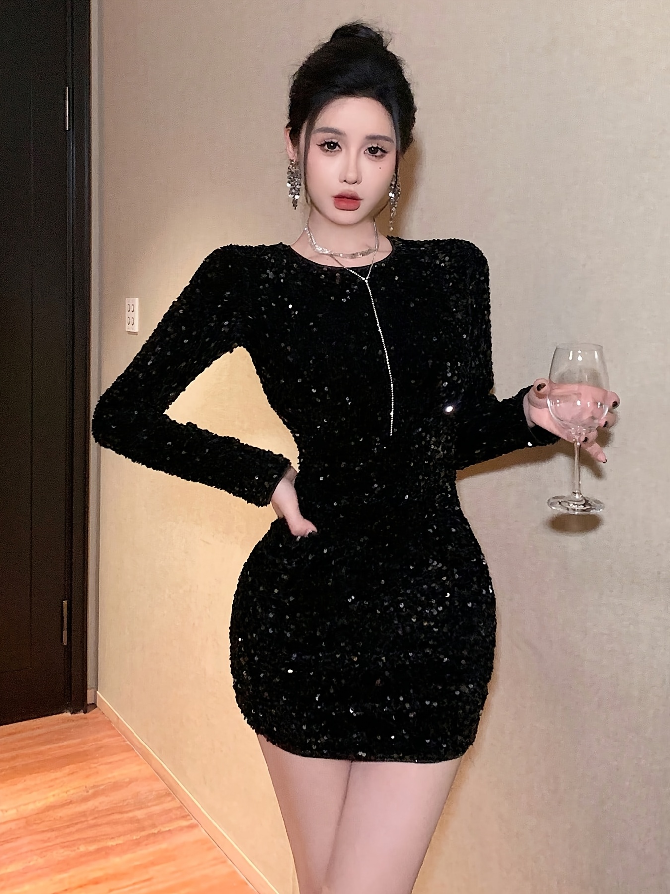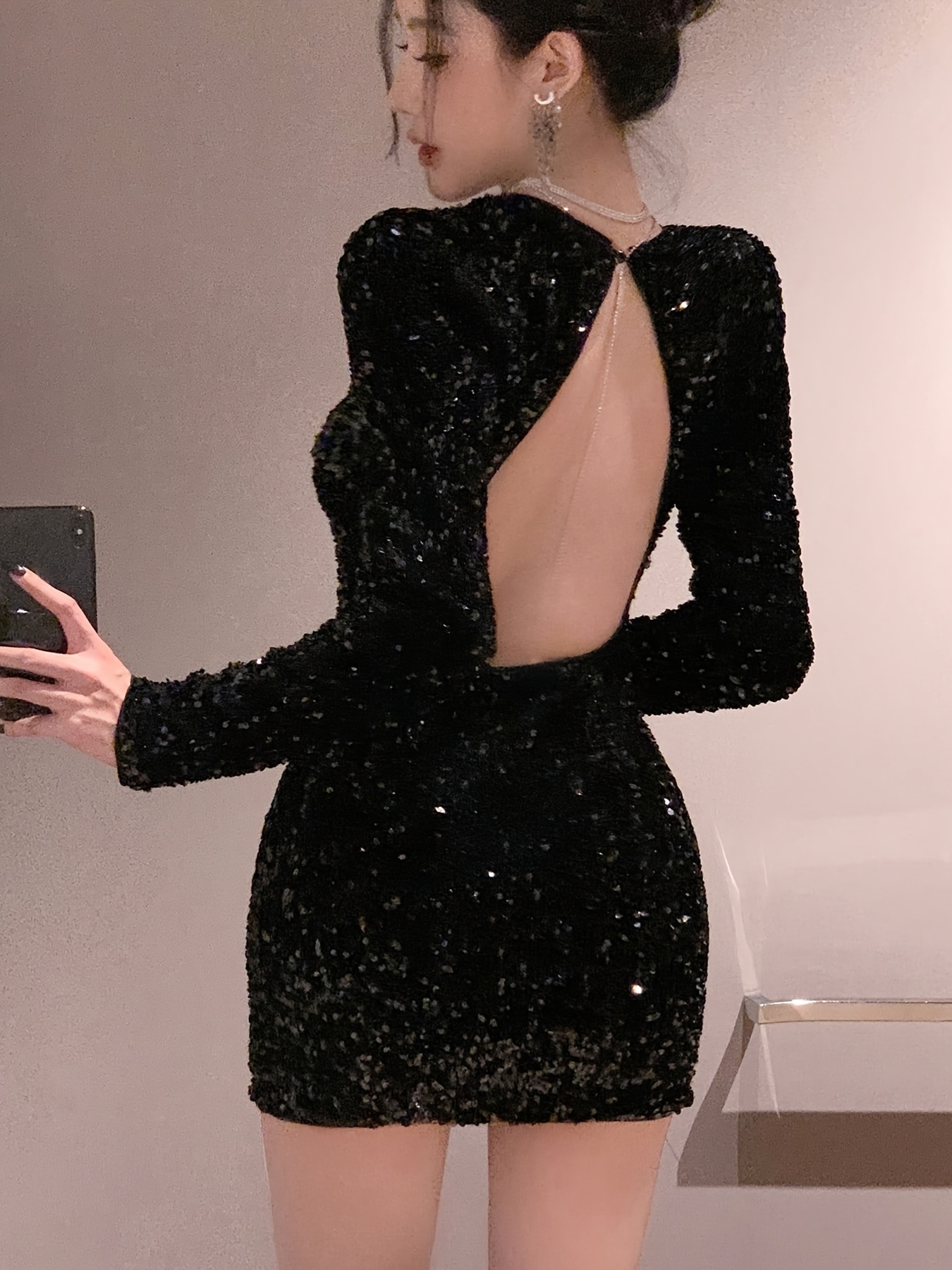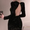 Robe mini élégante à manches longues et paillettes pour femmes – Robe moulante sexy dos nu