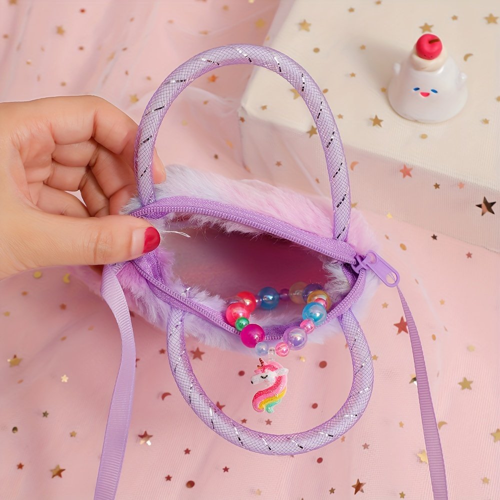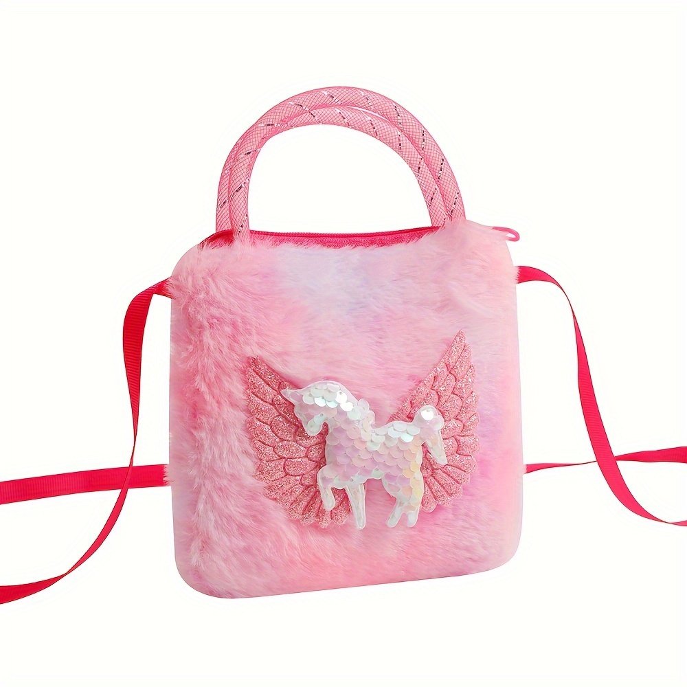 Sac à main peluche licorne à paillettes – Porte-monnaie en fausse fourrure cartoon – Sac à main doux arc-en-ciel pour femmes