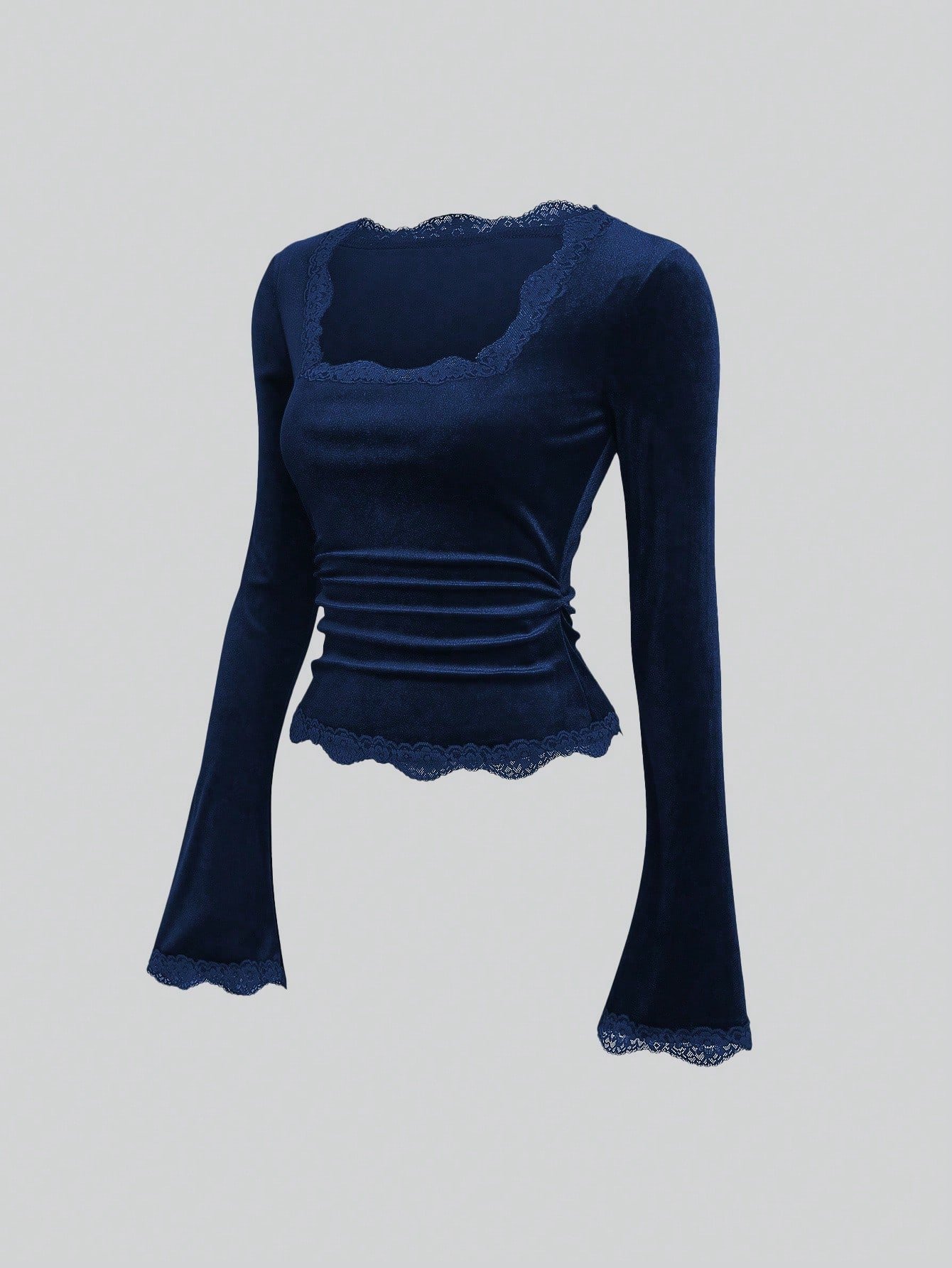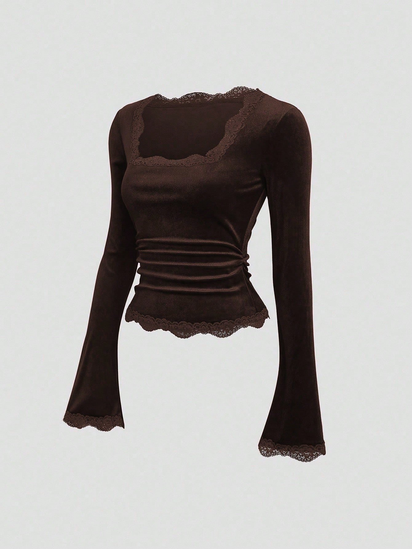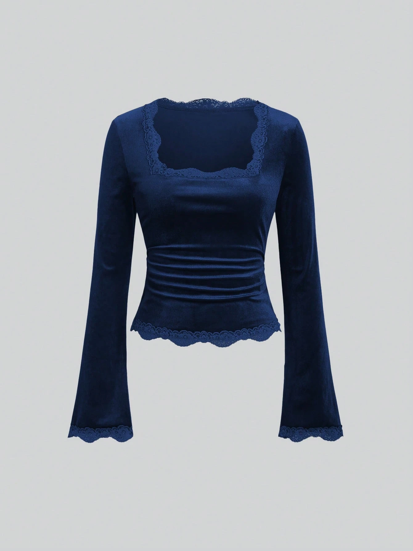 Sweetra Chemise femme à manches évasées et col en dentelle, style vintage français