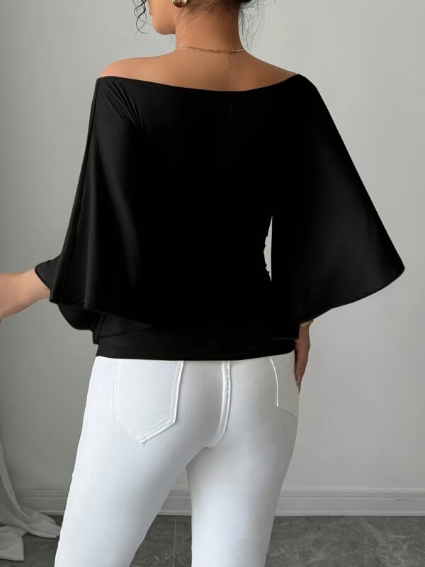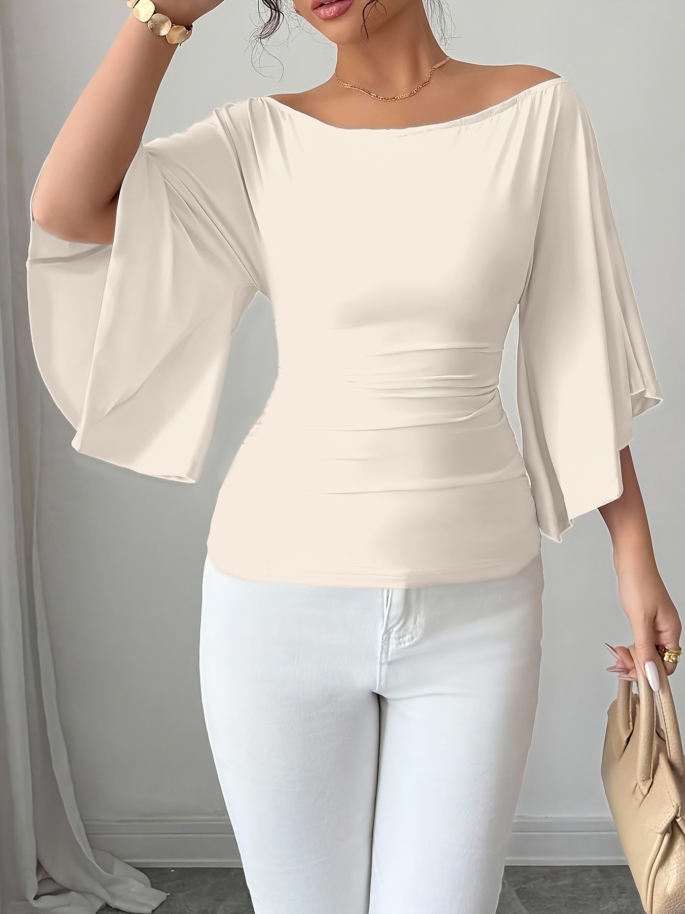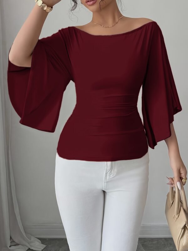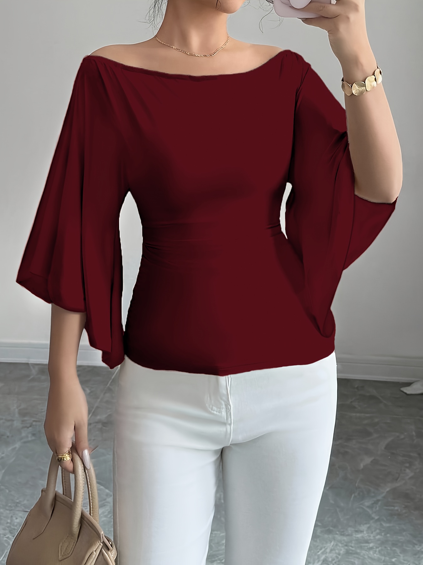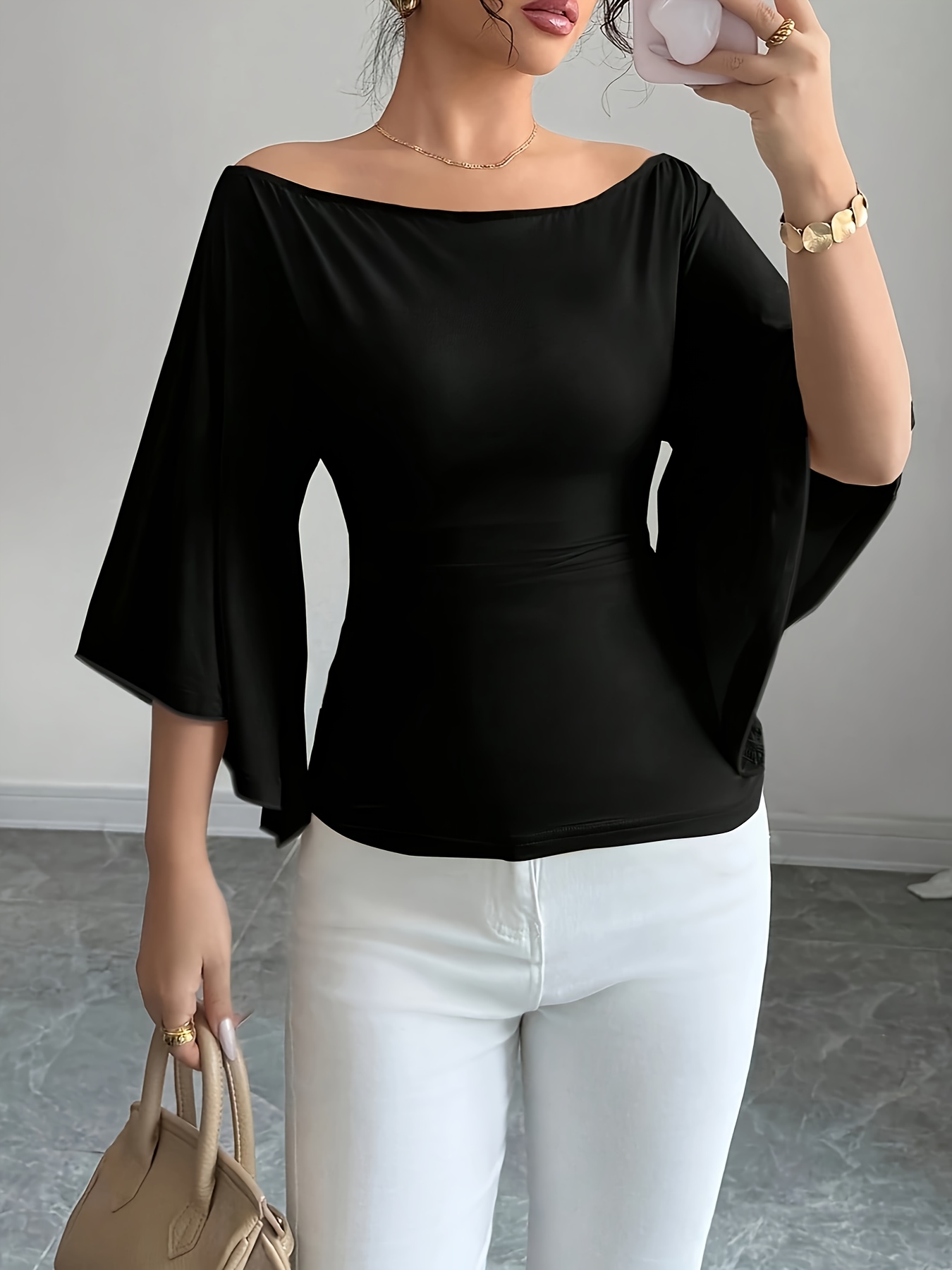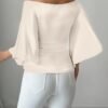 T-shirt Élégant à Épaules Dénudées, Manches Évasées et Haute Élasticité, Couleur Unie pour Femmes, Style Européen et Américain
