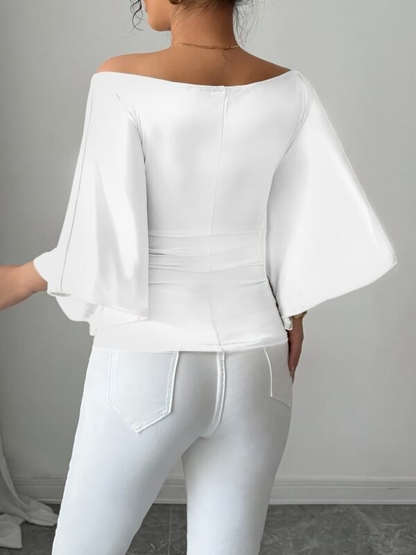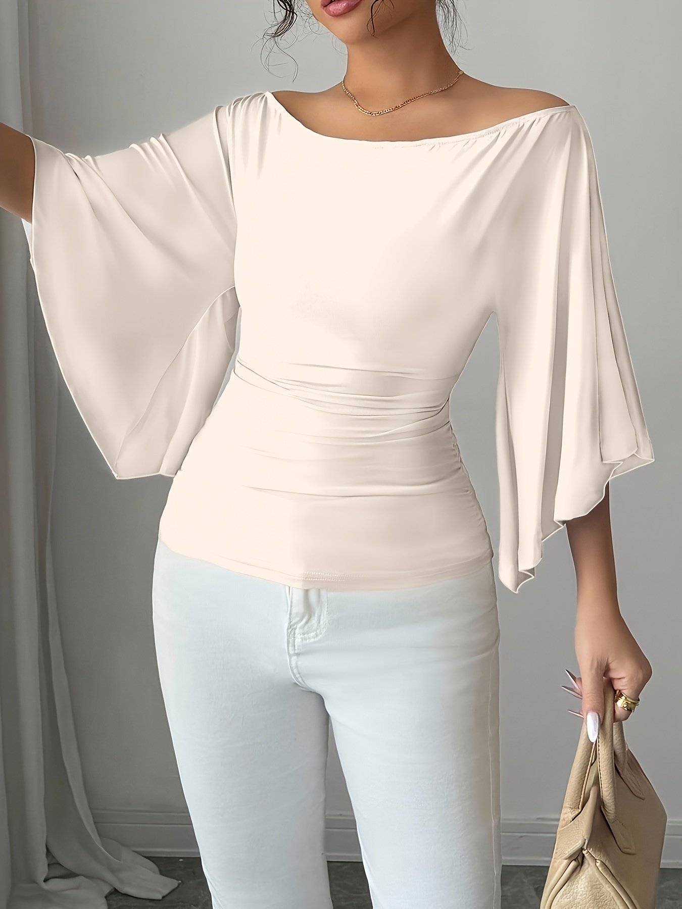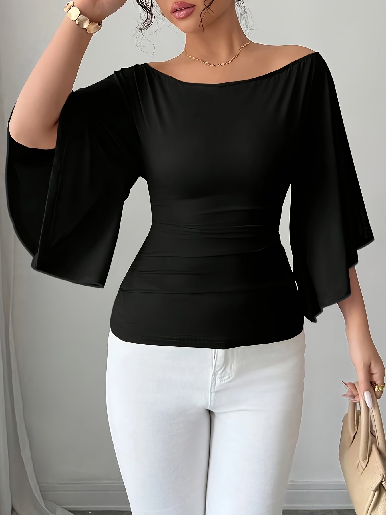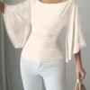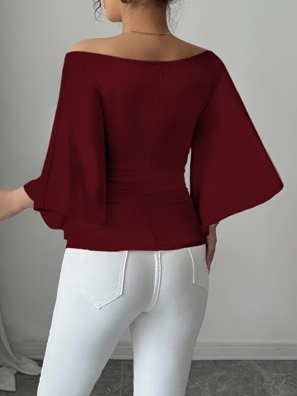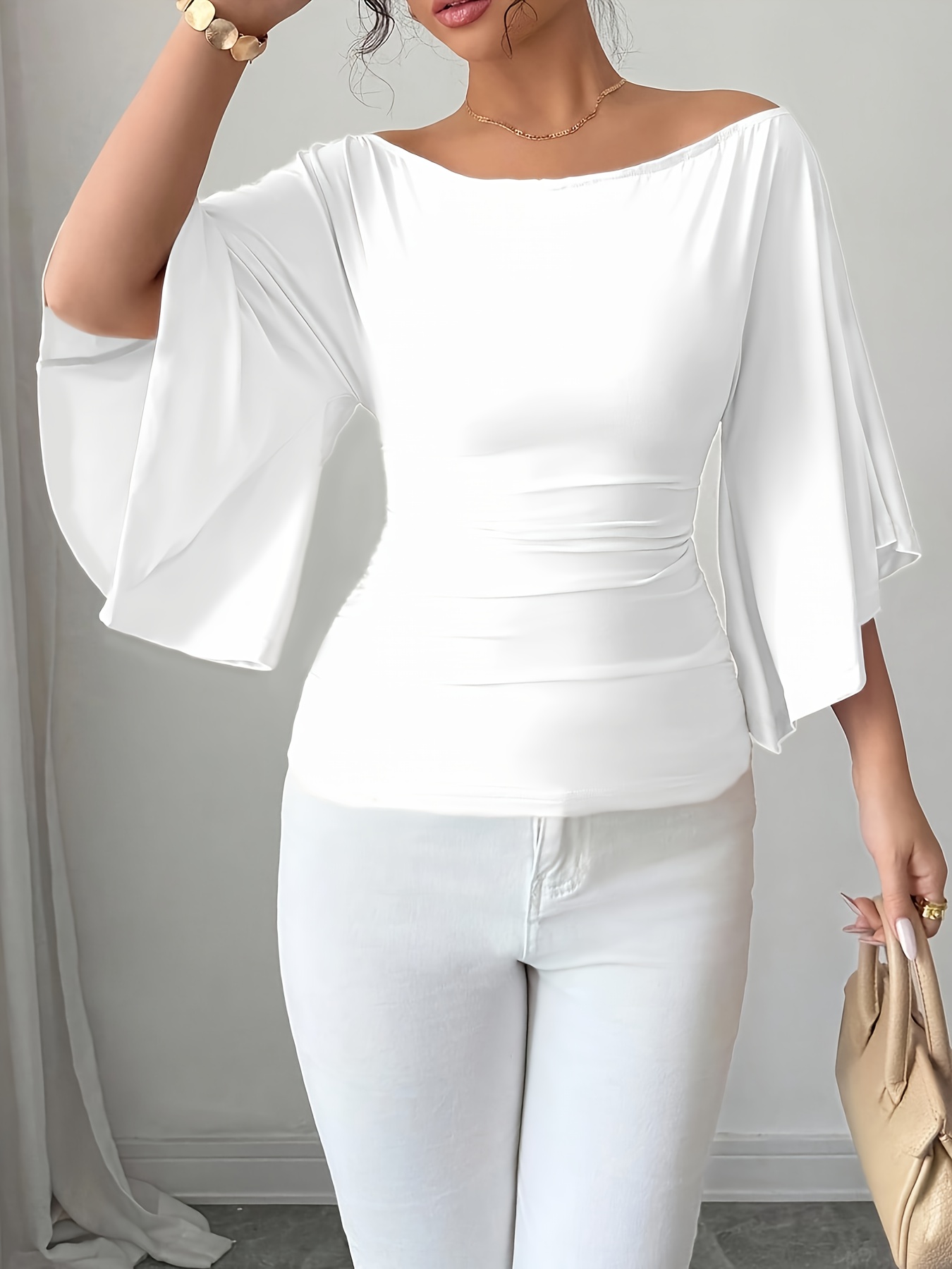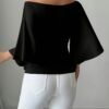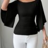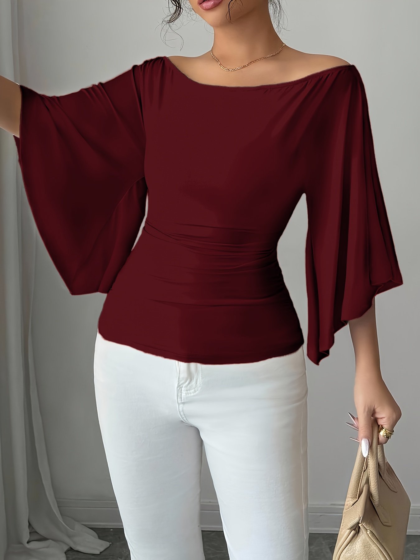 T-shirt Élégant à Épaules Dénudées, Manches Évasées et Haute Élasticité, Couleur Unie pour Femmes, Style Européen et Américain