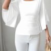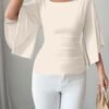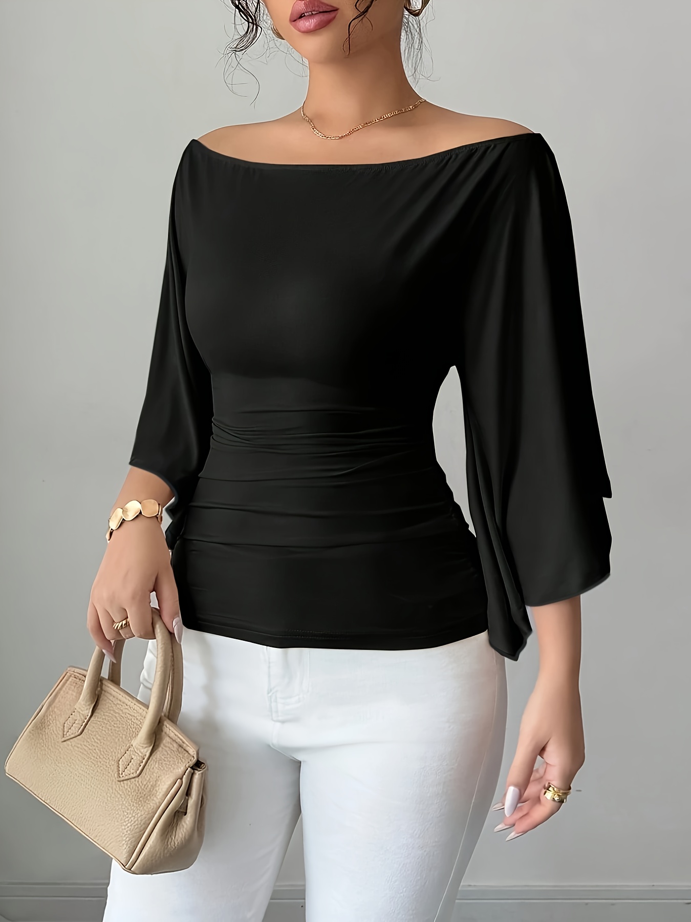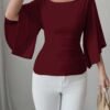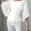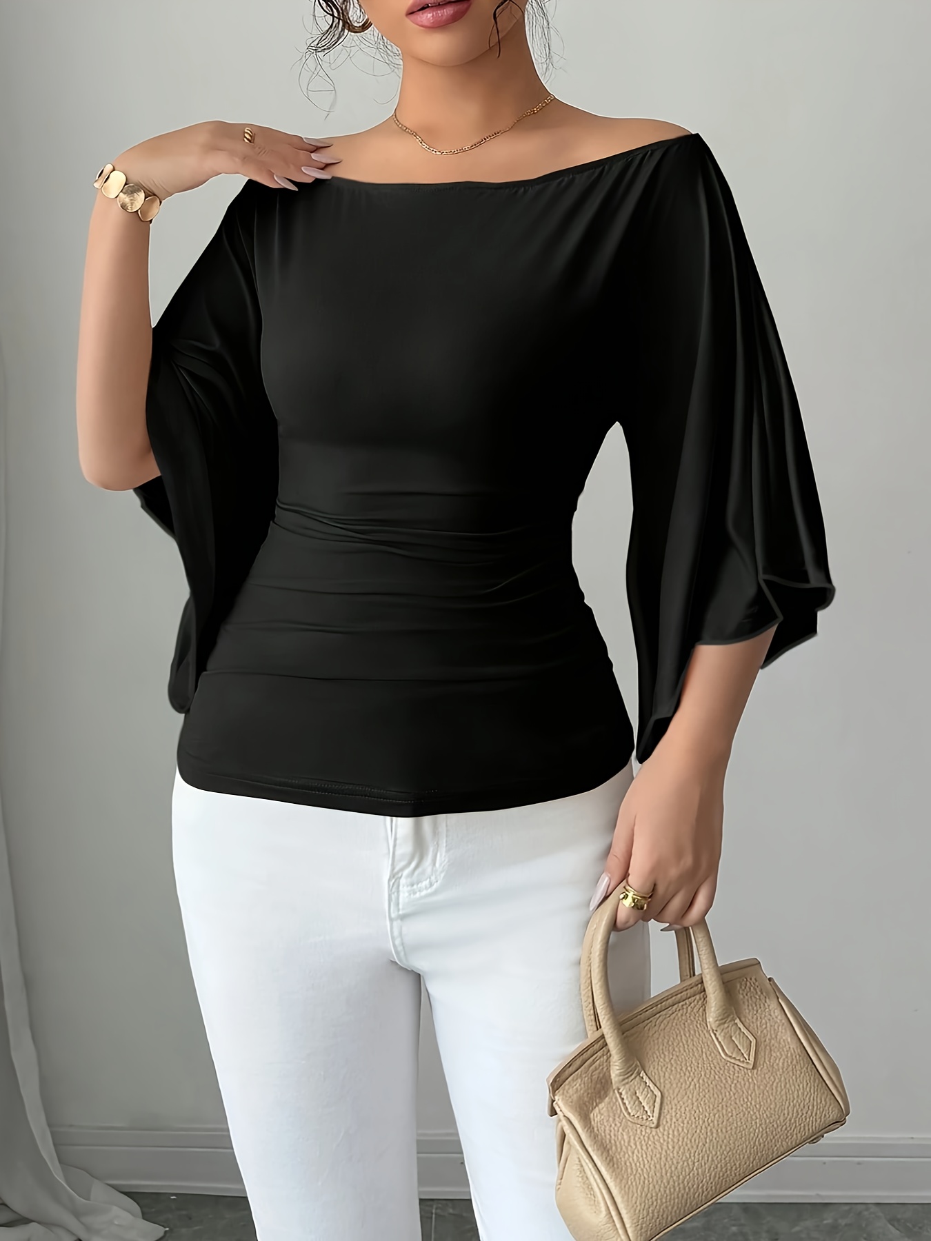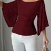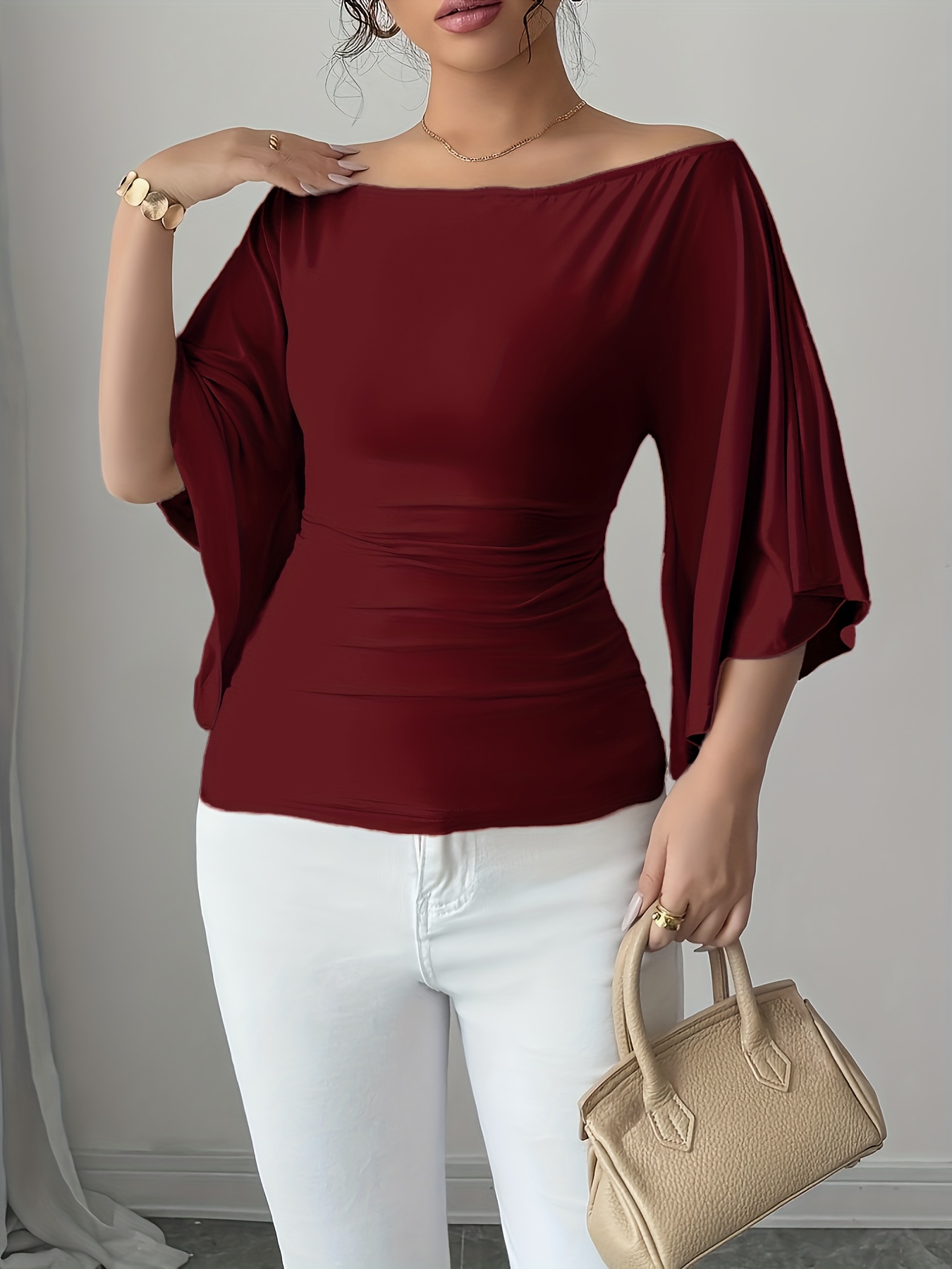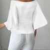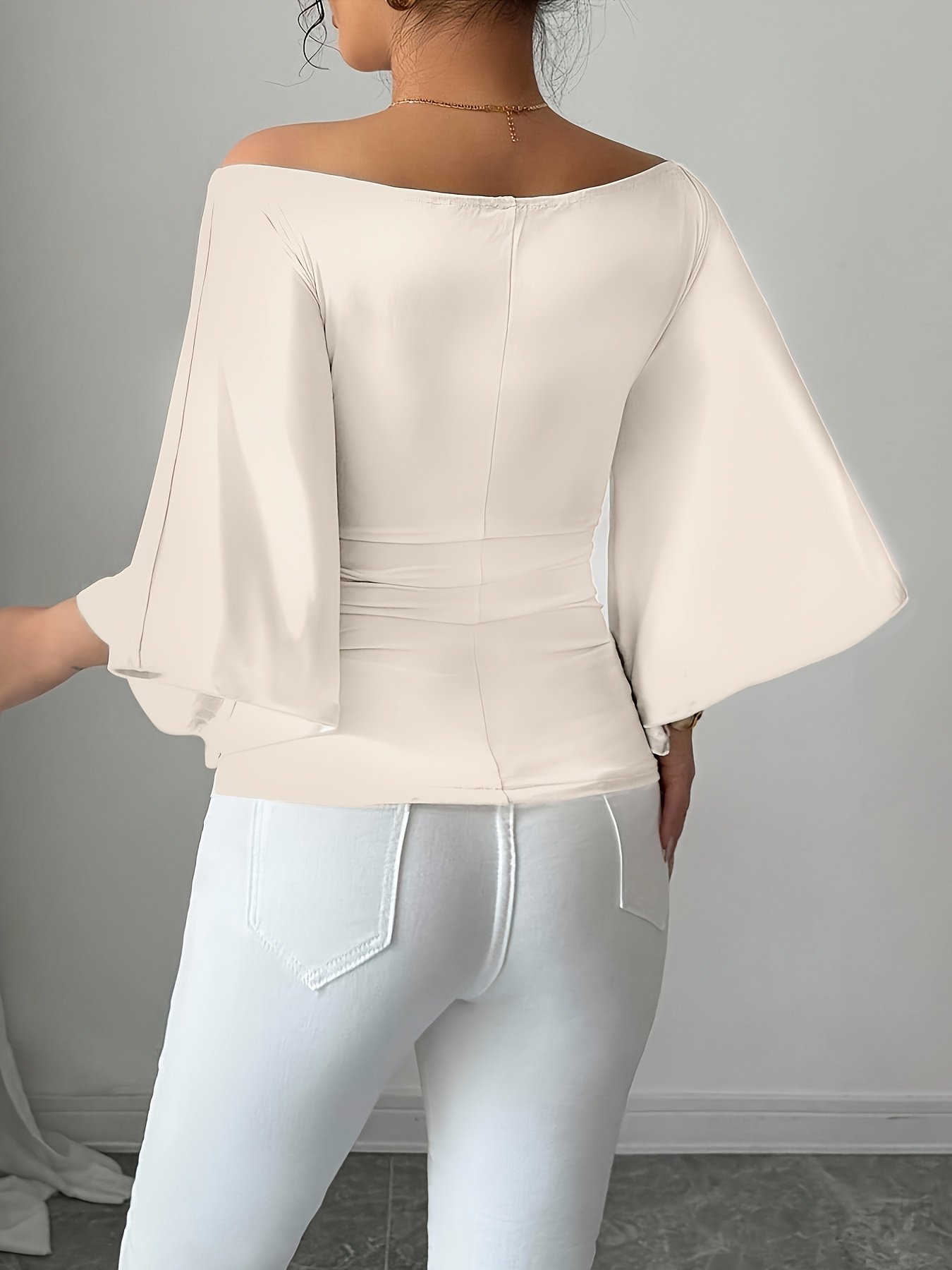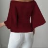 T-shirt Élégant à Épaules Dénudées, Manches Évasées et Haute Élasticité, Couleur Unie pour Femmes, Style Européen et Américain