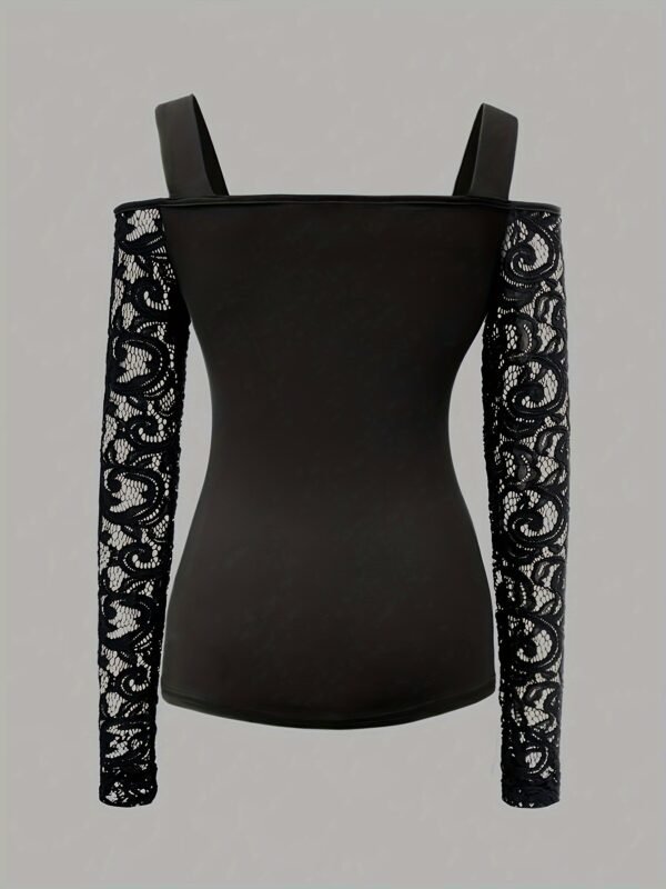 T-Shirt Femme à Manches Longues en Dentelle Contrastante et Épaules Dénudées