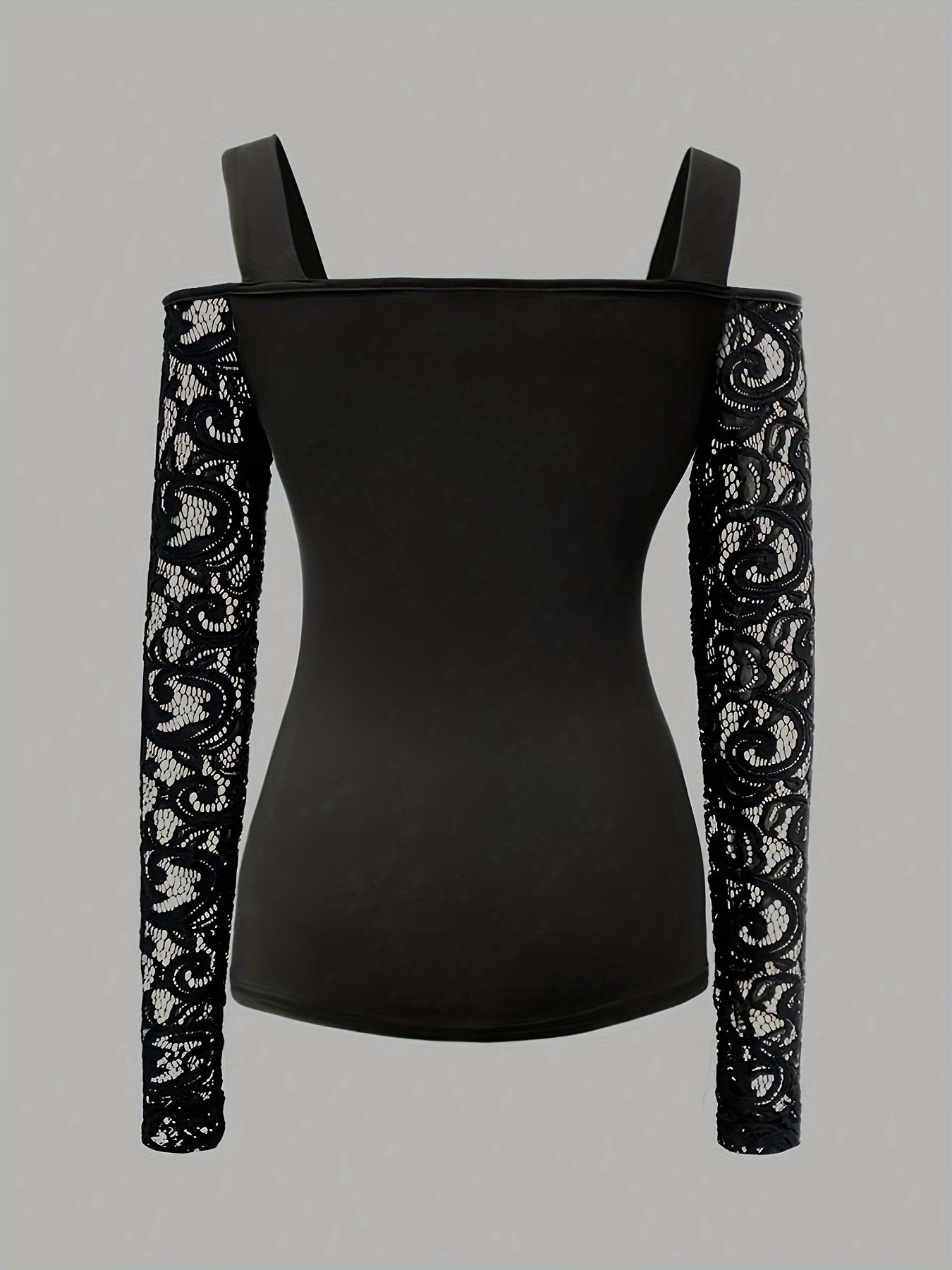 T-Shirt Femme à Manches Longues en Dentelle Contrastante et Épaules Dénudées, Couleur Unie, Toutes Saisons, Pièce de Superposition,Vêtements Décontractés,Style Féminin,Design Épaules Dénudées,Confortable à porter,Tissu Respirant,Blouse Élégante,T-shirt Tendance,Amoureux de la Mode,Décontracté de