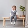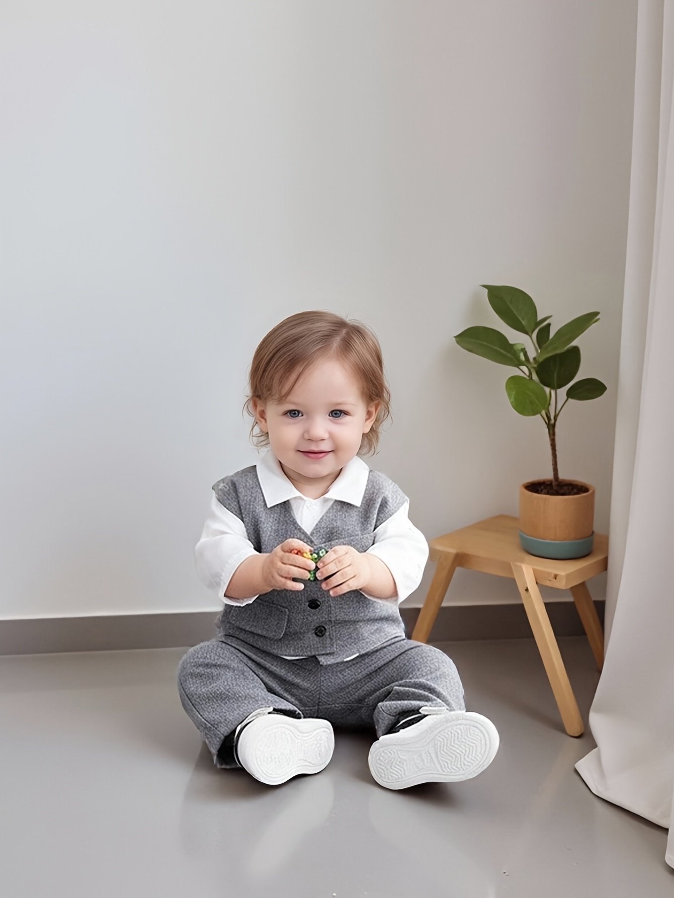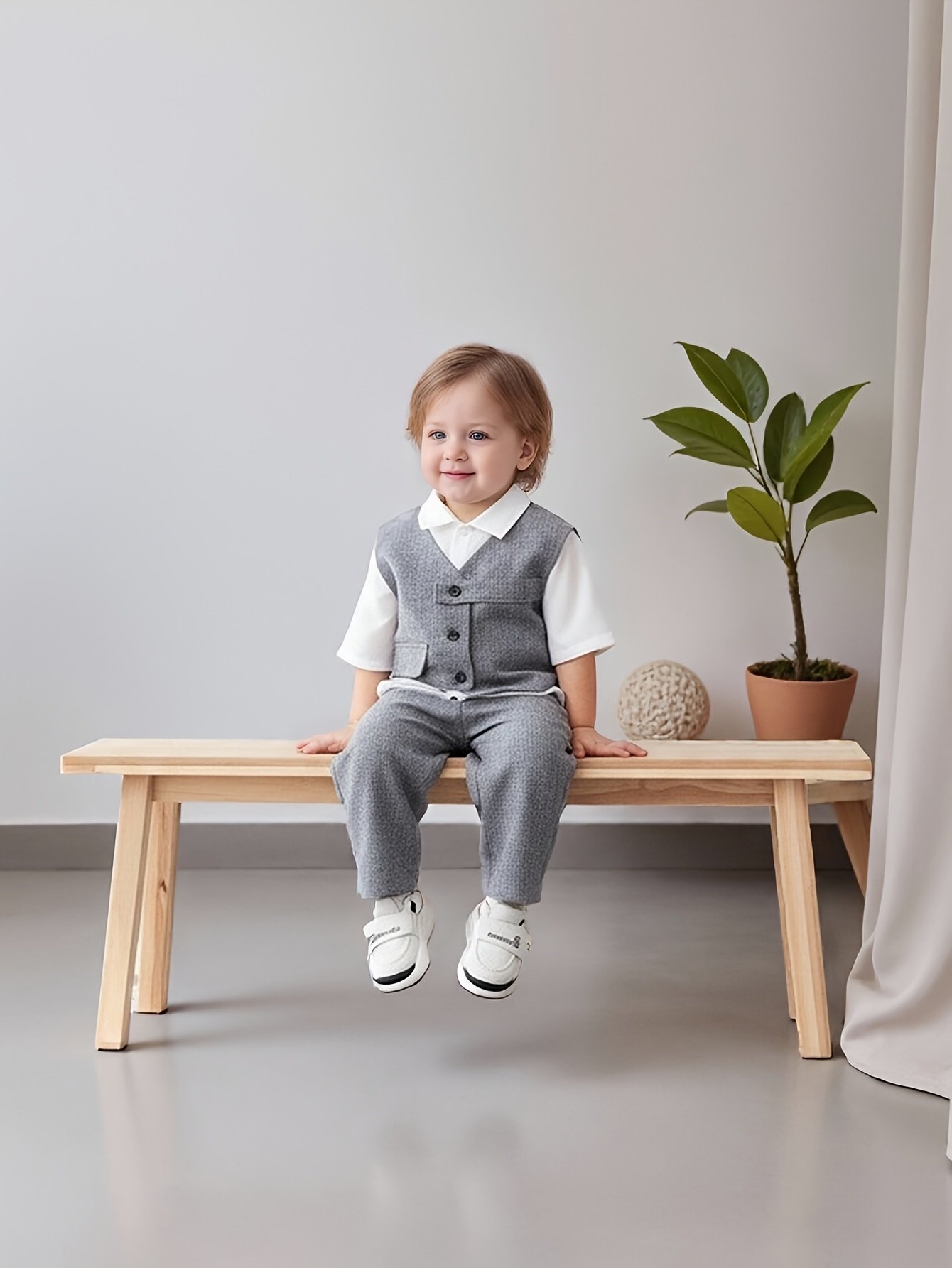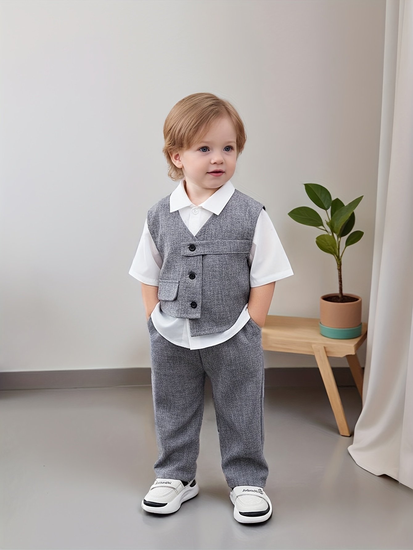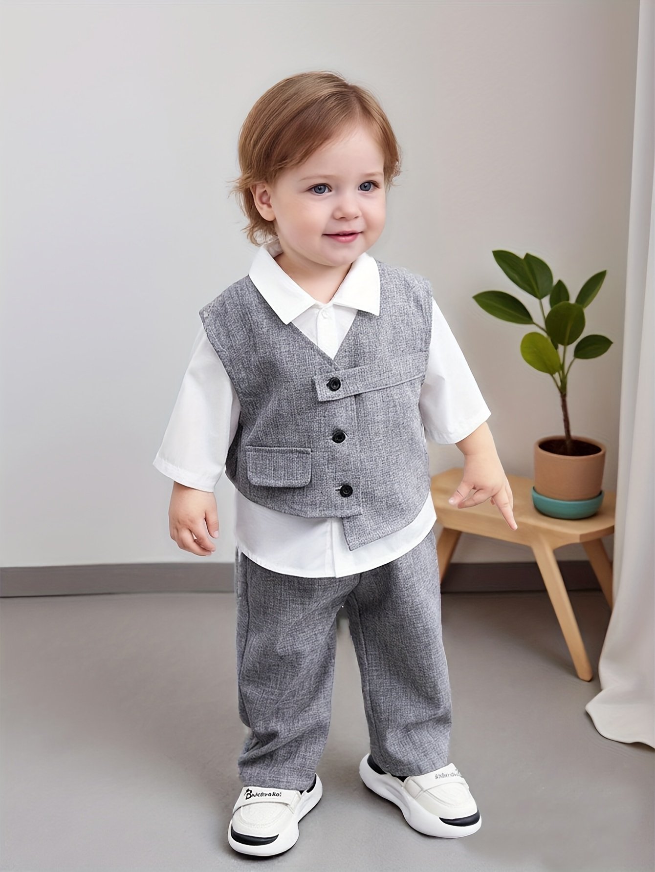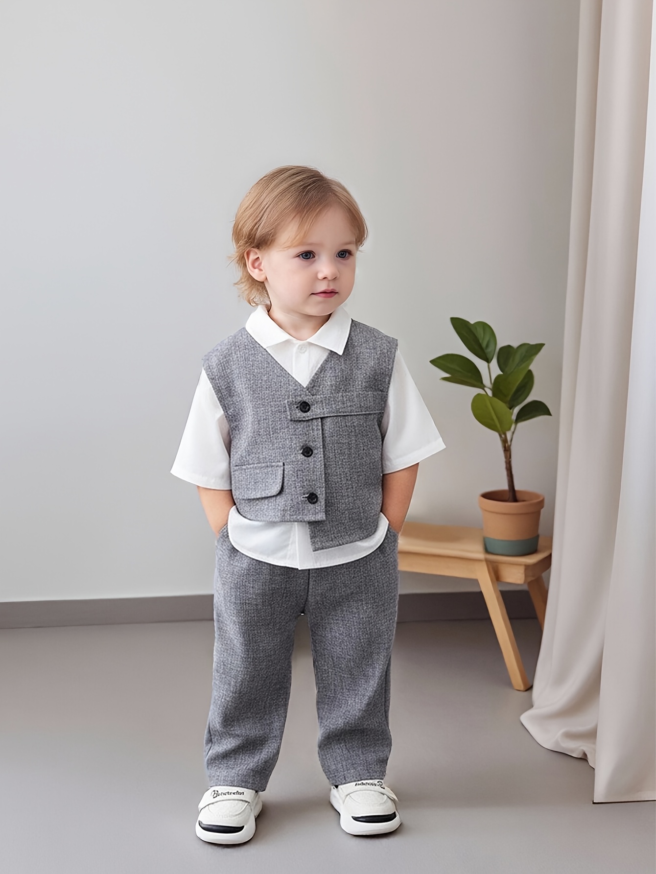 Tenue de Gentleman pour Bébés Garçons : Chemise Blanche, Gilet Gris Irrégulier et Pantalon Long Gris