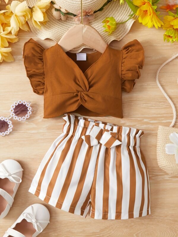 Tenue d’été – Haut sans manches à rayures brunes et blanches avec détail nœud torsadé et short à nœud