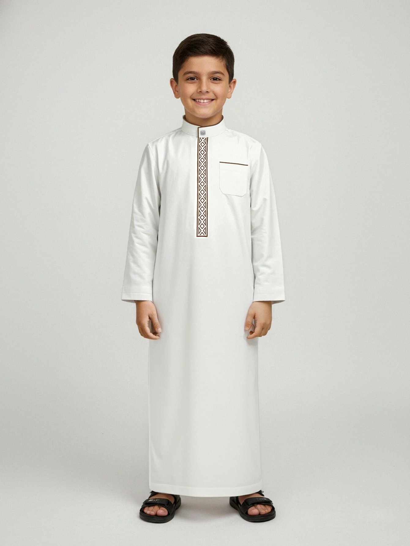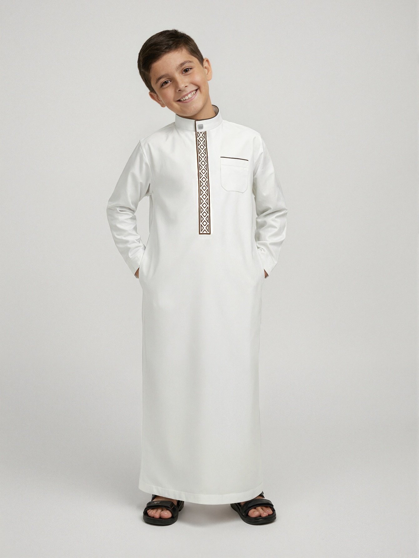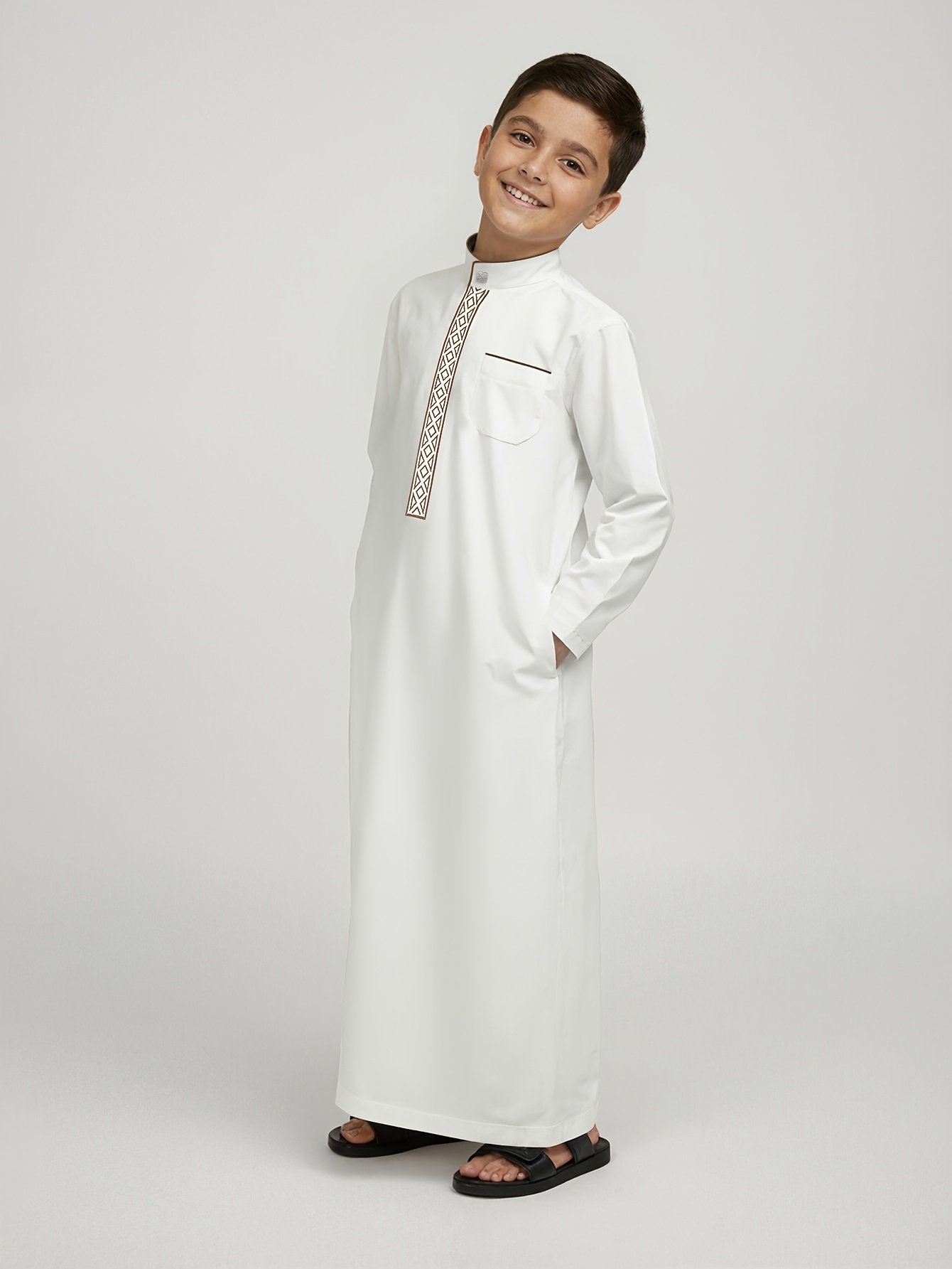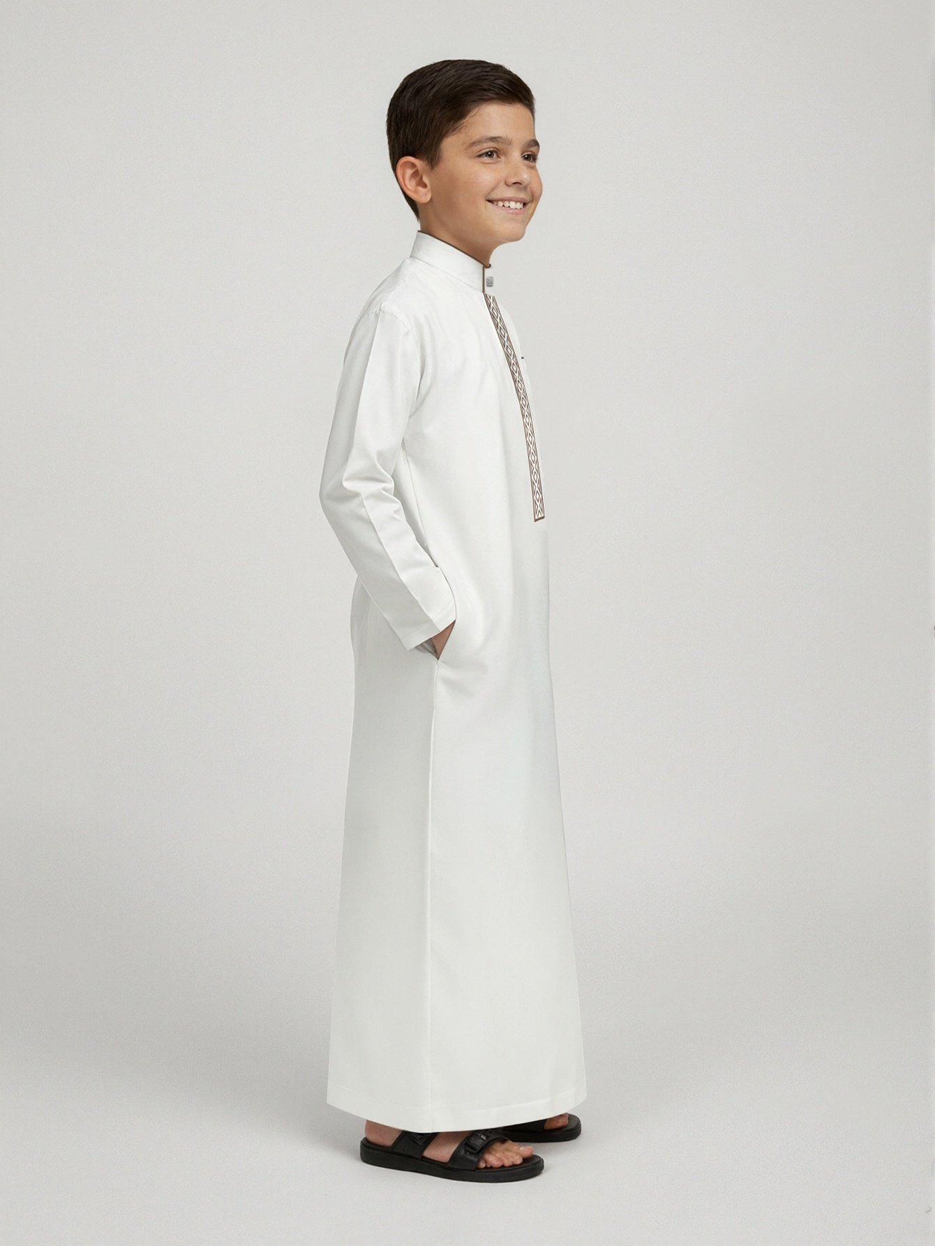 Tenue traditionnelle blanche pour garçons musulmans du Moyen-Orient avec broderies, col montant et boutons carrés, manches longues avec poches latérales | Vêtement durable pour les célébrations du Ramadan Aïd al-Fitr/Aïd al-Adha, un excellent cadeau pou