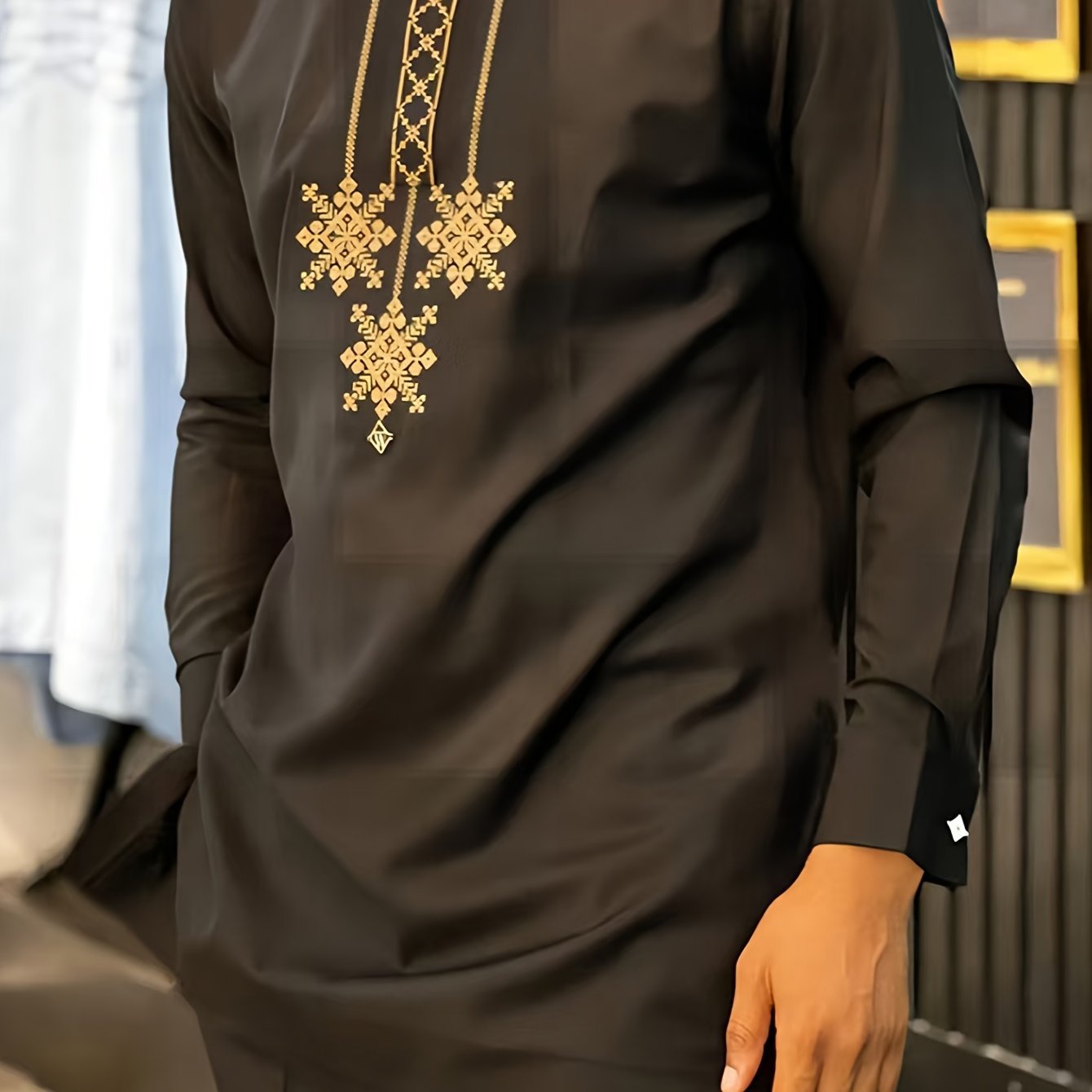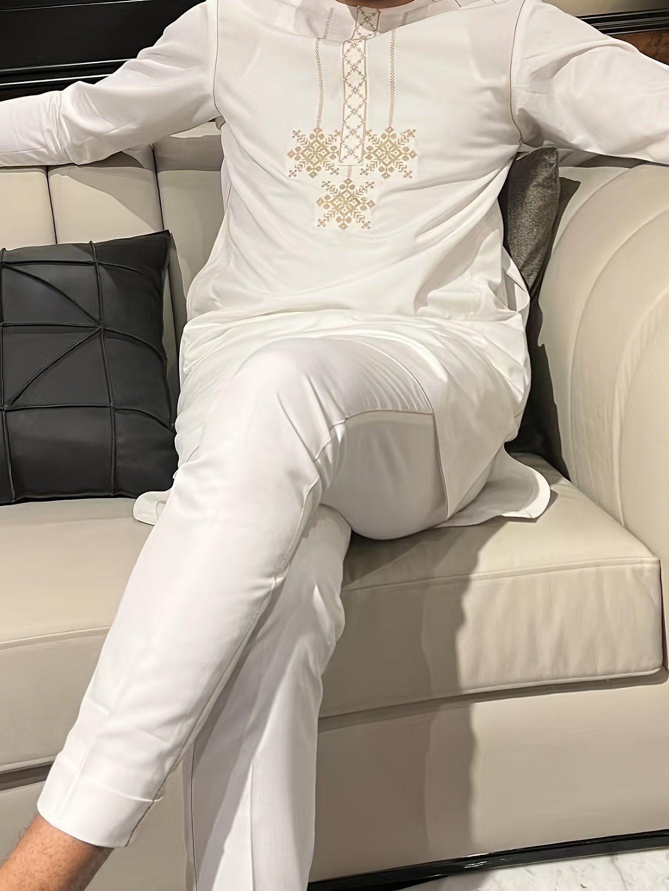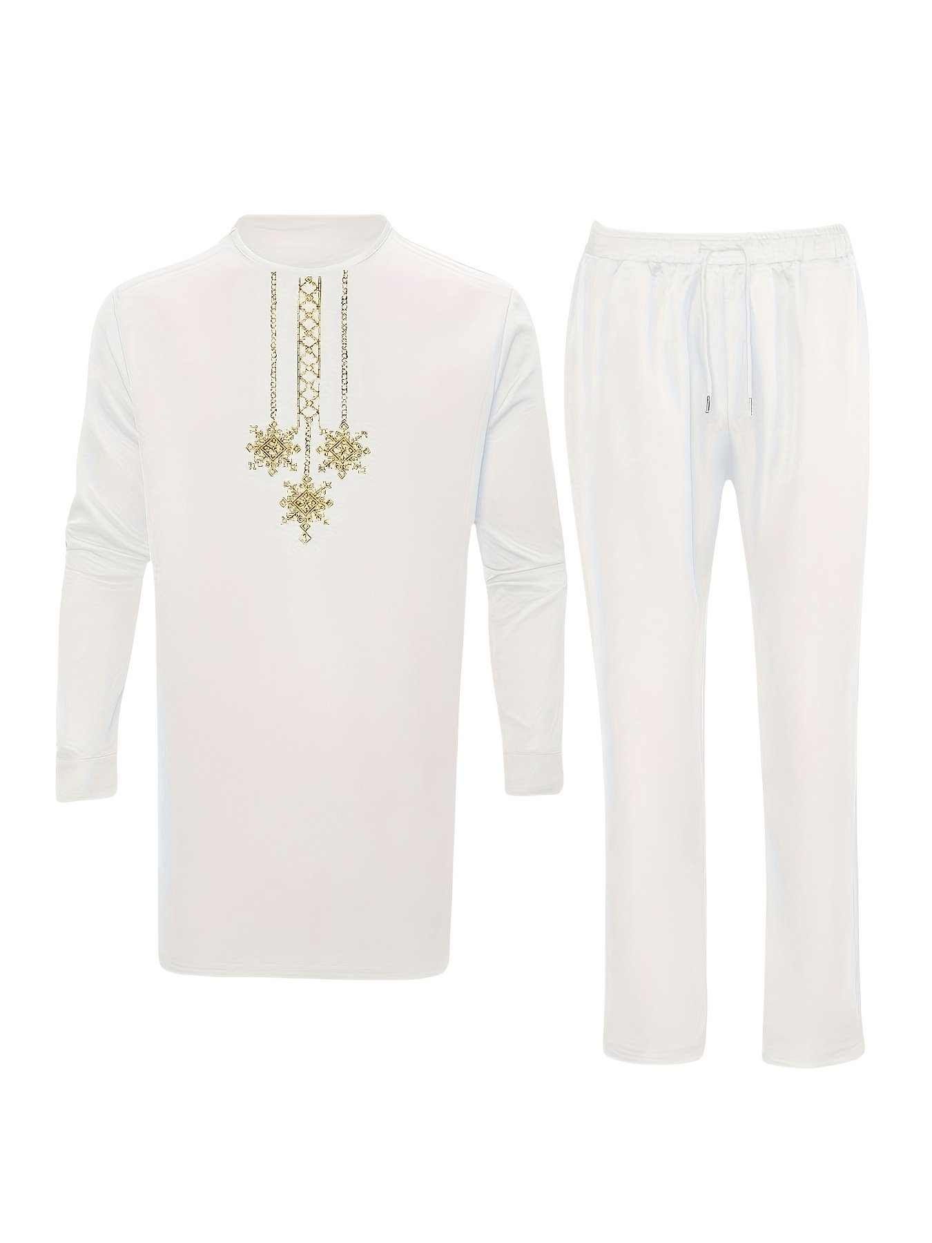 Tenue traditionnelle pour hommes en 2 pièces – Robe à manches longues à motif géométrique et pantalon uni – Tenue formelle à col rond – Lavable en machine