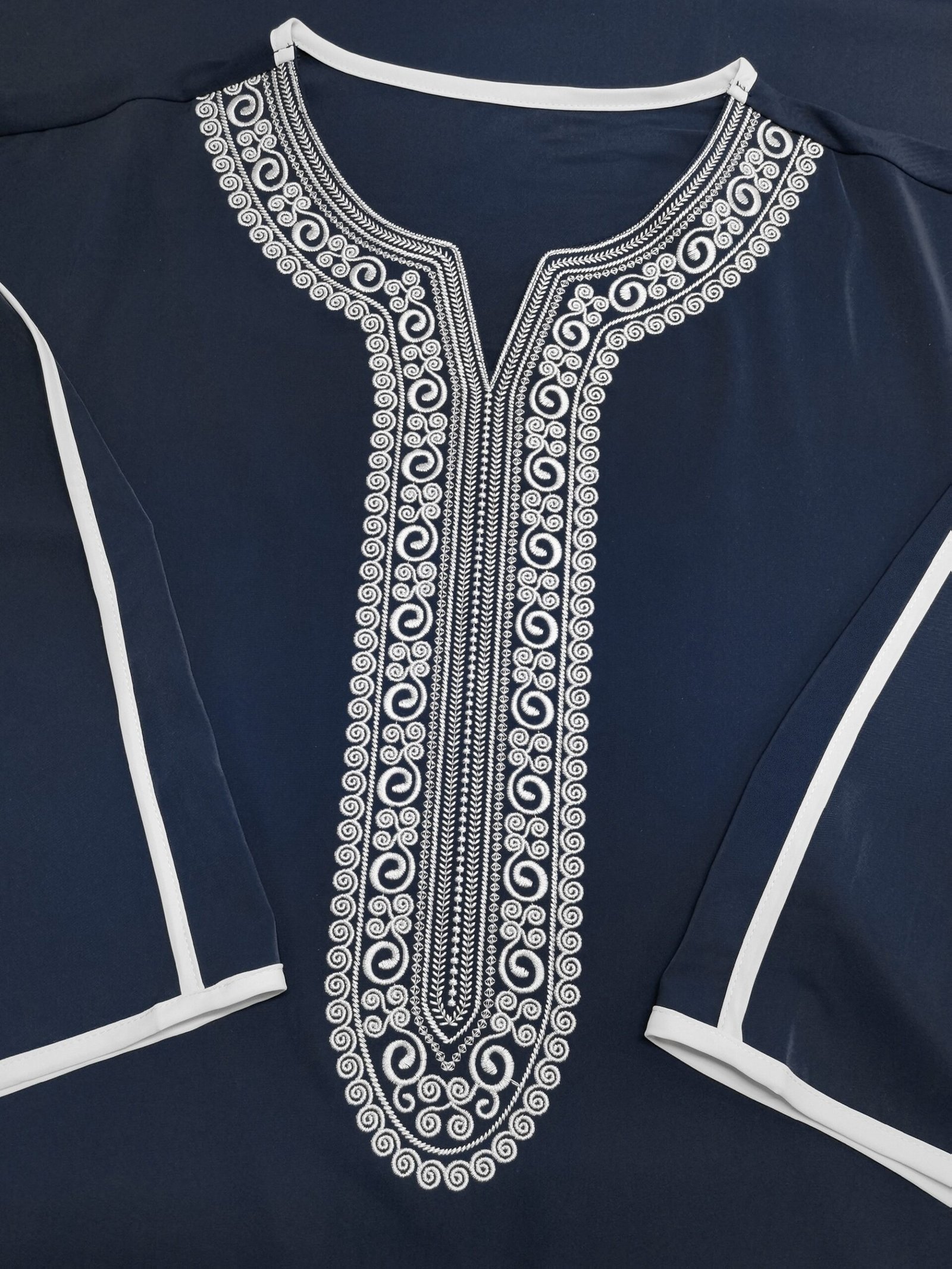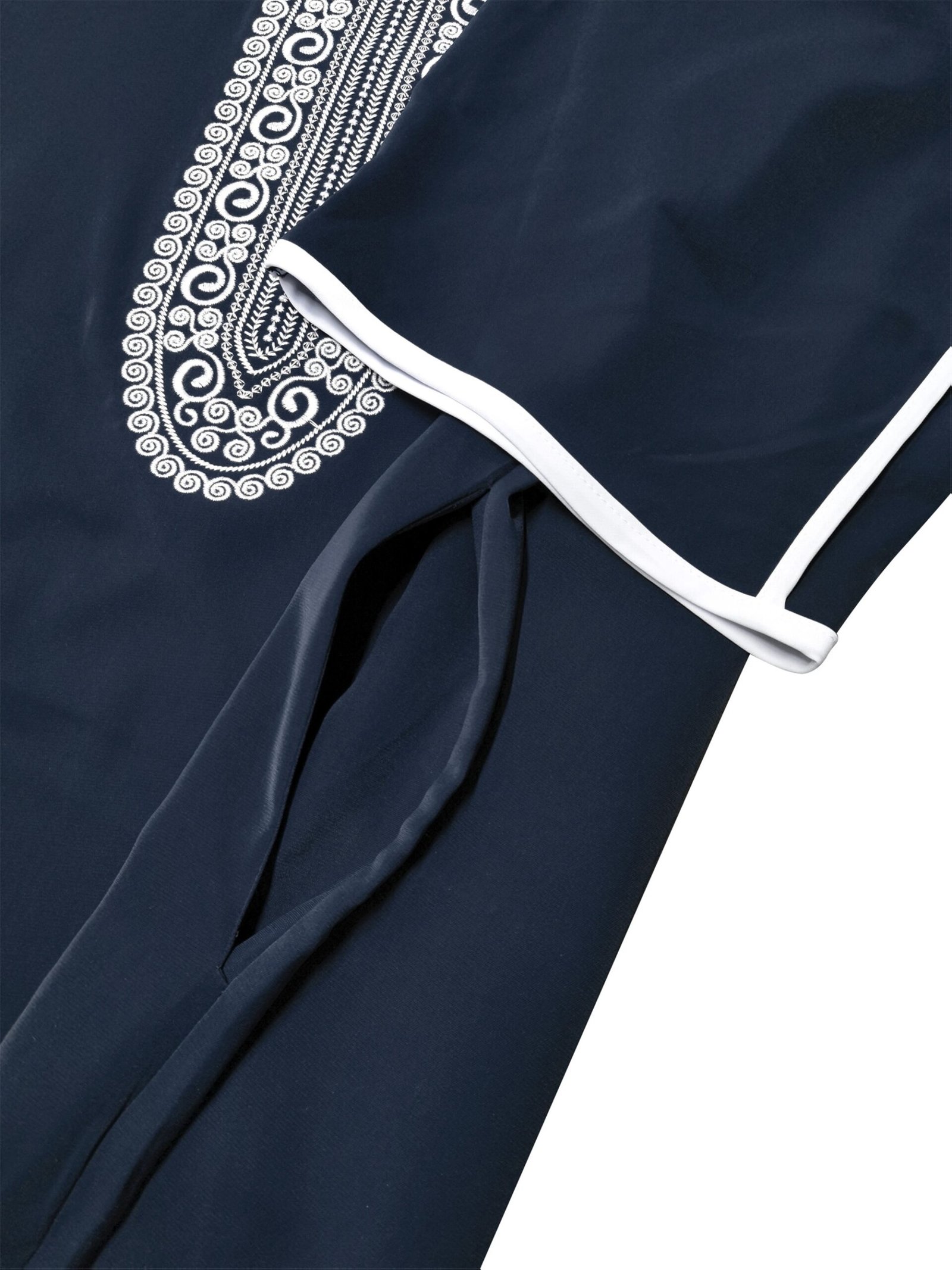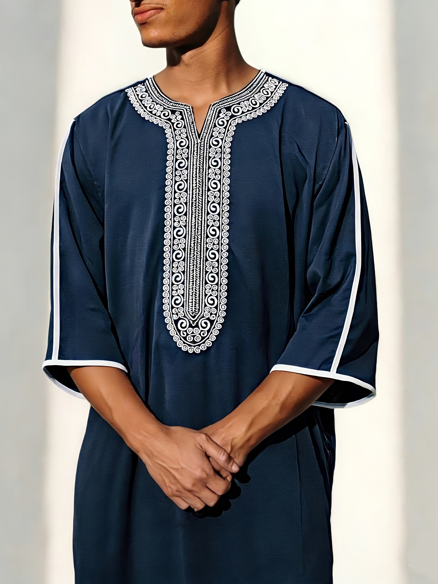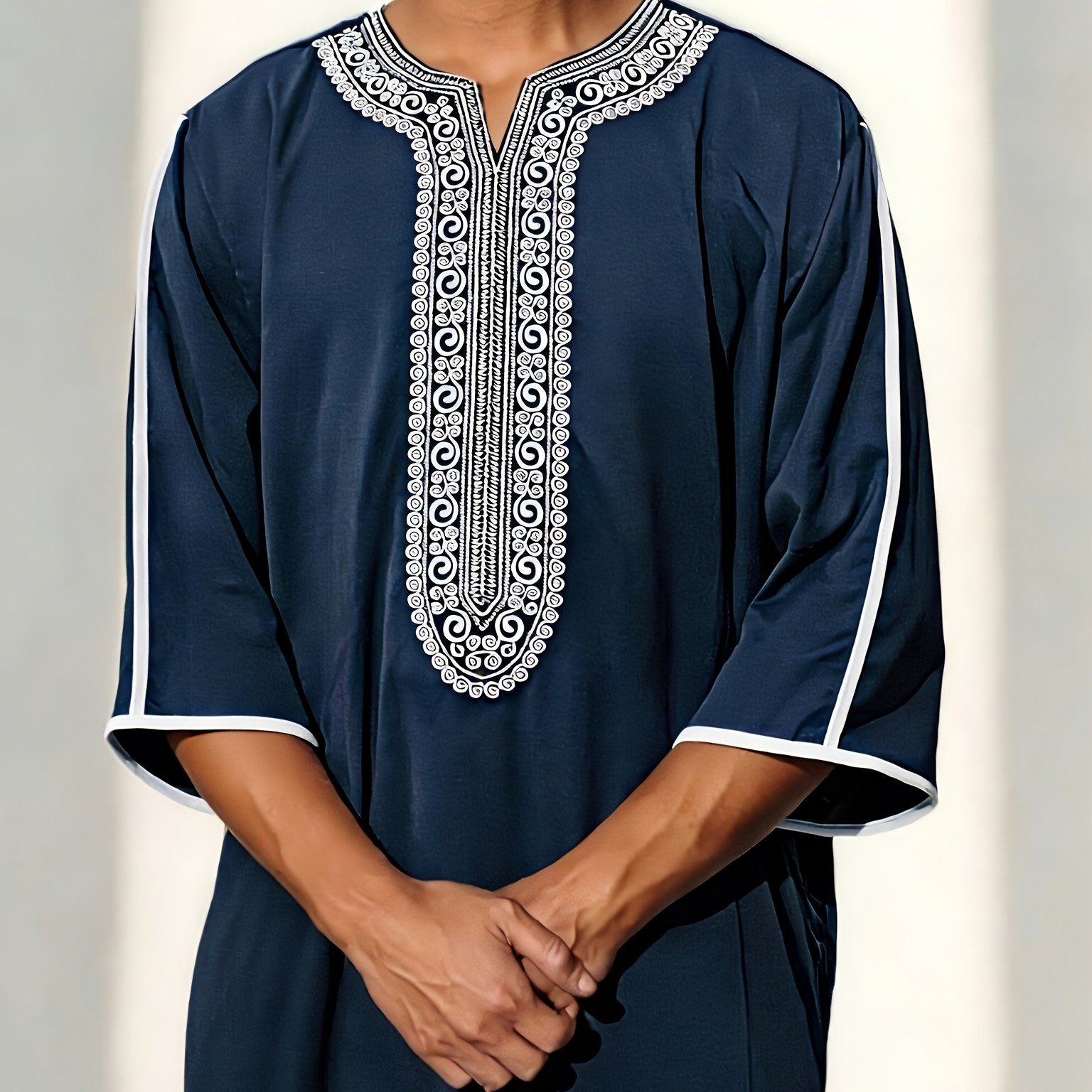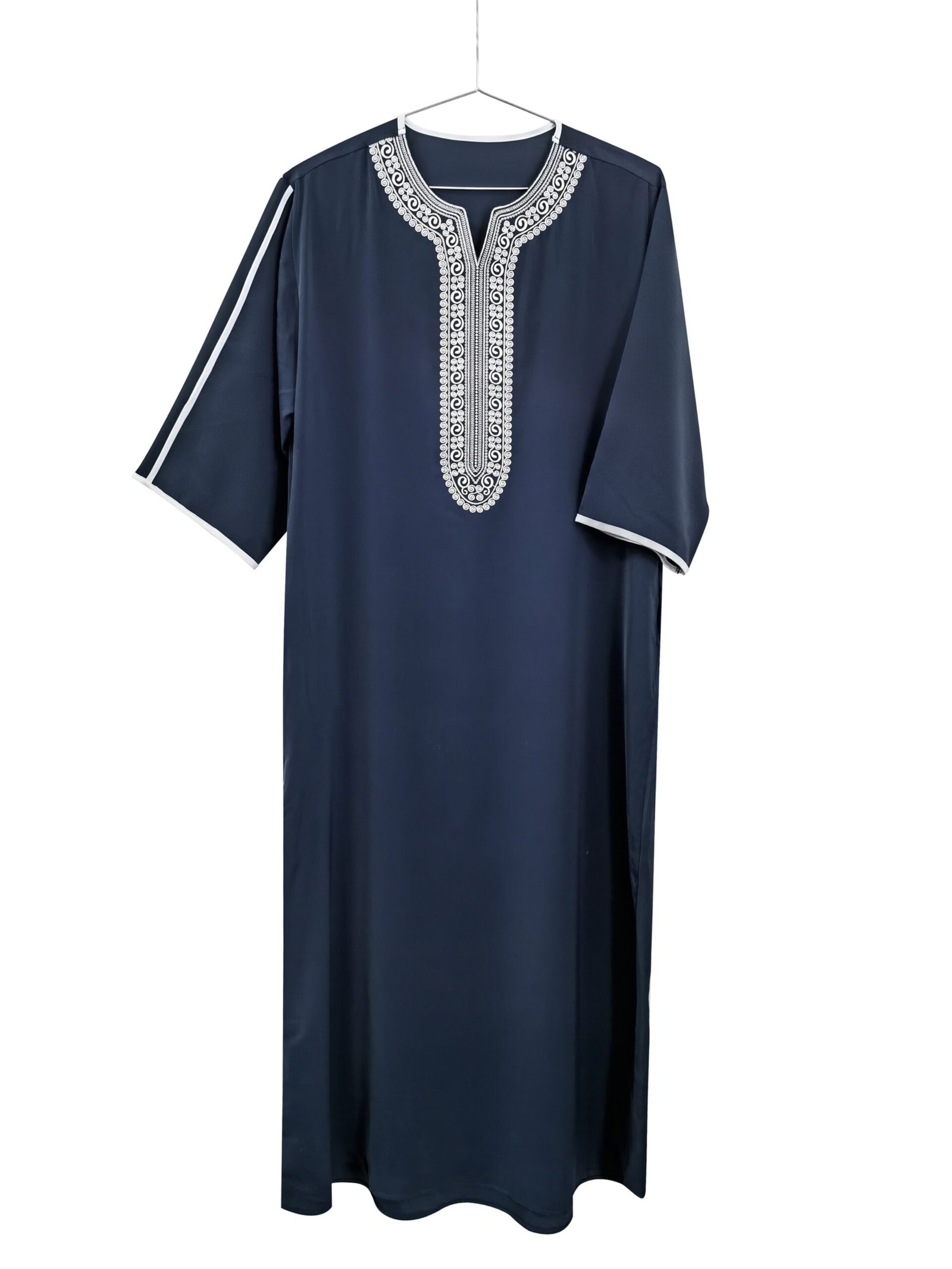 Thobes Marocains Décontractés pour Hommes | Robes Brodées Traditionnelles de Ramadan, Couleur Unie avec Col en V, Manches Standard, Tissu Non Extensible