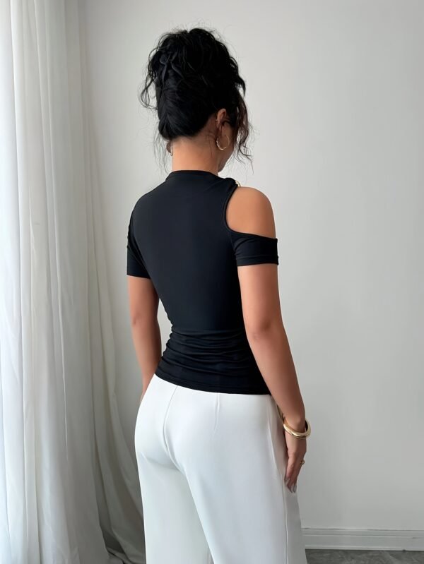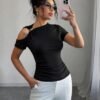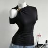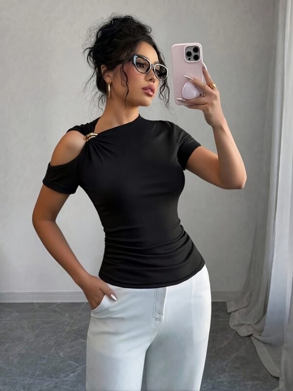 Top féminin ajusté à manches courtes avec nœud avant et détail de boucle métallique
