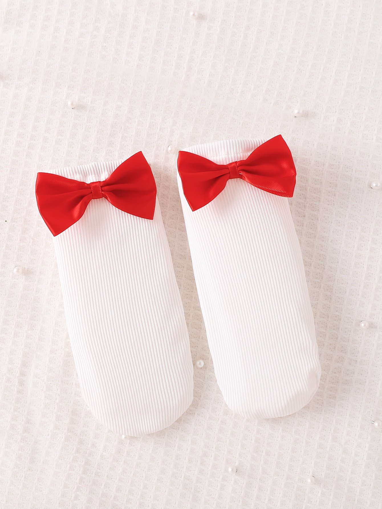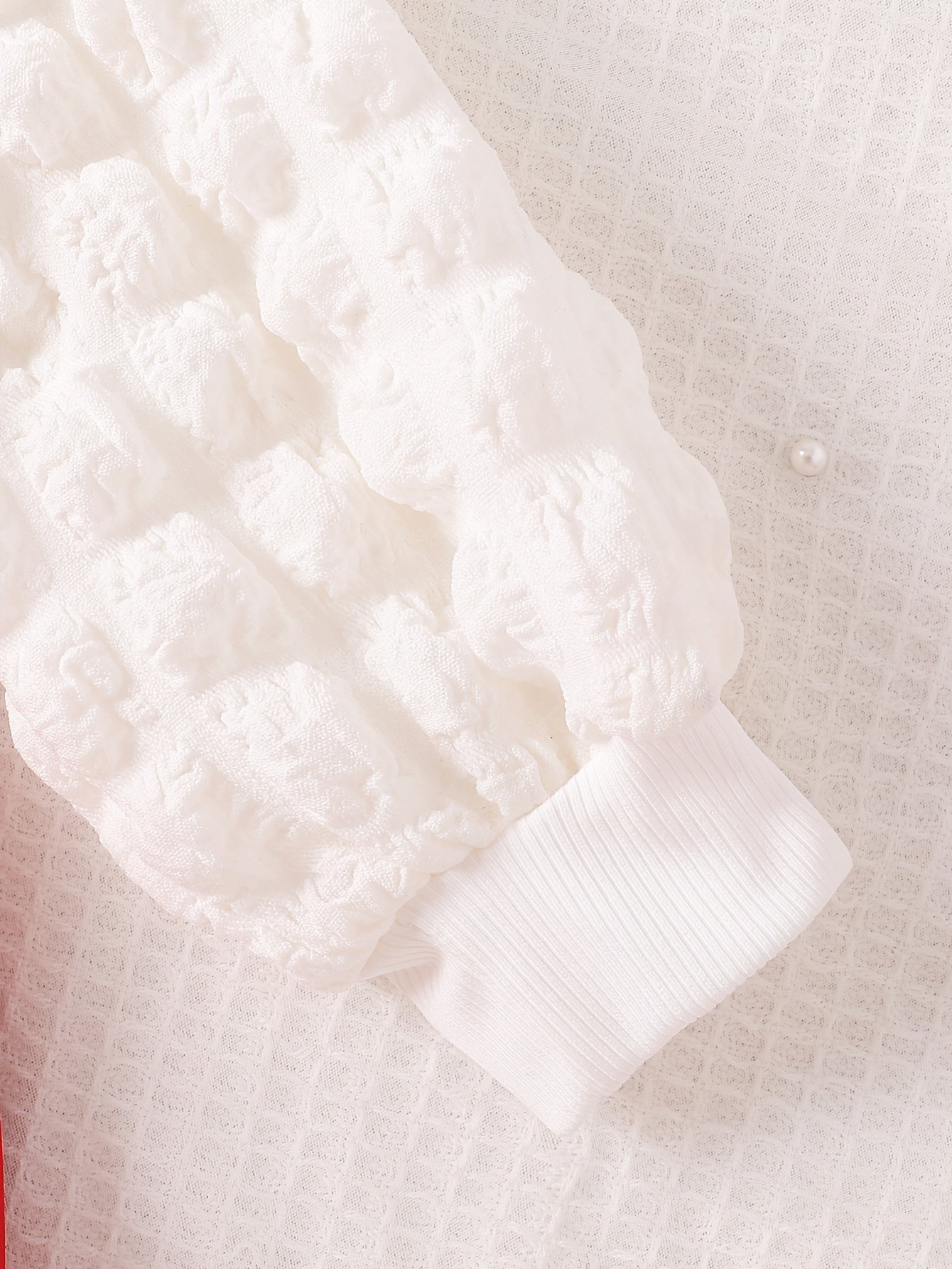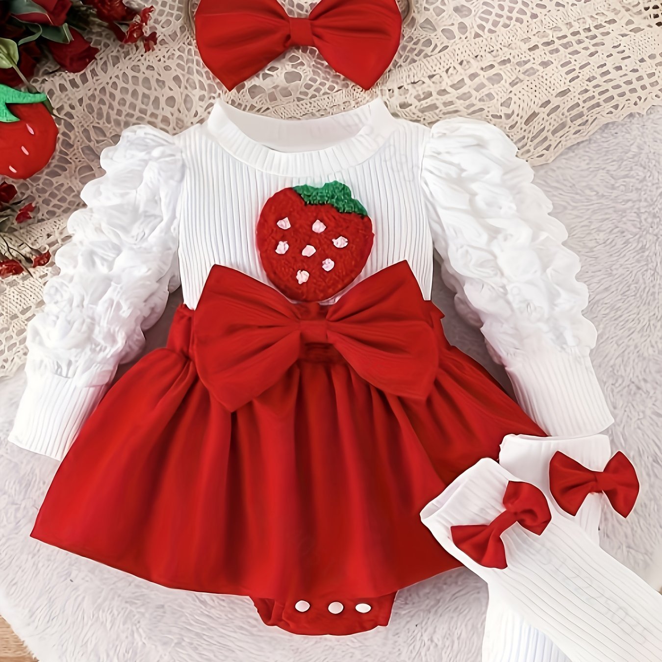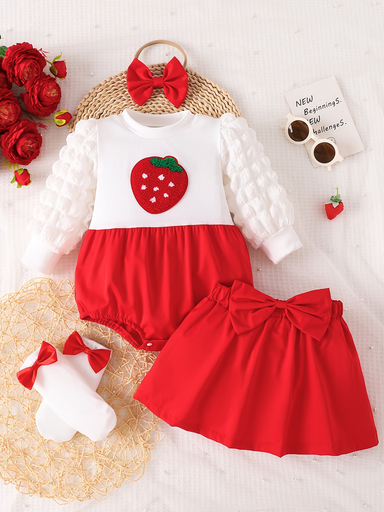 Un ensemble de deux articles comprenant un body blanc à manches longues et une jupe à nœud rouge pour bébés filles, parfait pour les tout-petits et orné de jolis motifs de dessins animés, pour l'extérieur.
